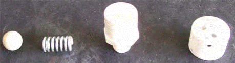 通过弹簧使球就位,让HHO流过,但如果压力突然增加,则球被向上推,打开了一条通往钻有许多孔的塑料配件的通道: