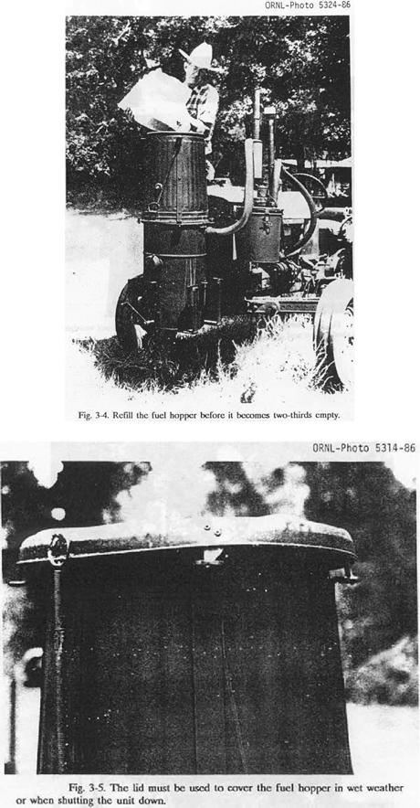 The outside of a gas generator housing drum may reach the same temperature as a catalytic converter on today's automobiles. Care should be taken when operating in areas where dry grass or combustible material can come into contact with the housing drum of the gas generator unit. If a gas generator unit is mounted on a personal car, bus, van or truck, a minimum 6-in. clearance must be maintained around the unit. Disposal of ashes must only be attempted after the unit has cooled down (to below 150oF). Such residue must be placed away from any combustible material and preferably be hosed down with water for absolute safety.