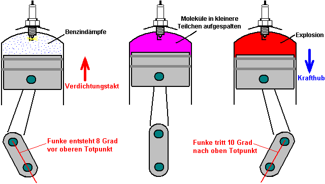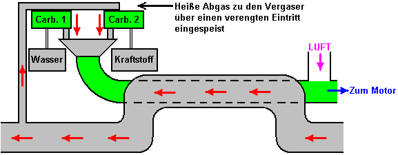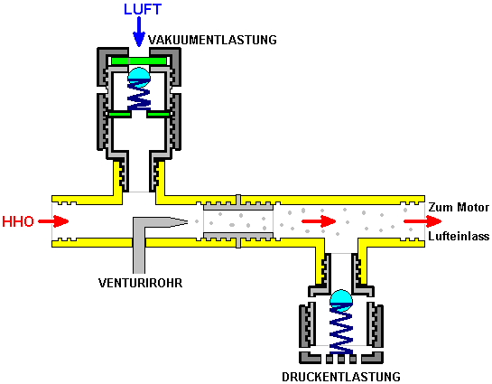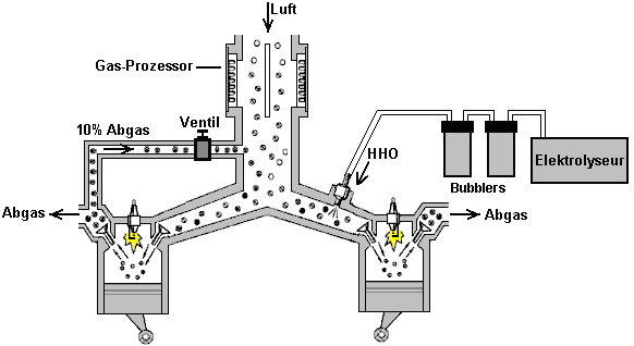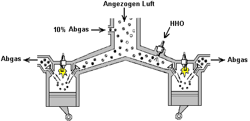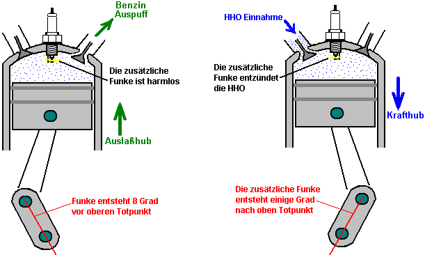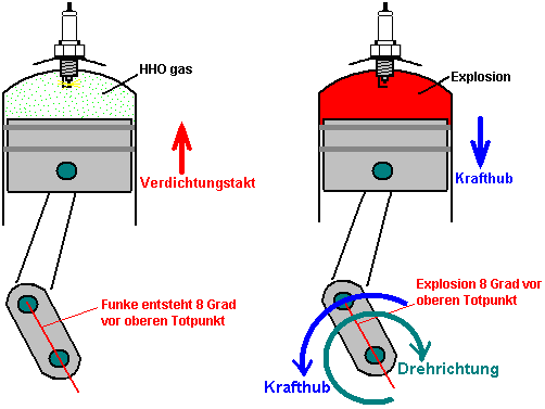 ![]() Hier haben sie sich dafür entschieden, das HHO Gas in die Luft zu speisen nach dem Luftfilter (eine Sache, die wir in der Regel zu vermeiden, da es nicht hilfreich für die HHO Gasproduktion Effizienz, aber der erste Schritt ist, um ihre erfolgreiche Methode genau zu reproduzieren, bevor man wenn es kann weiter verbessert werden). Auch in diesem selben Bereich zugeführt ist die kalte Wassernebel, der aus einer sehr großen Zahl von sehr kleinen Tröpfchen besteht. Die Luft tritt dieses Gebiet als normal, durch den vorhandenen Luftfilter. Dies gibt uns die drei notwendigen Komponenten für den Betrieb des Generators Motors ohne Verwendung von fossilen Brennstoffen. Erstellen der Kalten Wassernebel Es gibt drei verschiedene Möglichkeiten, um das Spray von sehr feinen Wassertröpfchen, die ein wesentliches Merkmal für den Erfolg dieser Art der Ausführung des Motors sind generieren. Eine Möglichkeit ist es, eine Venturi-Rohr, das, während es wie ein beeindruckendes Gerät klingt, ist eigentlich sehr einfach in der Konstruktion zu verwenden: ![]() Es ist nur ein Rohr, das zu einem Punkt verjüngt, und das eine sehr kleine Düse. Da der Motor saugt die Luft / HHO Mischung auf ihr Saughub strömt das Gemisch über die Düse des Venturirohres. Dies schafft einen Bereich niedrigeren Drucks außerhalb der Düse und bewirkt, dass Wasser durch die Düse in einem Spray aus sehr feinen Tröpfchen zu verlassen. Einige Parfum Spray-Flaschen verwenden diese Methode, da sie sowohl billig und effektiv ist. Eine alternative Methode zur Herstellung des kalten Wassers Nebel ist mit einem oder mehreren "Teich foggers" zu verwenden. Dies sind kleine Vorrichtungen, die Ultraschall im optimalen Betriebspunkt Tiefe im Wasser von einem Schwimmer gehalten werden. Sie produzieren große Mengen an kaltem Wasser Nebel, der in den Motor wie diese geführt werden kann: ![]() Eine dritte Methode ist, eine kleine Vergaser des Typs mit Modellflugzeugen verwendet wird. Dies macht die gleiche Arbeit als reguläre Motor Vergaser, Zuführen eines Spray von winzigen Wassertröpfchen in den Ansaugtrakt. Die physikalische Anordnung von dieser Möglichkeit hängt von der Konstruktion des Luftfilters des Generators modifiziert. Sie werden feststellen, dass die Menschen in Großbritannien, die dies taten, verwendet einen kleinen Gastank mit einem £18 pro Quadratzoll Druckventil. Dies ist nicht möglich mit der höchsten Qualität der HHO Gases, wenn es nicht so viel zusammengedrückt wird. Jedoch mit einem niedrigeren Gehalt von HHO welche hat einige Wasserdampf in mit ihm vermischt wird, ist es möglich, einen Gasspeicher mit dieser Art von Druck darin haben. In diesem Fall, außer möglicherweise für den Start, ist ihre Gasproduktionsrate wahrscheinlich nicht hoch genug, um wesentlich erhöhten Druck im Inneren des Behälters zu ermöglichen. Offensichtlich wird die Gas-Druckschalter am Elektrolyseur und der auf dem Gasspeichertank haben ähnliche Betriebsdrücke. Einige Sicherheits-Features Bis zu diesem Punkt hat der Elektrolyseur in nackten Umriss gezeigt. In der Praxis ist es wichtig, dass einige Sicherheitsmerkmale eingearbeitet werden wie hier dargestellt: ![]() Diese Sicherheitseinrichtungen vertraut sein sollten Ihnen von jetzt, da sie bereits zuvor in diesem Dokument erläutert wurde. Der Grund für die Änderung des Zeitpunkts Die Kraftstoffe mit den meisten Brennkraftmaschinen eingesetzt sind entweder Benzin oder Diesel. Wenn Sie nicht in der Chemie interessiert sind, dann sind Sie wahrscheinlich nicht bewusst die Struktur dieser Kraftstoffe. Diese Brennstoffe werden als "Kohlenwasserstoffe", weil sie aus Wasserstoff und Kohlenstoff aufgebaut sind. Carbon hat vier Bindungen und so ein Kohlenstoffatom zu vier anderen Atomen verbinden, um ein Molekül zu bilden. Benzin eine langkettige Molekül mit irgendetwas 7-9 Kohlenstoffatomen in einer Kette: ![]() Diesel hat die gleiche Struktur, aber mit elf bis achtzehn Kohlenstoffatomen in einer Kette. In einem Benzinmotor, wird ein feiner Sprühnebel von Benzin in jeden Zylinder während des Ansaughubs zugeführt. Idealerweise sollte der Brennstoff in Form von Dampf, aber das ist nicht mit den Ölgesellschaften beliebt, weil dabei das kann Fahrzeugs Leistungen in der 100 bis 300 mpg Bereich geben, und das würde die Gewinne aus dem Ölgeschäft zu schneiden. Das Benzin in den Zylinder während des Kompressionshubes komprimiert und dass sein Volumen verringert und erhöht seine Temperatur wesentlich. Die Luft / Kraftstoff-Gemisch wird dann mit einem kräftigen Schlag Funken und dass genügend Energie, um eine chemische Reaktion zwischen dem Brennstoff und der Luft beginnen. Weil die Kohlenwasserstoffkette ist solch ein großes Molekül, dauert es eine Zeit für diese Kette aufzubrechen, bevor die einzelnen Atome mit dem Sauerstoff in der Luft zu kombinieren. Die Hauptmaschine Leistung wird durch den Wasserstoffatomen kombiniert mit Sauerstoff erzeugt wird, so dass die Reaktion erzeugt eine große Menge an Wärme. Die Kohlenstoffatome sind nicht besonders hilfreich, bilden Kohlenstoff-Ablagerungen im Inneren des Motors, nicht um etwas Kohlenmonoxid (CO) und etwas Kohlendioxid (CO2) sowie zu erwähnen. Entscheidend ist hier die kurze Verzögerung zwischen der Zündung und Verbrennung des Kraftstoffs. Die Verbrennung muss einige Grad nach dem oberen Totpunkt passiert, wenn sich der Kolben zu seiner Abwärtsbewegung in der Krafthub starten. Wegen der Verzögerung durch die Kohlenwasserstoffkette brechen verursacht, tritt der Funke einige Grad vor dem oberen Totpunkt: ![]() Wenn Sie die Benzindämpfe mit HHO Gas zu ersetzen wäre, dann gäbe es ein großes Problem sein. Dies liegt daran, HHO Gas sehr kleines Molekül Größen, die nicht brauchen jede Art von Abbau und die sofort mit explosiver Kraft brennen. Das Ergebnis wäre eine Explosion, die viel zu früh auftritt, und welche sich gegen die Bewegung des Kolbens steigenden wie hier dargestellt werden: ![]() Die Kräf