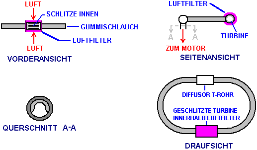 Weitere Nützliche Geräte Die Panacea Video-Serie auf die Verbesserung der Motorlauf wird dringend empfohlen. Sie können diese Reihe von Videos an videos. Das "Vortex" Luftfutter System von Ted Ewert Ted Ewert entwickelt hat und eine sehr effektive und einfache Vorrichtung, die den Betrieb einiger Fahrzeuge verbessern können getestet. Dieses Gerät funktioniert am besten mit Vierzylinder-Fahrzeuge, weil die gepulste Lufteinlass von Fahrzeugen mit weniger Zylindern, verstärkt die wohltuende Wirkung. Dies ist eine stille, einfache und billige Vorrichtung, die den Luftstrom in den Motor erhöht. Dies kann eine dramatische Auswirkung auf die Leistung des Motors. Zum Beispiel hat eine alte Ted Datsun 310, gesessen hat unbenutzten seit Jahren. Petrol ("Benzin") verliert es leichtere Fraktionen in sechs Monaten oder so und dass es weit weniger flüchtig und schwer zu verbrennen macht. Teds Datsun hat Benzin im Tank, die fünf Jahre alt ist und das Auto wird nicht auf diesem Kraftstoff betrieben mit seiner normalen Lufteinlass. Allerdings, wenn Ted eine seiner Turbinen zog, fängt sie sofort und läuft gut mit dem alten Kraftstoff. Diese besondere Vortex Turbine wurde genannt "Der Respirator". Der Datsun hat einen Vergaser, dass diese Turbine gut funktioniert mit Vergasern zeigt. ![]() Die "Respirator" Diese einfache Vorrichtung ein Wirbelrohr von einem kurzen Stück PVC Rohr, welches geschlitzt worden ist und geformt hergestellt. Es passt zwischen Luftfilter und Drosselklappenstutzen oder Vergaser, und bewirkt, dass die einströmende Luft bei einer relativ hohen Rate drehen, wodurch ein Wirbel. Winkelgeschwindigkeit ist entscheidend bei der Bildung eines starken Wirbels und der Luft in den Respirator aus dem Luftfilter, gelangt in rechten Winkeln zu den Schlitzen Turbine, so dass eine sofortige und leistungsfähige Spin Innenseite des Schlauchs. Ted sagt: "Die meisten Leute denken, der einem sich drehenden Luftmasse als keine besonders ungewöhnliche Eigenschaften. Das ist nicht richtig. Ein sich drehender Luftmasse hat einige sehr einzigartige und nützliche Eigenschaften. Standard Aerodynamik und linearen Newtonschen Physik sind unfähig, die Eigenschaften eines Luftstroms mit hoher Geschwindigkeit drehende erklärt. In der Tat, wenn sie einer statischen Luftstrom innerhalb eines Rohres im Vergleich verhält sich ein Wirbel in der fast völlig entgegengesetzten Weg. Alle rotierenden Objekten, ob sie fest, flüssig oder gasförmig sind, enthalten zwei gegensätzliche Kräfte: zentrifugalen und zentripetalen. Kreiselpumpen ist die ausdehnende Kraft Reise weg von der Mittelachse und Zentripetalkraft ist die Kontraktionskraft Ziehen in Richtung Zentrum. Dieses Konzept der dualen Kräfte ist der Schlüssel zum Verständnis eines Wirbels. "Modern" Physik hat entschieden, dass die Fliehkraft existiert nicht und jetzt bezeichnet sie als 'false' oder 'Phantom' Kraft. Dies zeigt, wie losgelöst von der realen Welt der Wissenschaft geworden ist und warum es stagniert. Die Kombination dieser beiden Kräfte, gemeinsam handeln in einem Wirbel, erstellen einige einzigartige Bedingungen. Eine dieser Bedingungen ist eine laminare Konfiguration. Koaxialen Lamellen Form während des Wirbels, wodurch in zahlreichen Schichten Luftspinnstufe nahezu unabhängig voneinander. Diese Schichten sind durch Zonen extrem niedrige, praktisch Null, Reibung getrennt und sie dadurch unterschiedlich schnell zu drehen. Da der Wirbel dreht sich schneller, so werden die zwei entgegengesetzte Kräfte stärker. Diese weitere Laminate den Fluss sowie die Komprimierung der Schichten. Die reibungsarme Zonen ermöglichen, dass die komprimierten zentralen Luftmasse einen ungehinderten Weg für seine axiale Strömung durch das Rohr. Dies ist das Gegenteil der Strömungsverhältnisse für einen geraden, nicht-kohärente Luftmasse, die eine Tendenz zu Reibung und Widerstand entwickelt hat, aufgrund von Turbulenz, in direktem Verhältnis zu seiner Geschwindigkeit durch ein Rohr. Spinrate bestimmt den Grad der Luftverdichtung und die lineare Fließgeschwindigkeit der Masse. Je schneller dass die Wirbelgeneratoren Spins, desto mehr macht das, was wir wollen, was zu einem dichten, verdichtet und schnell bewegende Strömung zu schaffen. Deshalb haben wir den Fluss der Luft aus der Airbox und nutzen seine Geschwindigkeit und Richtung (90 Grad), um den Spin in unserem Rohr einzuleiten. Dies ist bei weitem die einfachste und effizienteste Weg, um die Luft dreht schnell. Die Eigenschaften eines Wirbels im Schritt mit der Winkelgeschwindigkeit erhöht. Genau wie ein Top wackelt und fällt, wenn gesponnen langsam, so ein Wirbel wird weisen keine starke Eigenschaften, bis gesponnen wirklich schnell. Wie Sie vielleicht wissen, ist ein wichtiger Teil der Zufuhr von Luft mit einem Motor die Fähigkeit, eine Menge von Luft in einem kurzen Burst liefern. Diese Turbine erzeugt eine Spinnerei Luftmasse, die eindeutig in der Lage, diese Luft durch seine nahezu reibungsfreie laminare Zusammensetzung und Druck bis durch Kompression gebaut liefern. Der Wirbel liefert komprimierte, dichte Luft in den Zylinder, die deutlich weniger Energie braucht, um in aufgrund seiner trägen gespeicherte Energie zu ziehen, und seine Fähigkeit, sich frei bewegen in Richtung der es Drehachse. Zwischen Motorzyklen, wenn Luft nicht benötigt wird, fährt der Wirbel zu spinnen und Aufbau zusätzliche Druck. Diese Spinnen Luftmasse wirkt wie ein Schwungrad und speichert Energie, die zum Einsatz auf der nächsten Ansaughub. Ein statischer Luftströmung hat keine solche gespeicherte Energie und muss von dem Motor-Ansaughub jedes Mal Luft benötigt wird, beschleunigt werden, wodurch Energie zu verschwenden. Dieses Schwungrad Eigentums ist der Schlüssel zum Verständnis, warum der Wirbel funktioniert genauso gut wie es funktioniert. Sofern der Wirbel wird gepulst oder moduliert, kann keine zusätzliche Energie entwickelt werden. In einem Mehrzylinder-car der Luftstrom wird so stabil