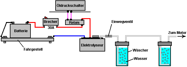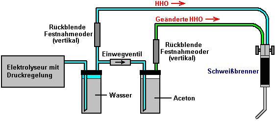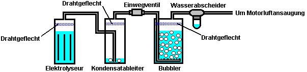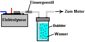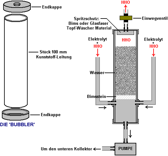 ODER ![]() Die HHO Gas durch eine Gleichstrom-Booster dieses Typs hergestellt wird, enthält etwa 30% einatomigen Wasserstoff, was bedeutet, dass 30% des Wasserstoffs in der Form von einzelnen Atome Wasserstoff ist, und nicht Wasserstoff kombiniert Paare von Atomen bedeutet. Die einatomigen Form ist etwa viermal mehr Energie als die kombinierte Form und so dauert es eine größere Volumen innerhalb des Verstärkergehäuses. Wenn der Verstärker aufgehört für einen langen Zeitraum eingeschaltet wird, dann werden diese einzelne Wasserstoffatome schließlich ineinander stoßen und zu kombinieren, um die weniger energiereichen zweiatomigen Form des Gas zu bilden. Da dies nimmt weniger Raum innerhalb des Boosters, der Druck innerhalb des Boosters Tropfen und dieser ist bekannt, Wasser saugen aus dem Gasspüler zurück in die Booster. Wir wollen nicht das geschehen, da es unser sorgfältig gemessen Elektrolyt-Konzentration verdünnt und es kann den Bubbler unwirksam wegen des Mangels an Wasser. Um damit umzugehen, wird ein Einwegventil zwischen dem Booster und dem Gasspüler gelegt, so positioniert, dass es nicht zulassen, fließen wieder in den Booster. In sehr kalten Klimazonen, eine 28 Gew.% Kaliumhydroxid-Elektrolyt nicht einfrieren, bis -40OC, ist es schwierig, den Bubbler Einfrieren stoppen. Während es möglich ist, Geräte, und unplugs kann drinnen Nacht getroffen werden müssen, ist eine Alternative zu Alkohol oder Paraffin (Kerosin) anstelle von Wasser zu verwenden und sie in der Regel nicht einfrieren und ihre Dämpfe sind nicht schädlich für einen Motor. ![]() Der Bubbler Design ist nicht schwer. Idealerweise sollten Sie eine sehr große Anzahl von kleinen Bläschen gebildet werden und schweben nach oben durch das Wasser. Dies ist, weil es die beste Verbindung zwischen dem Gas und dem Wasser gibt und so kann eine wirklich gute Arbeit des Waschens keine Spuren von Hydroxid Dampf aus dem HHO Gas, bevor es dem Motor zugeführt wird tun. Kleine Blasen sind auch besser voneinander getrennt und so gibt es keine reale Chance einer Flamme, die durch das Wasser, wo große Blasen verschmelzen könnte und bilden eine Gassäule, wie sie an die Oberfläche steigen. ![]() In diesem guten bubbler Design, wird das Rohr, das HHO Gas speist in der Waschflasche in einer L-Form gebogen. Das Ende des Rohrs aus, blockiert und viele kleine Löcher in dem horizontalen Abschnitt des Rohres gebohrt wird. Nur wenige Löcher sind in dieser Darstellung zu sehen, aber es wird eine große Anzahl in der eigentlichen Konstruktion sein. Wie die Booster selbst, muss der Gasauslassrohr von Spritzwasser durch das Fahrzeug geht über einen Buckel verursacht werden, geschützt werden. Es ist sehr wichtig, um sicherzustellen, dass kein Wasser in den Motor zusammen mit dem Gas gezogen, so anti-slosh Material oder ein oder mehrere Leitbleche verwendet werden, um dies zu verhindern. So dass der gesamte Schutz für den Gasstrom ist: ![]() Dabei ist der erste Sprudler ist in der Nähe des Verstärkers und die zweite in der Nähe des Motors angeordnet. Einmal in eine Weile, kann das Wasser aus dem ersten Wäscher zur Aufstockung das Wasser im Inneren des Verstärkers, so dass keine Spuren von Hydroxid die Bubbler erreicht haben, um den Booster zurückgegeben werden, erhalten ihre Elektrolytkonzentration genau richtig und dafür zu sorgen, dass das Wasser in der Waschflasche ist immer frisch. Es gibt eine letzte Element, das ein optionales Extra ist. Einige Leute mögen ein Gas-Druckschalter hinzuzufügen. Wenn aus irgendeinem Grund, beginnt der Druck zu steigen - sagen, dass das Auslassrohr blockiert wurde - dann wird der Druck Schalter würde die Stromversorgung trennen und stoppen Sie den Druck steigender weiter: ![]() Eine Entscheidung, die getroffen werden muss, ist die Rate der HHO Gas-Produktion, die für Sie am besten ist. Die meisten Leute scheinen zu denken, dass je größer das Volumen der HHO Gas, desto besser. Das ist nicht notwendigerweise wahr, da eine sehr effektive Nutzung des Gases ist, um es als Zünder für den Motor die normale Kraftstoff handeln und sehr zufriedenstellende Ergebnisse wurden mit HHO Gasdurchsätze worden in dem Bereich von 0,4 bis 0,7 Liter pro Minute erreicht. Sie steuern die Rate der Gaserzeugung durch Steuern des Stroms, entweder durch die Konzentration des Elektrolyten oder durch Einstellen des Stromflusses mit einer elektronischen Schaltung. Jeder Liter Wasser produziert etwa 1.750 Liter HHO Gas, so können Sie die Länge der Zeit, die Booster auf einen Liter Wasser arbeiten kann abschätzen. Wenn zum Beispiel wird Ihre Herstellung Booster 0,7 Liter Gas pro Minute. Dann wird es 1.750 Liter in 1750 / 0,7 Minuten zu produzieren, und das ist 2.500 Minuten oder 41 Stunden und 40 Minuten. Da der Booster funktioniert nur, wenn Sie unterwegs sind, werden Sie mit 41 Stunden Lenkzeit suchen und wenn Sie etwa zwei Stunden pro Tag fahren, es würde drei Wochen dauern, um einen Liter Wasser zu verwenden. Die internen Abmessungen des Booster können Sie berechnen, wie weit das Elektrolyt-Niveau sinkt, wenn ein Liter Wasser aus ihm heraus. Generell ist es in der Regel davon ausgegangen, dass Nachfüllen Booster mit Wasser von Hand jeder so oft, ist eine ganz gute Arbeitsweise. Der Booster oben beschriebenen Aufbau hat eine gute Kapazität Elektrolyt in jeder Zelle und so Nachfüllen von Wasser sollte kein großes Aufgabe sein. Da Leitungswasser und Brunnenwasser ziemlich viel gelöste Feststoffe in sich haben, wenn das Wasser entfernt wird durch Elektrolyse genommen, fallen diese Feststoffe aus der Lösung und fallen auf den Boden des Gehäuses, und / oder Beschichtung der Platten mit einer Schicht aus unerwünschtes Material. Aus diesem Grund ist das Leben so viel einfacher, wenn destilliertes Wasser zur Herstellung Elektrolyt und zum Nachfüllen Booster nach Gebrauch verwendet wird. Es ist möglich, eine automatische Wasserversorgung für Ihren Booster haben, obwohl das ist wohl für eine so e