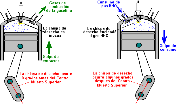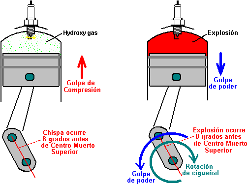 ![]() Aquí, ellos han optado a alimente los hydroxy gasean en el sistema aéreo después del filtro aéreo (una cosa que nosotros normalmente evitamos como él no es útil para el hydroxy gasee la eficacia de la producción, pero el primer paso es reproducirse su método exitoso exactamente antes de ver si puede mejorarse más allá). También alimentado en este misma área es la niebla de agua fría que se comprende de un número muy grande de gotas muy diminutas. El aire entra en este área como normal, a través del filtro aéreo existente. Esto nos da los tres componentes necesarios por ejecutar el artefacto del generador sin usar cualquier combustible fósil. Creando la niebla de agua fría Hay tres maneras diferentes de generar el rocío de gotas de agua muy finas que son un rasgo importante del éxito de esta manera de ejecutar el artefacto. Una manera es usar un tubo de Venturi que, mientras parece un dispositivo impresionante, realmente es muy simple en la construcción: ![]() Es simplemente una cañería que adelgaza a un punto y qué tiene una boquilla muy pequeña. Cuando el artefacto atrae la mezcla del air/hydroxy en él es el golpe de la succión, la mezcla se apresura más allá de la boquilla del tubo de Venturi. Esto crea una área de más bajo presión fuera de la boquilla y agua de las causas terminar a través de la boquilla en un rocío de gotas muy finas. Algunos perfuman las botellas de rocío usan este método como él es barato y " eficaz. Un método alternativo de hacer la niebla de agua fría es usar uno o más "foggers del estanque." Éstos son dispositivos ultrasónicos pequeños que se mantienen a la profundidad operando óptima en el agua por un flotador. Ellos producen cantidades grandes de niebla de agua fría que puede alimentarse en el artefacto así: ![]() Un tercer método es usar un carburettor pequeño del tipo usado con el avión ejemplar. Esto hace el mismo trabajo como un carburettor del artefacto regulares, mientras alimentando un rocío de gotas de agua diminutas en el artefacto la succión aérea. El arreglo físico de esta opción depende de la construcción del filtro aéreo del generador a modificándose. Alguna Seguridad Ofrece A a este punto, el electrolyser se ha mostrado en el contorno desnudo. En la práctica, es esencial que que algunos rasgos de seguridad están incorporados como mostrado aquí: ![]() Estos dispositivos de seguridad deben estar ahora familiarizados a usted cuando ellos ya se han explicado antes en este documento. La Razón por Cambiar el Cronometrando Los combustibles usados con más artefactos de la combustión interiores son cualquier gasolina (la gasolina) o diesel. Si usted no está interesado en la química, entonces usted probablemente no es consciente de la estructura de estos combustibles. Estos combustibles se llaman "hidrocarburos" porque ellos están compuestos de hidrógeno y carbono. El carbono tiene cuatro ataduras y para que un átomo del carbono puede unirse a cuatro otros átomos para formar una molécula. La gasolina es una molécula de la cadena larga con algo de siete a nueve átomos del carbono en una cadena: ![]() El diesel tiene la misma estructura pero con once a dieciocho átomos del carbono en una cadena. En un artefacto de gasolina, un rocío fino de gasolina se alimenta en cada cilindro durante el golpe de la succión. Con suerte, el combustible debe estar en el vapour forme pero esto no es popular con las compañías de aceite porque haciendo eso pueden dar las actuaciones del vehículo en los 100 a 300 mpg vaya y ese cortaría las ganancias de las ventas de aceite. La gasolina en el cilindro está comprimida durante el golpe de condensación y eso reduce su volumen y aumentos substancialmente su temperatura. La mezcla del air/fuel se pega entonces con una chispa poderosa y eso proporciona bastante energía para empezar una reacción química entre el combustible y el aire. Porque la cadena del hidrocarburo es semejante molécula grande, toma un momento para esa cadena separarse antes de que los átomos individuales combinen con el oxígeno en el aire. El poder del artefacto principal se produce por los átomos de hidrógeno que combinan con oxígeno, cuando esa reacción produce una cantidad grande de calor. Los átomos del carbono no son particularmente útiles, mientras formando los depósitos del carbono dentro del artefacto, para no mencionar un poco de monóxido del carbono (CO) y algún dióxido del carbono (CO2) también. El factor importante aquí es el retraso ligero entre la chispa y la combustión del combustible. La combustión necesita pasar unos grados después del Centro de Muerto de Cima cuando el pistón está a punto de empezar su movimiento descendente en el golpe de poder. Debido al retraso causado por la ruptura de cadena de hidrocarburo abajo, la chispa ocurre unos grados antes de la Cima el Centro Muerto: ![]() Si usted fuera reemplazar el vapour de gasolina con el hydroxy gasee, habría un problema mayor entonces. Esto es porque el gas del hydroxy tiene que la molécula muy pequeña clasifica según tamaño que no necesita cualquier amable de estropearse y qué quema al instante con la fuerza explosiva. El resultado sería una explosión que ocurre lejos demasiado pronto y qué opone el movimiento del pistón creciente como mostrado aquí: ![]() Las fuerzas impuestas en la biela del pistón serían tan altas que sería bastante responsable al descanso y causa el daño del artefacto adicional. En el caso de nuestro generador eléctrico, nosotros no estaremos alimentándole una mezcla de aire y hydroxy gasee, pero en cambio, una mezcla de aire, gas del hydroxy y niebla de agua fría. Esto tarda la combustión del gas del hydroxy por una cantidad pequeña, pero todavía es importante tener la chispa ocurrir después del Centro de Muerto de Cima, para que la ignición del generador necesita ser retardada por once grados. El plan del artefacto varía considerablement