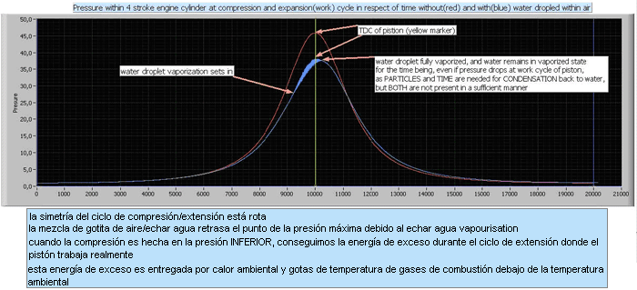 El leño de la repetición: el humidifier Ultrasónico 0.25 vaporisation de agua de basura por hora se puso a 1/3 de su poder. Use el humidifier de agua a la succión aérea. Quite el carburettor (o el material inyección si cualquiera) y se filtra primero para. La manera del plumero a la succión de aire de artefactos debe ser tan corta como posible evitar las gotas de agua microscópicas creadas por el humidifier que colecciona adelante el dentro del tubo que da la llovizna de agua a la succión de aire de artefacto. El artefacto usado era un 1-cilindro 200 c.c.p. el generador eléctrico. El artefacto corrió muy lentamente al principio. En el caso de un 4-golpe el artefacto de Otto, es posible acelerarlo a usar un cartucho del propano. El artefacto tiende entonces a "cerradura" en una rpm más alta venda fuera de dónde el propano puede cortarse permanentemente. La ida aérea en el artefacto tiene una temperatura de 22° C, mientras en el promedio la temperatura aérea que deja el artefacto era -16° C (un 38° C dejan caer). ¡Esto está asombrando–pero este concepto realmente trabaja! Usted puede hacer el usando ocioso al artefacto del automóvil este método. El agua puede necesitar ser un pedazo caluroso. La ignición no se necesita pero facilita el funcionamiento del artefacto. Usted puede necesitar a “se vuelve la llave” varios tiempos (basado en esta prueba de la repetición). En el caso de un artefacto del diesel, usted puede necesitar reemplazar los inyectores con algún amable de bujía como en un artefacto de A.E.R.O.P.S o uso Firestorm tapa o cualquier otro material que puede dar una explosión adicional al agua vía la descarga del plasma, aumentar la actuación más allá. Usted puede hacer un trabajo de generador de gasolina con el vapor de agua, también una cortadora de césped, etc., Ahora - cuando está ocioso que usted ha ido ‘encima del borde ' para que usted necesita agregar un poco más poder, las posibles opciones son: agregando hidrógeno o HHO, precalentando el agua (posiblemente con la energía solar), agregando un poco de combustible o espíritu, ignición poderosa o quizá algún polarisation magnético. Este concepto es ahora público y usted puede experimentar con él solo. Siga precauciones de seguridad y sentido común del uso. No espere la rpm alta resulta adelante el muy primero la carrera de la prueba. Su un concepto muy básico que muestra simplemente un tipo de transformación de calor de ambiente en la presión y el trabajo utilizable. También, no pre-caliente el artefacto antes de usarlo. ¡El artefacto no debe estar caliente! Un pedazo de fondo físico: Durante el primer golpe de un 4-golpe el artefacto de Otto, los movimientos del pistón abajo y succiones el aire ambiente en el cilindro. Durante el segundo golpe, el pistón sube y compresas este aire a una presión de 25 barra (las atmósferas). Según el “la ley de gas ideal”: la temperatura sube debido a la condensación sobre su temperatura ambiente inicial. La proporción de condensación del artefacto empujará la temperatura, típicamente a a 450°C a 500°C. ¡Este segundo golpe de un artefacto de Otto NECESITA la ENERGÍA POR la CONDENSACIÓN! Ahora considere lo que pasará a las gotas de agua microscópicas contenido en el aire dentro del cilindro. Si el agua convierte para llamarada-cocer al vapor al instante, entonces su volumen aumenta dramáticamente, mientras empujando la presión dentro del cilindro e impulsando el pistón durante su golpe de poder y la energía guardando en el volante. Por favor note, que la llovizna de agua no es ningún vapour de agua... ¡no es un gas! ¡Todavía es un líquido! ¡La DIFERENCIA importante se pone evidente durante el golpe de condensación! Como el pistón empieza a mover el upwards para comprimir aire que contiene las gotas de agua, presión Y CALOR, como descrito antes, empiece a subir. ¡PERO la propia condensación no puede levantar la temperatura de agua directamente, cuando el agua todavía es un LÍQUIDO y por consiguiente la temperatura del agua no es afectado de la presión más alta! Así inicialmente, sólo la temperatura aérea sube debido a la condensación. ¡Pero las gotas de agua diminutas están presentes dentro del cilindro, y cuando la temperatura aérea se pone mayor y mayor que la temperatura de las gotas de agua, el calor empieza a fluir del aire en las gotas de agua, mientras calentándolos! Pero como largo la temperatura de agua no alcanza su punto de ebullición, las gotas no extenderán la deuda a este levantamiento en la temperatura y ellos guardarán el mismo volumen simplemente. ¡Así las gotas de agua que actúan como un calor-absorbente durante el golpe de condensación! ¡El más bajo calor implica la más bajo presión, y la más bajo presión durante el golpe de condensación implica ENERGÍA que AHORRA DURANTE EL GOLPE de CONDENSACIÓN! Por favor tenga una mirada al gráfico siguiente (ninguna pérdida es incluido en el cálculo): ![]() El gráfico muestra la presión dentro de un cilindro de artefacto de 4-golpe en el respeto de tiempo, empezando del principio del golpe de condensación (segundo uno), acabando con el extremo del golpe de poder (tercero uno). El trabajo que se necesita para el golpe de condensación se representa por el integral del gráfico, del muy salido al marcador amarillo. El trabajo que se hace por el pistón durante el golpe de poder se representa por el integral del gráfico del marcador amarillo al muy correcto del gráfico (20,000 a la balanza de tiempo). Asumamos ese artefacto es uno ideal (pérdida-menos). La línea del gráfico roja representa la presión dentro del cilindro del artefacto, si ninguna agua está presente, y ninguna ignición ocurre. El gráfico es simétrico al Centro de Muerto de Cima (el marcador amarillo en el medio), para que nosotros pusimos en la energía a la condensación y nosotros volvemos la misma cantidad durante el 3 golpe (el golpe d