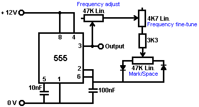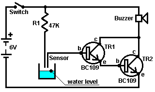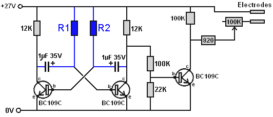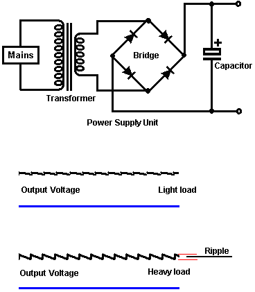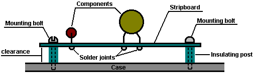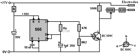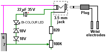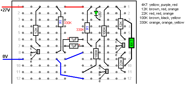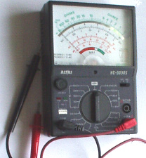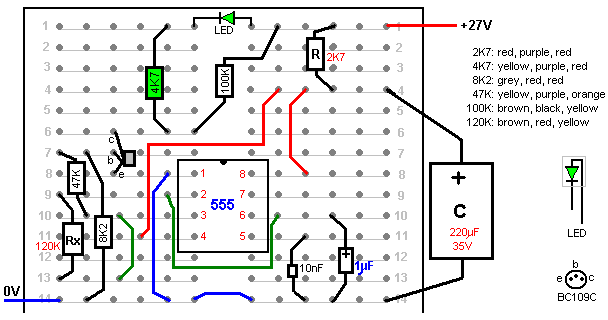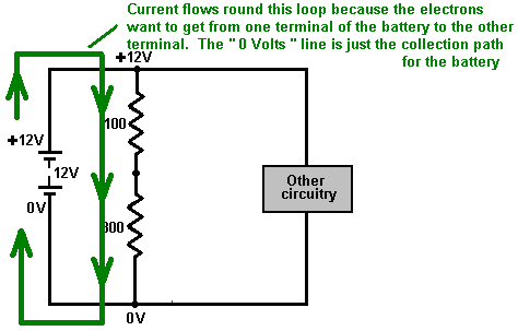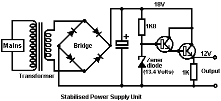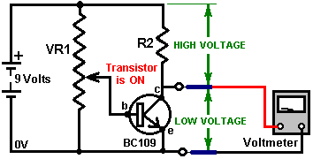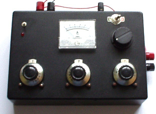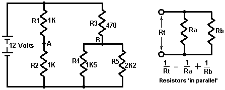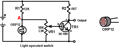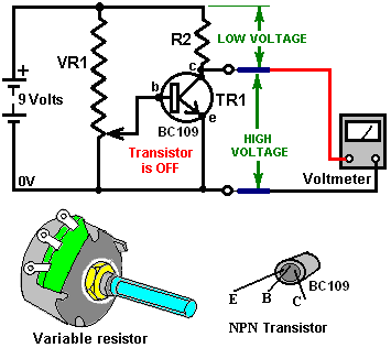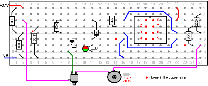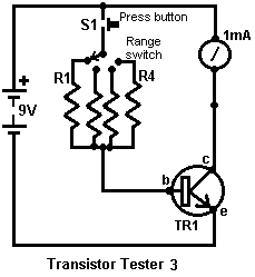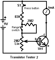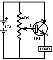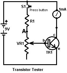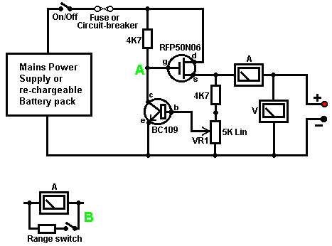 Look around and see what is available, how much it costs and what appeals to you. It might not be a bad idea to buy a really cheap multimeter and use it for a while to see if it has any shortcomings which are a nuisance, and if so, what improvements you personally want from a more expensive meter. It might be worth getting a fancy bench power supply which allows you to set any voltage you want and which displays the current being drawn by your development circuit: ![]() However, there is no need to spend money on a fancy unit when you can build an excellent unit of your own with voltage stabilisation, adjustable output, metered current, etc. etc. Personally, if developing a circuit to be used with a battery, I believe you are better off powering the development from a battery, that way the characteristics of the battery are included in any tests which you carry out. Power Supply: If you wish, you can construct a very convenient development test bed power supply system. This has the advantage that you can make it in the most convenient style for your own use. You can also make the protection ultra-sensitive and build in additional circuitry such as transistor tester and resistor substitution box to produce an integrated test bed. You could perhaps use a circuit like this: ![]() Here, the power is supplied by a pack of re-chargeable Ni-Cad batteries or possibly, a mains unit with voltage stabilisation. As in all actual circuits, the next thing in the circuit is always an on/off switch so that the power source can be disconnected immediately should any problem arise. Next, as always, comes a fuse or circuit breaker, so that should the problem be serious, it can disconnect the circuit faster than you can react. If you wish, you can build your own super-accurate adjustable circuit breaker to use in this position. The two transistors and three resistors form an adjustable, stabilised output. The FET transistor has a high output power handling capacity and a very low input power requirement and so is good for controlling the output voltage. Resistor ‘VR1’ is padded with the 4K7 resistor solely to reduce the voltage across the variable resistor. VR1 is adjusted to control the output voltage. If the current draw is increased and the output voltage is pulled down slightly, then the voltage on the base of the BC109 transistor is reduced. This starts to turn the transistor off, raising the voltage at point ‘A’, which in turn, raises the output voltage, opposing the variation caused by the load. The output is monitored, firstly by a large milliammeter to show the current draw and secondly, on the output side of the milliammeter, a voltmeter. This allows very close monitoring of the power supplied to the prototype, especially if the milliammeter is placed alongside the prototype. You can build this circuit into a wide flat box which provides a working surface beside the milliammeter. At point ‘B’ in the above diagram, a method for altering the current range of the milliammeter by placing a ‘shunt’ resistor across it. When the switch is closed, some current flows through the resistor and some through the milliammeter. This resistor has a very low value, so you are better off making it yourself. Let’s say we wish to double the range of the meter. Solder the switch across the meter and for the resistor use a length of enamelled copper wire wound around a small former. Put a load on the output so that the meter shows a full-scale deflection. Close the switch. If the current displayed is exactly half of what it was, if not, switch off, remove some wire to lower the reading or add some wire to raise the reading and repeat the test until exactly half the current is displayed. The lower the value of the shunt resistor, the more current flows through it and the less through the meter, which then gives a lower reading. Please note: it is very important to have a fuse or circuit breaker in the power being delivered to your test circuit. Any error in building the prototype can cause a major current to be drawn from the supply and this can be dangerous. Remember, you can’t see the current. Even if you have a meter on the current being delivered, you may not notice the high reading. The first sign of trouble may be smoke! You can easily fry the circuit you are building if you do not have a safety cut-off, so use a fuse or other device which limits the current to twice what you are expecting the circuit to draw. So, after all that, what equipment do you really need? You need a small soldering iron and multicore solder, a pair of long-nosed pliers and a multimeter. One other thing is some tool to cut wires and remove the insulation prior to soldering. Personal preferences vary. Some people prefer one of the many custom tools, some people use a knife, I personally use a pair of straight nail scissors. You pick whatever you are comfortable with. Not exactly a vast array of essential equipment. The other items mentioned are not by any means essential so I suggest that you start by keeping things simple and use a minimum of gear. If you are not familiar with electronics, I suggest that you get a copy of the Maplin catalogue, either from one of their shops or via the Maplin web site. Go through it carefully as it will show you what components are available, how much they cost and often, how they are used. The specifications of almost any semiconductor can be found free at AllDataSheet in the form of an Adobe Acrobat document. Finally, because it is not important, all of the circuitry shown so far has indicated current flowing from the + of a battery to the - terminal. The discovery of voltage was made by Volta but he had no way of knowing which way the current was flowing, so he guessed. He had a 50 - 50 chance of getting it right but he was not lucky and got it wrong. Electrical current is actually a flow of electrons, and these flow from the battery minus to the battery plus. So, who cares? Almost no