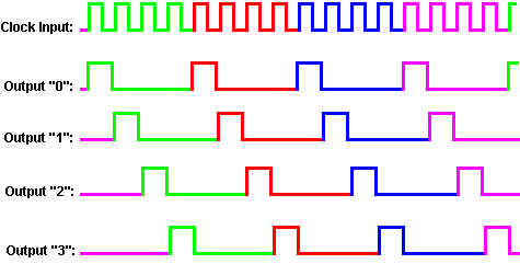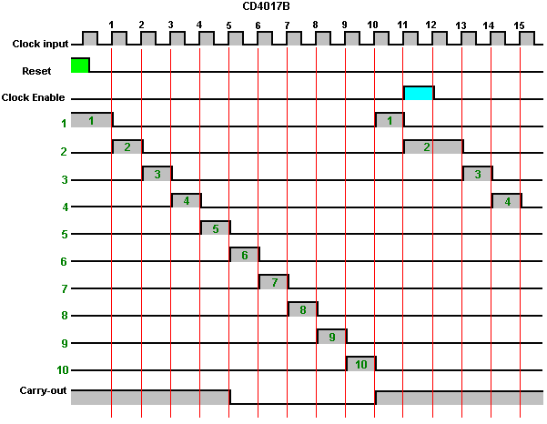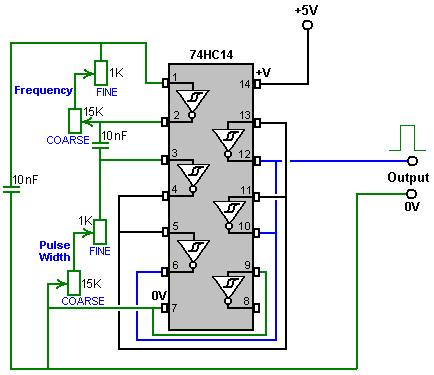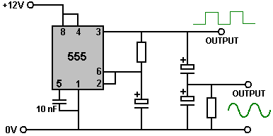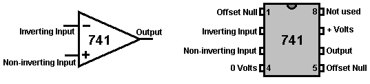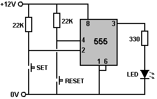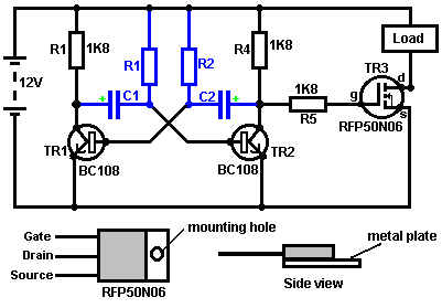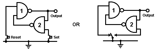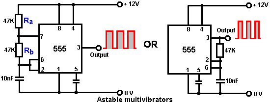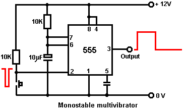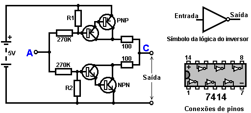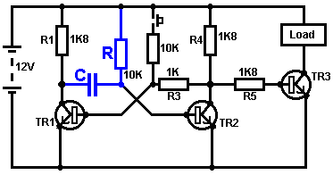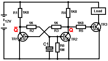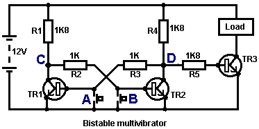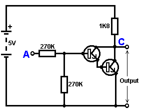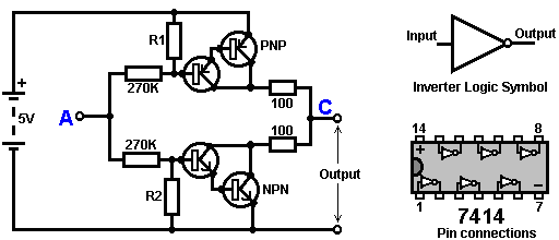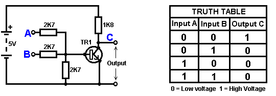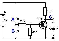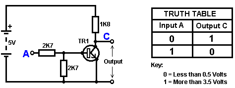 The Astable multivibrator. The astable circuit is the monostable with a second capacitor added so that neither state is stable. This results in the circuit flopping backwards and forwards continuously: ![]() The rate of switching is controlled by the R1/C1 and R2/C2 combinations. The load’s ON time to its OFF time is called the ‘mark-space’ ratio, where the ON period is the ‘mark’ and the OFF period is the ‘space’. If you choose to use electrolytic capacitors which have their own polarity, then the +ve end of each capacitor is connected to the transistor collector. While it is good to understand how these multivibrator circuits operate and can be built, nowadays there are pre-built circuits encased in a single package which you are much more likely to choose to use. These are called Integrated Circuits or ‘ICs’ for short. We will be discussing these shortly. Before we do, notice that in the circuit above, transistor TR3 has been changed to a new variety called a Field Effect Transistor (‘FET’). This type of transistor is newer than the ‘bipolar’ transistors shown in the earlier circuits. FETs come in two varieties: ‘n-channel’ which are like NPN transistors and ‘p-channel’ which are like PNP transistors. FETs are more difficult to make but have now reached a level of cost and reliability which makes them very useful indeed. They require almost no base current (called ‘gate’ current with this type of transistor) which means that they have almost no effect on any circuit to which they are attached. Also, many of them can handle large currents and boast major power handling capabilities. Because of this, it is usual to see them packaged with a metal plate mounting, ready to be bolted to an aluminium heat-sink plate to help dissipate the heat generated by the large amount of power flowing through them. The ‘RFP50N06’ shown above can handle up to 50 Volts and carry up to 60 Amps, which is serious power handling. Inverters Consider the following circuit: ![]() If neither of the press-button switches are operated, the transistor has no base/emitter current flow and so it is off. This places the collector voltage at ‘C’ near the positive rail (+5 Volts). If press-button switch ‘A’ is operated, the base voltage tries to rise to half of the battery voltage but doesn’t make it because the transistor base pins it down to 0.7 Volts. This feeds base current to the transistor, switching it hard on and causing the output at ‘C’ to drop to nearly 0 Volts. If press-button switch ‘B’ is operated (don’t do this when switch ‘A’ is closed or you will get a very high ‘short-circuit’ current flowing directly through the two switches) it has no effect on the output voltage which will stay high. If we re-draw the circuit like this: ![]() We can see that if the voltage at the input ‘A’ is taken high, then the output voltage at ‘C’ will be low. If the voltage at the input ‘A’ is taken low, then the output voltage at ‘C’ will be high. A circuit which does this is called an ‘Inverter’ because it ‘inverts’ (or ‘turns upside down’) the input voltage. We can summarise this operation in a table. Personally, I would call the table an ‘Input/Output’ table, but for no obvious reason, the standard name is a ‘Truth’ table. The purpose of this table is to list all of the possible inputs and show the corresponding output for each input. Another standard, is to substitute ‘1’ for ‘High Voltage’ and ‘0’ for ‘Low Voltage’. You will notice that many items of electrical and electronic equipment have these symbols on the ON / OFF switch. In computer circuitry (hah! you didn’t notice that we had moved to computer circuits, did you?), the ‘0’ represents any voltage below 0.5 Volts and the ‘1’ represents any voltage above 3.5 Volts. Many, if not most, computers operate their logic circuits on 5 Volts. This Inverter circuit is a ‘logic’ circuit. A criticism of the above circuit is that its input resistance or ‘impedance’ is not particularly high, and its output impedance is not particularly low. We would like our logic circuits to be able to operate the inputs of eight other logic circuits. The jargon for this is that our circuit should have a ‘fan-out’ of eight. Let’s go for a simple modification which will improve the situation: ![]() Here, The input impedance has been increased by a factor of 100 by using a Darlington pair of transistors which need far less base current, and so can have a much higher input resistor. Unfortunately, the output impedance is still rather high when the transistors are in their OFF state as any current taken from the positive line has to flow through the 1K8 (1800 ohm) resistor. But we need this resistor for when the transistors are in their ON state. We really need to change the 1K8 resistor for some device which has a high resistance at some times and a low resistance at other times. You probably have not heard of these devices, but they are called ‘transistors’. There are several ways to do this. We might choose to use PNP transistors (we normally use NPN types) and connect these in place of the 1K8 resistor. Perhaps we might use a circuit like this: ![]() This circuit is starting to look complicated and I don’t like complicated circuits. It is not as bad as it looks. The NPN transistors at the bottom are almost the same as the previous circuit. The only difference is that the collector load is now two 100 ohm resistors plus the resistance of the two transistors. If the PNP transistors are OFF when the NPN transistors are ON, then the circuit loading on the NPN transistors will be negligible and the whole of the NPN transistors output will be available for driving external circuits through the lower 100 ohm resistor (a large ‘fan-out’ for the ‘0’ logic state). To make sure that the PNP transistors are hard off before the NPN transistors start to s