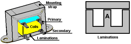 However, while all that information is a useful, gentle introduction to what an inductor is, it does not convey the most important feature of a coil, which is that every coil stores energy when it is connected to a power source and it returns almost all of that energy when disconnected from the power source. The return of the stored energy happens in a very short period of time and that feature can produce powerful systems if you have the expertise to capture and use that power. For example, it is not unusual for a simple 12-volt system to generate a rapid series of 400-volt pulses which can be used to recondition and charge car batteries. There are many examples of this in chapter 6. Paul Babcock (www.paulmariobabcock.com) destroyed more than a thousand transistors when developing his magnetic motor system as the return of coil energy is so fast that it produces high current flows, and if the capacitor into which the current return is being fed is of a low capacity, voltages higher than the supply voltage are produced. For the last hundred years or so, this sort of information has been suppressed, so take what is said in standard textbooks as being a mixture of half truths and downright lies. As ‘Kone’ has demonstrated, if you short-circuit a powered coil, it causes multiple magnetic pulses as the power in the coil oscillates backwards and forwards through the closed circuit containing the coil: ![]() Magnetism is a field which has not been taught or generally researched for many decades. It is not a simple subject. The magnetic strength produced by any coil increases as the number of turns in the coil increases (if the current flowing through the coil remains the same). That means that a coil with many turns can produce a higher magnetic field at a lower current than a high-current coil with few turns. However, other coil characteristics are also altered. The power loss due to the resistance of the wire in the coil increases with increased turns as they need a longer length of wire. That power loss results in the coil heating up when in use. The speed with which the magnetic field develops and decays is slower for a coil with many turns. Surprisingly, because of this, the best coil for many jobs ends up having relatively few turns. Transformers Transformers are used to alter the voltage of any alternating current power source. If the alteration increases the output voltage, then the transformer is called a ‘step-up’ transformer. If the output voltage is lower than the input voltage then it is called a ‘step-down’ transformer. If the voltages are the same, it is called an ‘isolation’ transformer. A common construction looks like this: ![]() The Coil bobbin sits on the section of the laminations marked ‘A’ above. The coil is wound on its bobbin former, first one winding and then the second winding. The bobbin is then placed on the central part of the ‘E’ shaped laminations and then completely surrounded by the laminations when the crossbar is placed on the top. The mounting strap is used to hold the two sets of laminations together and provide mounting lugs for attaching the transformer to a chassis. There are typically, twenty laminations in each set and every lamination is insulated from the adjoining laminations. If you want to change the voltage of a battery supply, it is possible to build an electronic circuit to generate an alternating voltage and then use a transformer to change that alternating voltage to whatever voltage you want. The most common form of this, is for generating mains voltage from a 12 Volt car battery, so that mains equipment can be run in remote locations, such as boats, caravans, etc. These circuits are called ‘inverters’ and they are very popular pieces of equipment. The voltage in the secondary coil of any transformer is determined by the ratio of the turns in the primary and secondary windings. For example; if there is a 10 Volt alternating voltage available and you have a transformer which has 100 turns in the primary coil and 1000 turns in the secondary coil. If you connect the 10 Volts across the primary, there will be 100 Volts generated across the secondary coil. Instead, if you connect the 10 Volts across the secondary coil, a voltage of 1 Volts will be generated across the primary winding. This is because there is a 10:1 ratio between the two windings. The Law of Conservation of Energy applies to transformers as it does to everything else. The power input to the primary winding will be the same as the power in the secondary winding minus the losses. The losses, in this case, will be a temperature rise of the whole transformer. If the current passed through the transformer is well below its rated capacity, then the losses will be small. The important point is that 10 Volts at 1 Amp into the primary winding will generate 100 Volts in the secondary, but at somewhat less than 0.1 Amps: Power Input is 10 Watts and Power Output is almost 10 Watts. The voltage has been raised to 100 Volts but the potential current draw has been reduced from 1 Amp to 0.1 Amps (100 mA). In practice, the thickness of the wire used in the windings is very important. If the voltage to be placed across the winding is high, then the wire diameter will be small. Coil windings have fairly low resistances but this is not critical in circuits as coils operate in a peculiar way. Coils have AC ‘impedance’ in addition to their DC ‘resistance’. While Direct Current (from a battery, say) can flow quite easily through a coil with low resistance, Alternating Current may have a hard job getting through the coil due to its high ‘impedance’. Sometimes, coils are used to choke off any AC ripple (interference) coming along a DC power cable. When a coil is used for this purpose it is called a ‘choke’. Each coil has its own resonant frequency and at that frequency it is very difficult for AC to get through the coil. Crystal set radios work on that princip