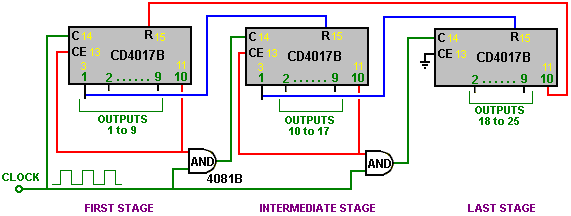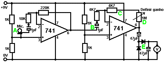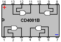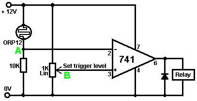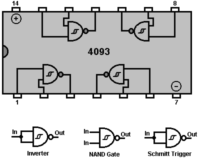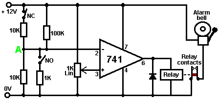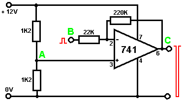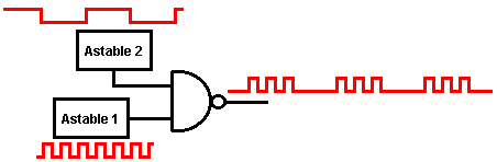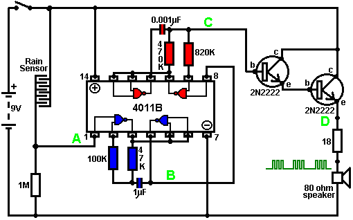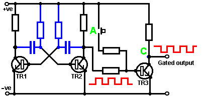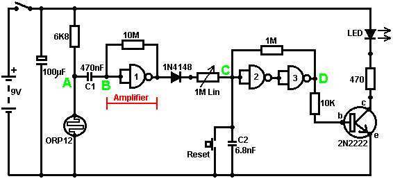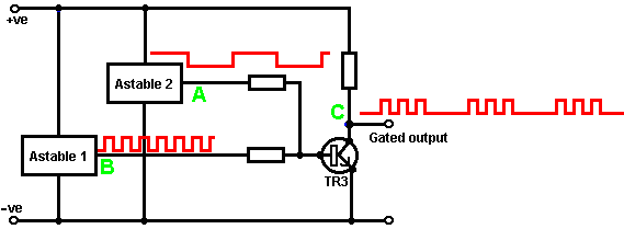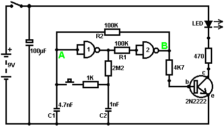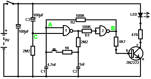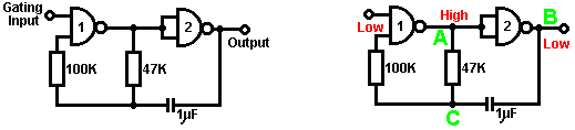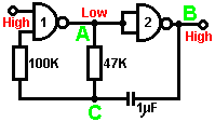 When it starts to rain, the voltage at point ‘A’ rises, letting the first astable oscillate. As it does so, it turns the second astable on and off in a steady rhythmic pattern. This feeds repeated bursts of high speed oscillations from the second astable to point ‘C’ in the diagram. So, why does this circuit oscillate?: ![]() The circuit will not oscillate if the gating input is low, so assume it to be high. Take the moment when the output of gate 2 is low. For this to happen, the inputs of gate 2 have to be high. As the output of gate 1 is wired directly to the inputs of gate 2, it must be high, and for that to be true, at least one of its inputs must be low. This situation is shown on the right. There is now a full voltage drop between point ‘A’ and point ‘B’. The 47K resistor and the capacitor are in series across this voltage drop, so the capacitor starts to charge up, progressively raising the voltage at point ‘C’. The lower the value of the resistor, the faster the voltage rises. The larger the value of the capacitor, the slower the voltage rises. When the voltage at point ‘C’ rises sufficiently, the 100K resistor raises the input voltage of gate 1 far enough to cause it to change state. This creates the following situation: ![]() Now, the voltage across ‘A’ to ‘B’ is reversed and the voltage at point ‘C’ starts to fall, its rate governed by the size of the 47K resistor and the 1 microfarad capacitor. When the voltage at point ‘C’ falls low enough, it takes the input of gate 1 low enough (via the 100K resistor) to cause gate 1 to switch state again. This takes the circuit to the initial state discussed. This is why the circuit oscillates continuously until the gating input of gate 1 is taken low to block the oscillation. Now, here is a NAND gate circuit for a sequential on/off switch: ![]() This circuit turns the Light Emitting Diode on and off repeatedly with each operation of the press-button switch. When the on/off switch is closed, capacitor ‘C1’ holds the voltage at point ‘A’ low. This drives the output of gate 1 high, which moves the inputs of gate 2 high via the 100K resistor ‘R1’. This drives the voltage at point ‘B’ low, turning the transistor off, which makes the LED stay in its off state. The low voltage at point ‘B’ is fed back via the 100K resistor ‘R2’ to point ‘A’, keeping it low. This is the first stable state. As the output of gate 1 is high, capacitor ‘C2’ charges up to that voltage via the 2M2 resistor. If the press-button switch is operated briefly, the high voltage of ‘C2’ raises the voltage of point ‘A’, causing gate 1 to change state, and consequently, gate 2 to change state also. Again, the high voltage at point ‘B’ is fed back to point ‘A’ via the 100K resistor ‘R2’, keeping it high, maintaining the situation. This is the second stable state. In this state, point 'B’ has a high voltage and this feeds the base of the transistor via the 4.7K resistor, turning it on and lighting the LED. In this second state, the output of gate 1 is low, so capacitor ‘C2’ discharges rapidly to a low voltage. If the press-button switch is operated again, the low voltage of ‘C2’ drives point ‘A’ low again, causing the circuit to revert to its original stable state. We could, if we wished, modify the circuit so that it would operate for three or four minutes after switch-on but then stop operating until the circuit was turned off and on again. This is accomplished by gating one of the gates instead of just using both as inverters. If we gated the second gate, then the LED would be left permanently on, so we will modify the first gate circuit: ![]() This circuit operates exactly the same way as the previous circuit if, and only if, the voltage at point ‘C’ is high. With the voltage at point ‘C’ high, gate 1 is free to react to the voltage at point ‘A’ as before. If the voltage at point ‘C’ is low, it locks the output of gate 1 at the high level, forcing the output of gate 2 to the low level and holding the LED off. When the circuit is first powered up, the new 100 microfarad capacitor ‘C3’ is fully discharged, which pulls the voltage at point ‘C’ to nearly + 9 Volts. This allows gate 1 to operate freely, and the LED can be toggled on and off as before. As time passes, the charge on capacitor ‘C3’ builds up, fed by the 2M2 resistor. This causes the voltage at point ‘C’ to fall steadily. The rate of fall is governed by the size of the capacitor and the size of the resistor. The larger the resistor, the slower the fall. The larger the capacitor, the slower the fall. The values shown are about as large as are practical, due to the current ‘leakage’ of ‘C3’. After three or four minutes, the voltage at point ‘C’ gets driven low enough to operate gate 1 and prevent further operation of the circuit. This type of circuit could be part of a competitive game where the contestants have a limited time to complete some task. Gates can also be used as amplifiers although they are not intended to be used that way and there are far better integrated circuits from which to build amplifiers. The following circuit shows how this can be done: ![]() This circuit operates when there is a sudden change in light level. The previous light-level switching circuit was designed to trigger at some particular level of increasing or decreasing level of lighting. This is a shadow-detecting circuit which could be used to detect somebody walking past a light in a corridor or some similar situation. The voltage level at point ‘A’ takes up some value depending on the light level. We are not particularly interested in this voltage level since it is blocked from the following circuitry by capacitor ‘C1’. Point ‘B’ does not get a voltage pulse unless there is a sudden change of voltage at point ‘A’, i.e. there is a sudden change in light level reaching the 