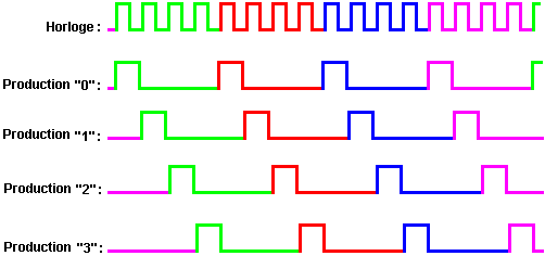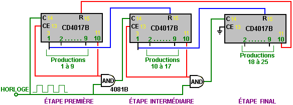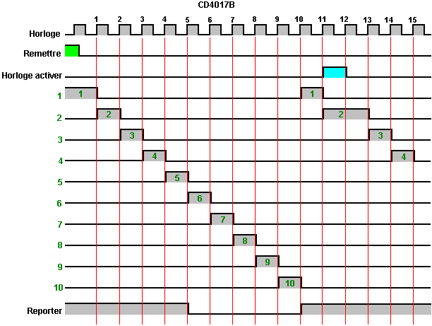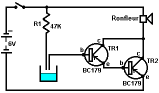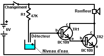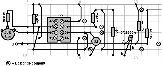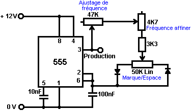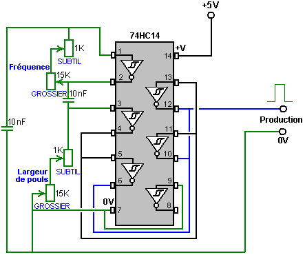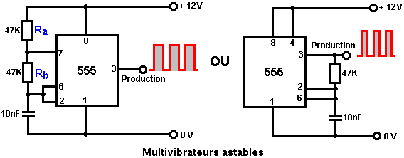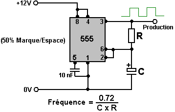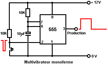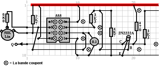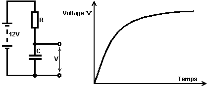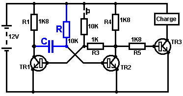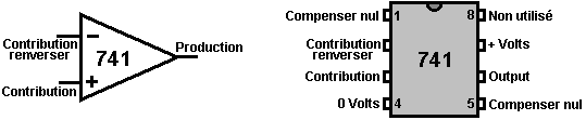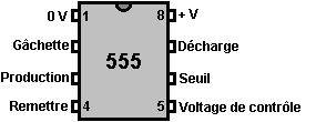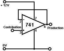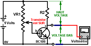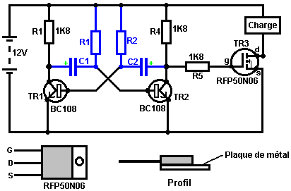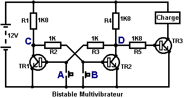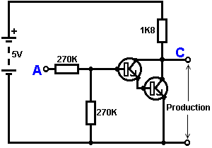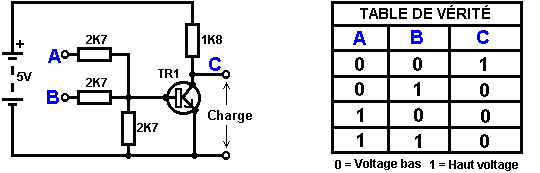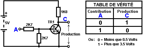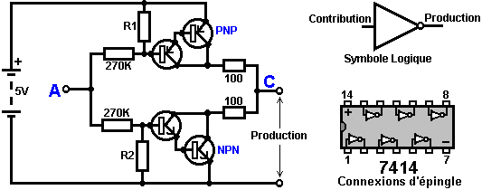 Le multivibrateur Astable. Le circuit astable est le monoferme avec un deuxième condensateur ajouté pour qu'aucun état ne soit ferme. Cela s'ensuit dans le circuit s'effondrant à reculons et en avant constamment : ![]() Le taux du fait d'échanger est contrôlé par le R1/C1 et les combinaisons R2/C2. On appelle la charge À TEMPS à son du temps le rapport 'spatial de marque', où le SUR la période est 'la marque' et LE de la période est 'l'espace'. Si vous voulez utiliser des condensateurs électrolytiques qui ont leur propre polarité, donc la fin de ve de chaque condensateur est raccordée au collectionneur de transistor. Pendant qu'il est bon de comprendre comment ces circuits de multivibrateur opèrent et peuvent être construits, de nos jours il y a des circuits pré-construits encased dans un paquet simple que vous voudrez beaucoup mieux utiliser. On appelle ceux-ci les Circuits intégrés ou ‘ICs’ pour court. Nous discuterons ceux-ci bientôt. Avant que nous faisons, remarquez que dans le circuit ci-dessus, le transistor TR3 a été changé à une nouvelle variété a appelé un Transistor d'Effet de Terrain (‘FET’). Ce type de transistor est plus nouveau que les transistors ‘bipolar’ montrés dans les plus premiers circuits. FETs entrent dans deux variétés : 'le n-canal' qui ressemblent aux transistors NPN et 'au p-canal' qui ressemblent aux transistors PNP. FETs sont plus difficiles de faire, mais avoir maintenant atteint un niveau de prix et d'intégrité qui les rend très utiles effectivement. Ils n'exigent presque aucun courant basé (appelé le courant 'de porte' avec ce type de transistor) qui signifie qu'ils n'ont presque aucun effet sur n'importe quel circuit auquel ils sont attachés. Aussi, beaucoup d'entre eux peuvent manipuler de grands courants et se vanter le pouvoir important manipulant des capacités. À cause de cela, il est ordinaire de les voir packaged avec une plaque en métal montante, prête à être verrouillé à une plaque d'évier de chaleur en aluminium pour aider à dissiper la chaleur produite par la grande quantité de pouvoir coulant par eux. Le 'RFP50N06' montré ci-dessus peut manipuler jusqu'à 50 volts et porter jusqu'à 60 Ampères, qui est la manipulation de pouvoir sérieuse. Inverters Considérez le circuit suivant : ![]() Si aucun des changements de bouton-poussoir n'est fait marcher, le transistor n'a aucun écoulement de courant de base/émetteur et donc c'est débranché. Cela place le voltage de collectionneur à 'C' près du rail positif (5 volts). Si le bouton-poussoir échange le fait d'être fait marcher, le voltage basé essaie de monter à la moitié du voltage de batterie, mais ne le fait pas parce que la base de transistor l'accroche à 0.7 volts. Cela nourrit le courant basé au transistor, en l'échangeant durement sur et en provoquant la production à 'C' tomber à presque 0 volts. Si le changement de bouton-poussoir ‘B’ est fait marcher (ne le font pas quand échangent le fait d'être fermé ou vous recevrez un très haut courant 'de court-circuit' coulant directement par les deux changements) il n'a aucun effet sur la tension de sortie qui restera haute. Si nous redessinons le circuit comme cela : ![]() Nous pouvons le voir si le voltage à la contribution le fait d'être pris haut, donc la tension de sortie à 'C' sera basse. Si le voltage à la contribution le fait d'être pris bas, donc la tension de sortie à 'C' sera haute. On appelle un circuit qui le fait un 'Inverter' parce qu'il 'inverse' (ou ‘tourne à l'envers’) la tension d'entrée. Nous pouvons résumer cette opération dans une table. Personnellement, j'appellerais la table une table 'd'Entrée/sortie', mais pour aucune raison évidente, le nom standard est une table 'de Vérité'. Le but de cette table est d'énumérer toutes les contributions possibles et le spectacle la production correspondante pour chaque contribution. Une autre norme, doit remplacer ‘1’ au 'Haut Voltage’ et ‘0’ pour le 'Voltage Bas’. Vous remarquerez que beaucoup d'articles d'équipement électrique et électronique ont ces symboles sur le SUR / du changement. Dans l'ensemble de circuits informatique (hah! vous n'avez pas remarqué que nous avions bougé aux circuits informatiques, n'est-ce pas ?), 'le 0' représente n'importe quel voltage au-dessous de 0.5 volts et 'le 1' représente n'importe quel voltage au-dessus de 3.5 volts. Beaucoup, si pas le plus, les ordinateurs font marcher leurs circuits logiques sur 5 Volts. Ce circuit Inverter est un circuit 'logique'. Une critique sur le susdit circuit est que sa résistance de contribution ou 'impédance' ne sont pas particulièrement hauts et son impédance de production n'est pas particulièrement basse. Nous voudrions que nos circuits logiques soient en mesure de faire marcher les contributions de huit autres circuits logiques. Le jargon pour cela est que notre circuit devrait avoir 'le fait de se déployer en éventail' de huit. Allons pour une modification simple qui améliorera la situation : ![]() Ici, l'impédance de contribution a été augmentée par un facteur de 100 en utilisant une paire Darlington de transistors qui ont besoin de beaucoup moins de courant basé et peuvent ainsi avoir une beaucoup plus haute résistance de contribution. Malheureusement, l'impédance de production est toujours assez haute quand les transistors sont dans leur de l'état comme n'importe quel courant pris de la ligne positive doit couler par le 1K8 la résistance (de 1800 ohms). Mais nous avons besoin de cette résistance pour quand les transistors sont dans leur SUR l'état. Nous avons vraiment besoin de changer le 1K8 la résistance pour un artifice qui a une haute résistance à quelques fois et à une résistance basse à d'autres temps. Vous n'avez pas sans doute entendu de ces artifices, mais on les appelle 'les transistors'. Il y a plusieurs façons de le faire. Nous pourrions vouloir utiliser de
