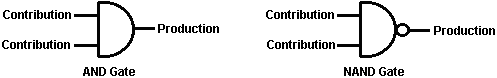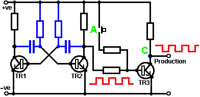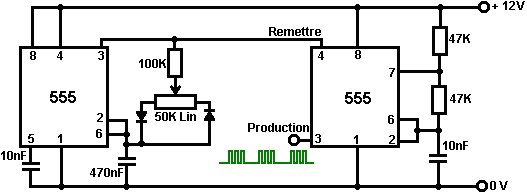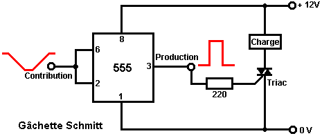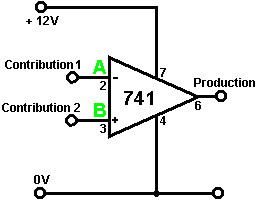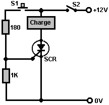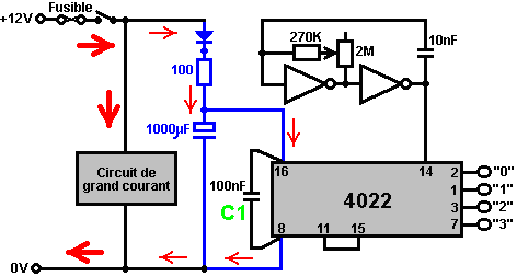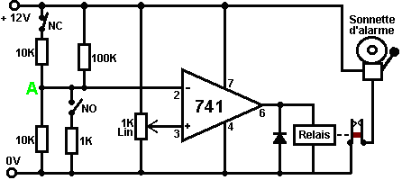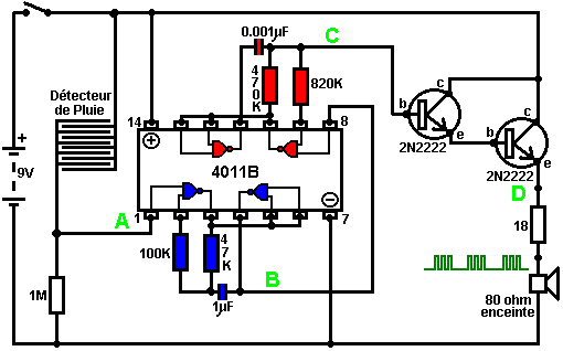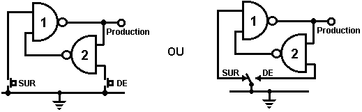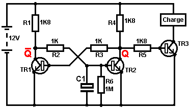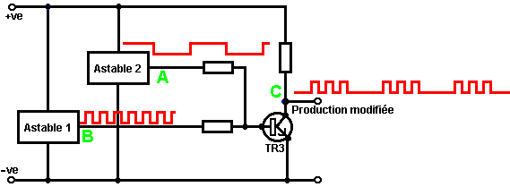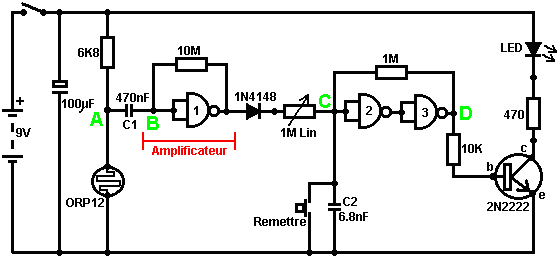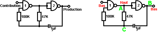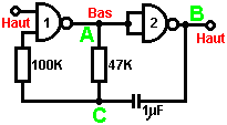 Ainsi pourquoi ce circuit oscille-t-il ? : ![]() Le circuit n'oscillera pas si la contribution gating est basse, supposez ainsi que c'est haut. Prenez le moment où la production de porte 2 est basse. Pour cela pour arriver, les contributions de porte 2 doivent être hautes. Comme la production de porte 1 est télégraphiée directement aux contributions de porte 2, cela doit être haut et pour cela pour être vrai, au moins une de ses contributions doit être basse. Cette situation est montrée à droite. Il y a maintenant une goutte de voltage complète entre le point ‘A’ et le point ‘B’. La résistance de 47K et le condensateur sont en série à travers cette goutte de voltage, donc le condensateur commence à monter à toute vitesse, en levant progressivement le voltage au point ‘C’. Plus bas la valeur de la résistance, plus vite les augmentations de voltage. Plus grand la valeur du condensateur, plus lentement les augmentations de voltage. Quand le voltage au point les augmentations de 'C' suffisamment, la résistance de 100K lève la tension d'entrée de porte 1 assez loin pour le faire changer l'état. Cela crée la situation suivante : ![]() Maintenant, le voltage à travers ‘A’ à 'B' est inversé et le voltage au point ‘C’ commence à tomber, son taux gouverné par la grandeur de la résistance de 47K et du 1 condensateur microfarad. Quand le voltage au point ‘C’ tombe assez bas, il prend la contribution de porte 1 assez bas (via la résistance de 100K) pour faire la porte 1 échanger l'état de nouveau. Cela prend le circuit à l'état initial discuté. C'est pourquoi le circuit oscille constamment jusqu'à ce que la contribution gating de porte 1 ne soit prise bas pour bloquer l'oscillation. Maintenant, voici un circuit de porte NAND pour un séquentiel Sur/De le changement : ![]() Ce circuit allume la Diode Émettante Claire et de plusieurs fois avec chaque opération du changement de bouton-poussoir. Quand le Sur/De le changement est fermé, ‘C1’ de condensateur tient le voltage au point ‘A’ bas. Cela conduit la production de porte 1 haut, qui déplace les contributions de porte 2 haut via la résistance de 100K ‘R1’. Cela conduit le voltage au point ‘B’ bas, en éteignant le transistor, qui fait le MENÉ rester à la maison son de l'état. Le voltage bas au point ‘B’ est nourri en arrière via la résistance de 100K ‘R2’ pour montrer ‘A’, en le gardant bas. C'est le premier état ferme. Comme la production de porte 1 est des charges de 'C2' hautes, de condensateur jusqu'à ce voltage via le 2M2 la résistance. Si le changement de bouton-poussoir est fait marcher brièvement, le haut voltage de 'C2' lève le voltage de point ‘A’, en provoquant la porte 1 changer l'état et par conséquent, la porte 2 pour changer l'état aussi. De nouveau, le haut voltage au point ‘B’ est nourri en arrière pour montrer ‘A’ via la résistance de 100K ‘R2’, en le gardant haut, en maintenant la situation. C'est le deuxième état ferme. Dans cet état, montrez ‘B’ a un haut voltage et cela nourrit la base du transistor via le 4.7K la résistance, en l'allumant et en allumant le MENÉ. Dans ce deuxième état, la production de porte 1 est basse, ainsi les renvois de 'C2' de condensateur rapidement à un voltage bas. Si le changement de bouton-poussoir est fait marcher de nouveau, le voltage bas de trajets de 'C2' montrent ‘A’ bas de nouveau, en faisant le circuit mal tourner à son état ferme original. Nous, si nous avons voulu, pourrions modifier le circuit pour qu'il opère depuis trois ou quatre minutes après le changement - sur, mais arrêterait alors d'opérer jusqu'à ce que le circuit n'ait été éteint et sur de nouveau. C'est accompli par gating une des portes au lieu de juste utiliser tous les deux comme inverters. Si nous gated la deuxième porte, donc le MENÉ serait quitté en permanence sur, donc nous modifierons le premier circuit de porte : ![]() Ce circuit fait marcher exactement la même voie que le circuit précédent si et seulement si, le voltage au point ‘C’ est haut. Avec le voltage au point ‘C’ haut, la porte 1 est libre de réagir au voltage au point ‘A’ comme auparavant. Si le voltage au point ‘C’ est bas, il ferme la production de porte 1 au haut niveau, en forçant la production de porte 2 au niveau bas et en repoussant le MENÉ. Quand le circuit est d'abord actionné en haut, les 100 nouveaux ‘C3’ microfarad de condensateur est complètement renvoyé, qui tire le voltage au point ‘C’ à presque 9 volts. Cela permet à la porte 1 d'opérer librement et le MENÉ peut être toggled sur et de comme auparavant. Comme les laisser-passer de temps, la charge sur ‘C3’ de condensateur s'accumule, nourri par le 2M2 la résistance. Cela fait le voltage au point ‘C’ tomber progressivement. Le taux de chute est gouverné par la grandeur du condensateur et de la grandeur de la résistance. Plus grand la résistance, plus lentement la chute. Plus grand le condensateur, plus lentement la chute. Les valeurs montrées sont d'aussi grand que sont pratiques, en raison 'de la fuite' actuelle de 'C3'. Après trois ou quatre minutes, le voltage au point ‘C’ est poussé assez bas à faire marcher la porte 1 et prévenir l'opération de plus du circuit. Ce type de circuit pourrait faire partie d'un jeu compétitif où les concurrents ont un temps limité pour accomplir une tâche. Les portes peuvent aussi être utilisées comme les amplificateurs bien qu'ils ne soient pas destinés pour être utilisés que la voie et il y a de bien meilleurs circuits intégrés de quel construire des amplificateurs. Le circuit suivant montre comment cela peut être fait : ![]() Ce circuit opère quand il y a un changement soudain dans le niveau clair. Le niveau clair précédent échangeant le circuit a été conçu pour déclencher à un niveau particulier d'augmentation ou de diminution du n