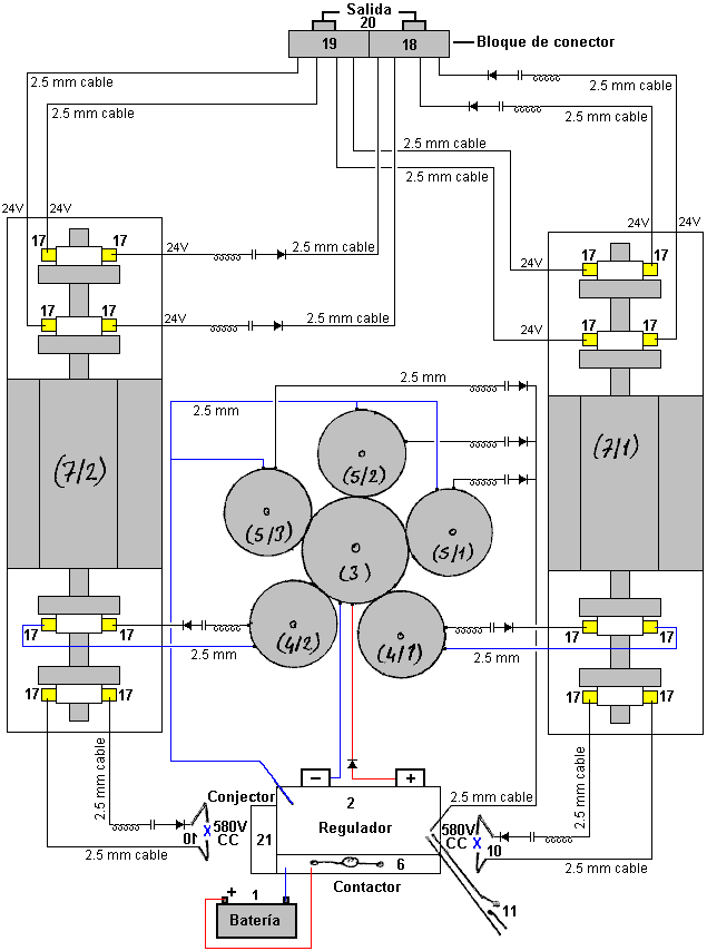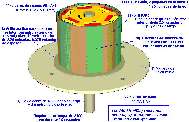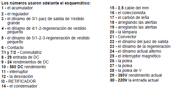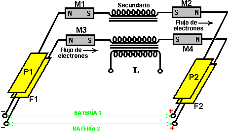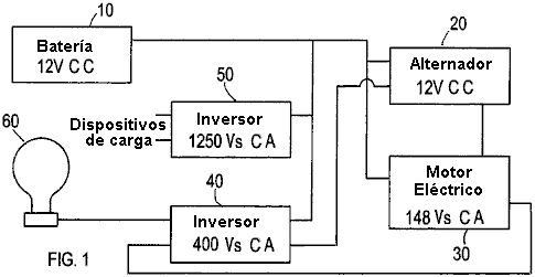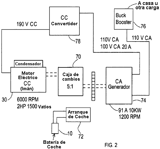 La energía eléctrica ocurre naturalmente, pero raramente en formas que pueden usarse. Por ejemplo, aunque la energía disipó como el relámpago excede la demanda del mundo para electricidad por un factor grande, el relámpago no ha estado ponga al uso práctico debido a sus imprevisibilidad y otros problemas. Generalmente, el eléctrico-poder práctico-los sistemas generadores convierten la energía mecánica de pasar las partes a la energía eléctrica. Mientras sistemas que operan sin un paso mecánic o existen, ellos son en la actualidad o excesivamente ineficaces o caros debido a una dependencia en la tecnología detallada. Mientras algunas plantas eléctricas derivan la energía mecánica del agua mudanza (el poder hidroeléctrico), la inmensa mayoría lo deriva de artefactos de calor en que la substancia activa es de vapor. Bruscamente se generan 89% de poder en los Estados Unidos esta manera. El vapor se genera con el calor de la combustión de combustibles fósiles o del hendimiento nuclear. En electricidad, una máquina se usa para cambiar la energía mecánica en la energía eléctrica. Opera en el principio de inducción electromagnética. Cuando un conductor atraviesa un campo magnético, un voltaje es inducido por los extremos del conductor. El generador sim plemente es un arreglo mecánico por mover el conductor y llevando la corriente producida por el voltaje a un circuito externo dónde actúa dispositivos que requieren electricidad. En la forma más simple de generador, el conductor es un bobina abierto de alambre que rueda entre los polos de un imán permanente. Durante una sola rotación, un lado del bobina atraviesa el campo magnético primero en una dirección y entonces en el otro, para que la corriente inducido sea la corriente alterna (el CA), entrando una dirección primero, entonces en el otro. Cada extremo del bobina se ata a un anillo de resbalón de metal separado que rueda con el bobina. Se atan cepillos que descansan en los anillos del resbalón al circuito externo. Así los flujos actuales de la bobina al resbalón cercan, entonces a través de los cepillos al circuito externo. El Para obtener la corriente directa (DC), decir del es, corriente que los flujos en sólo una dirección, un conmutador se usa en lugar de los anillos del resbalón. Un conmutador es un solo anillo del resbalón se hendido en la izquierda y corrige mitades que se aíslan de nosotros y se atan a los extremos opuestos del bobina. Permite la corriente para dejar el generador a través de los cepillos en sólo una dirección. Esta corriente pulsa, mientras yendo de ningún flujo al flujo del máximo y atrás de nuevo a ningún flujo. Un generador de DC práctico, con muchos bobinas y con muchos segmentos en el conmutador, da una corriente más firme. Hay también varios imanes en un generador práctico. En cualquier generador, la asamblea entera que lleva los bobinas se llama la armadura, o rotor, mientras las partes estacionarias constituyen el estator. Exceptúe en el caso de la magneto que usa imanes permanentes, CA y generadores de DC usa los electroimanes. El campo actual para los electroimanes DC es el más a menudo de una fuente externa. El término dínamo se usa a menudo para el generador de DC; el generador en las aplicaciones automotores normalmente es un dínamo. Un generador del CA se llama un alternador. Para aliviar los varios problemas de la construcción, los alternadores tienen una armadura estacionaria y los electroimanes rodando. La mayoría del producto de los alternadores un CA del porfiase, un tipo complejo de corriente que proporciona, un fl ujo de poder más liso que hace el CA simple. Por lejano la más gran cantidad de electricidad para el uso industrial y civil viene de generadores del CA grandes manejados por las turbinas de vapor. EL RESUMEN DE LA INVENCIÓN Es un objetivo de la invención presente para proporcionar una fuente de energía que genera más energía que la fuente de energía exige para operar. Es un segundo objetivo de la invención presente para proporcionar un sistema que usa la energía del exceso producido por la fuente de energía para impulsar otros varios dispositivos. Es un tercer objetivo de la invención presente para mantener una fuente de energía el poder abastecedor a los varios dispositivos sin la confianza en una fuente de energía externa para el poder abastecedor a la fuente de energía de la invención presente. La invención presente proporciona una fuente de energía que es capaz de producir más energía que exige operar. La energía del exceso se usa para impulsar los dispositivos. Un acercamiento de vuelta de regeneración se usa para encauzar una porción del producto de energía atrás por el generador al poder de los generadores entre el puerto. Este acercamiento de vuelta de regeneración permite al generador usar su propia energía generada para operar. Se usa la energía adicional generada por el generador para impulsar otros dispositivos que pueden conectarse al generador. En el método de la invención una fuente de poder externa como una batería se usa para proporcionar el poder inicialmente para empezar un alter nador y generador. Una vez el sistema ha empezado que no es necesario para la batería proporcionar el poder al sistema. La batería puede ser desconectada entonces. El alternador y el trabajo del motor eléctrico en la combinación para generar el poder eléctrico. El alternador proporciona este poder eléctrico a los dos convertidores. Unos rendimientos del convertidor parten atrás de su poder al dispositivo de carga de lámpara y parte al motor/generador eléctrico. Este poder se usa para impulsar el motor eléctrico. El segundo convertidor proporciona el poder a los dispositivos de carga específicos que se conectan al sistema. LA DESCRIPCIÓN DE LOS DIBUJOS Fig.1 es una configuración de una aplicación del poder interior el sistema generador de la invención presente. Fig.2 es una configura