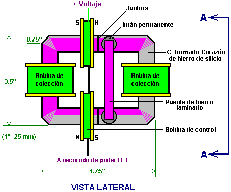 El “MEG”. Concedieron a Tom Bearden, Stephen Patrick, James Hayes, Kenneth Moore y James Kenny EE.UU Patentan 6,362,718 el 26 de marzo de 2002. Esta patente es para un generador electromagnético sin el movimiento de partes. Este dispositivo es dicho ser autoimpulsado y es descrito e ilustrado en el sitio Web de JL Naudin en aquí donde los resultados de prueba son mostrados. Mientras este dispositivo ha sido reclamado para tener una mayor salida que su entrada y una salida cinco veces más alto que la entrada ha sido mencionada, no soy consciente de alguien que ha intentado reproducir este dispositivo y ha conseguido COP> 1 interpretación, y tan, por esta razón, es descrito en esta sección que describe dispositivos que con poca probabilidad serán que vale la pena para el constructor de casa para intentar reproducirse. El “Generador Electromagnético Inmóvil” o “MEG" ("Motionless Electromagnetic Generator" en inglés) consiste en un anillo magnético con la herida de bobinas de salida en ello. Dentro del anillo es un imán permanente para proporcionar un flujo magnético estable alrededor del anillo. Sobrepuesto en el anillo son dos electroimanes que son activados uno tras otro para hacer el flujo magnético oscilar. Este muchísimo parece al dispositivo “VTA” de Floyd Sweet. ![]() La fuente de alimentación externa mostrada encima es querida para ser desconectado cuando el recorrido comienza a funcionar, en cual tiempo, la parte de la salida de uno de los bobinas de recogida es alimentada atrás para impulsar el recorrido que conduce los bobinas de oscilador. El recorrido entonces se hace autónomo, sin la entrada externa, pero con una salida eléctrica continua. Si usted debería construir a uno de éstos, por favor ser advertido que no debería ser arrancado a menos que haya una carga externa a través de los bobinas de recogida, los voltajes por otra parte peligrosos, potencialmente letales pueden ser producidos. No mátese o perjudicado - por favor tenga mucho cuidado. Un extracto expresado con otras palabras de la patente para este sistema, está en el Apéndice y esto da los detalles de construcción del prototipo: las dimensiones, el número de vueltas, materiales usados, conducen frecuencia, duraciones de pulso monoestables, etc. El prototipo produjo dos salidas de 48 vatios para una entrada de 12 vatios. Este permitió que el poder de entrada fuera tomado de una de las salidas, mientras que misma salida impulsaba otras cargas. Este dispositivo es esencialmente, un transformador hecho de encargo con dos cuerdas primarias (los bobinas de oscilador) y dos cuerdas secundarias (los bobinas de recogida), con un imán permanente insertado para crear un campo magnético permanente por el yugo (marco) del transformador. Sin embargo, un imán permanente tiene dos corrientes de energía separadas que vienen de ello. El campo principal es el campo magnético que es muy conocido. Esto normalmente se sale en cada dirección, pero en MEG, un camino de conducción muy bueno es proporcionado por el marco del dispositivo. Este atrapa el flujo de energía magnético y lo canaliza alrededor del interior el marco. Este lo impide enmascarar el segundo campo de energía que es el campo de energía Eléctrico. Con el campo magnético movido del camino, es posible ahora dar un toque a este campo de energía para la salida de poder adicional. MEG parece a un dispositivo muy simple, pero en realidad, no es. Actuar como un dispositivo acertado con un Coeficiente de Interpretación (“COP” o “Coefficient Of Performance” en inglés) más de 1, donde el poder de entrada que es proporcionado es menos que la salida de poder útil del dispositivo, entonces Tom dice que el marco tiene que ser hecho de un material nanocrystalline. Este material tiene propiedades especiales que dan a MEG esto es la salida excepcional. El cuidado tiene que ser tomado con este dispositivo cuando el poder de salida puede ser tan alto que esto puede quemar el aislamiento de los alambres y destruir el dispositivo si el poder de salida no es controlado con cuidado. El poder de salida es normalmente limitado con COP=5.4 por motivos prácticos. Si el poder de entrada necesario es tomado del poder de salida vía un recorrido de control riguroso que previene al fugitivo, entonces el dispositivo puede proporcionar el poder de salida mientras ningún poder de entrada exterior es necesario. El poder de salida es controlado por la forma de onda enviada a los bobinas de oscilador. El poder es controlado por la forma exacta “de la onda cuadrada” impulso del recorrido: ![]() Esta forma de onda es ajustada con cuidado para contener el C.O.P. a 5.4 para el bien de seguridad. La forma de onda es también ajustable para proporción de Señal/Espacio y frecuencia. Cuando esto es algunos años desde este dispositivo fue patentado, la pregunta puede ser hecha en cuanto a por qué esto no está en la producción y ofrecido para la venta en todas partes. La razón es que MEG es un prototipo de laboratorio que necesita el ajuste cuidadoso y pellizcar. Ha sido reproducido por otros y esto es la interpretación verificada como siendo C.O.P.> 1, pero no está todavía listo para la producción donde es necesario hacer realzar el diseño a la etapa que puede ser reunido en una fábrica y trabajo inmediatamente sin la necesidad de ajustes manuales. Aquel desarrollo está en la mano y puede ser completado en el próximo año o dos. Un poco de explicación adicional consiste en a fin de. MEG tiene una eficacia total, bajo del 100 % a pesar de tener un C.O.P. bien superior a 1. El C.O.P. de 5.4 mencionó antes es una figura arbitraria seleccionada por los diseñadores para impedir el aislamiento ser quemado de los alambres de salida. La salida máxima actual es casi ilimitada, ciertamente un C.O.P. de 100 es absolutamente posible, pero completamente innecesario en términos prácticos. Si el yugo de hierro laminado de un estándar es u