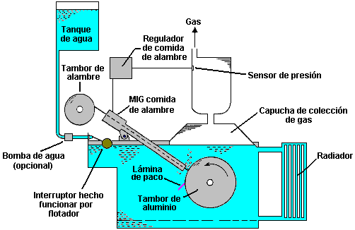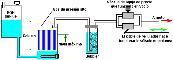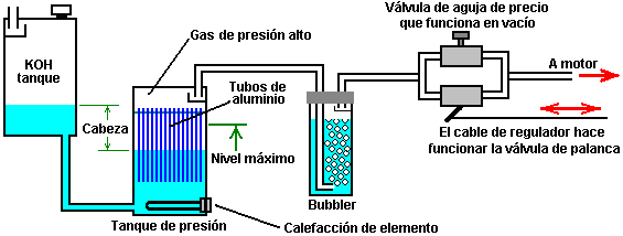 Hay también muchos problemas con el plan de la cámara de la reacción y simplemente puso, aun cuando usted lo consiguió trabajar usted necesitaríian más de estas unidades que usted podría ebcajar en la vida en su automóvil para pensar casi corriendo incluso el artefacto. Simplemente ponga, la unidad no creará bastante gas para ejecutar mucho de algo. No me consiga, yo, extraviarse piense que la idea es GRANDE y que puede harcerse. La cámara de la reacción: El arregio de cámara de reacción sugerido es: ![]() Se sugiere que usted use una sección de 4" PVC la cañería desechada con un tornillo-gorra enhebrado que encaja en un extremo y un extremo-gorra normal al otro. Asegurese a taladro-y-epoxi o hilos de la palmadita a través de los componentes de PVC para todos los montajes. Ponga y controle el nivel de agua en la cámara para que los electrodos de la cañería se cubran bien y allí todavía es los amplios espacio de cabeza salieron para construir a la presión de gas de hidrogena/oxigeno. Use los alambres de acero limpios dentro de la cámara o por otra parte use una capa proteccionista; el uso a isló los alambres fuera. Asegure que las focas del epoxi son perfectas o alternativamente, extienda una cuenta de silicona de la agua-prueba suficiente sostener la presión. El montaje del tomillo puede requerir el silicona suave, o una empaquetadura. Su propósito es mantener la presión en el cilindro y todavia permitir inspeccion periodica de los electrodos. Asegúrese que no hay ninguna gotera y usted quiere no tenga ningún problema. Asegurese que usted consigue un 1.5 hueco del mm simetric o entre las 2 cañerías de acero limpias. La literatura del referenciado sugiere que el más íntimo a 1 mm usted consigue, el bueno. El cheque que el agua de la cámara del la - los el sensor nivelado está trabajando correctamente apuestan el usted el epoxi su gorra en el lugar. El los Haga sus conexiones del la soldadura del la une las uniones del alambran / el bueno del electrodo, el aplane del él, el sólido del el de y; la entonces aplique una capa impermeable, ejemplo del por el epoxi que usted usa por un ie las cañerías un la gorra del tornillos. El Este epoxi deben ser impermeables él y deben ser capaz de metal de la tenencia un plástico bajo la presiones. El circuito sugerido para la cámara de la reaccion el mando de la bomba agua-nivelado es: ![]() El hidrógeno de Aluminio. Desde 2003 Tecnologías de Rothman de Canadá han estado ejecutando un 12 HP el motor de gasolina en hidrógeno producido por un proceso químico. Éste es un proceso barato en que metalse consume y para que, aunque de gran interés, ésta no es una libre-energía de ‘el artefacto de'. Una reciente aplicación patente por William Brinkley un sistema dónde las cañerías de aluminio son consumidas por una 25% solución de Potasio Hidróxido calentado a 180 grados Fahrenheit propone. William comenta en la naturaleza non-contaminante del sistema, pero esto no es muy para que en que un a cantidad muy grande deenergía tiene que ser puesta en producir el metal de aluminio en el proceso fundiendo y refina, y la poluciónsimplemente se mueve del usuario terminal a la planta industrial, y muy más pretenciosamente, el óxido de aluminio producido es muy el tóxico y causas una gama amplia de enfermedades serias incluso Alzheimer. Francis Cornish del REINO UNIDO tiene un sistema dónde la electrólisis de agua se combina con un procesoquímico que consume el alambre de aluminio. El sistema trabaja bien, pero yo tengo las reservaciones sobre usar consumibles que lo ata a la fabricación industrial, también las preocupaciones sobre la fiabilidad desistemas del alimento mecánicos cuando ellos están usándose por las personas non-técnicas (más chóferesdel automóvil). Hay también el problema de quitar y reciclar el residuo químico generado por el proceso. Yo no soy personalmente perspicaz en los procesos del químico y yo no recomiendo que usted construya algo basado en la descripción siguiente. Sin embargo, podría ser posible adaptar el sistema de Brinkley para que opere sin las partes mudanza: ![]() Aquí, hay un tanque del título que contiene una 25% mezcla de Potasio Hidróxido (KOH) en el agua. Este tanque se posiciona superior que el tanque de presión dónde el gas de hidrógeno se genera y la cañería dando salida es protegida por una confusión. La cañería dando salida debe proporcionar una toma de corriente al aire fuera del vehículo o construyendo qué contiene el sistema. Inicialmente, la solución de KOH en el tanque de presión está acalorada por el elemento calorífico, pero cuando el proceso se empieza, genera el calor para mantener la reacción química. La generación de gas entonces las figuras a la presión en el tanque de presión fuertemente-construido. La presión levantada empuja alguna de la solución de KOH atrás en el tanque del título, contra la gravedad. Esto reduce el área de aluminio expuesta a la solución de KOH y reduce la proporción de producción de gas. Esto crea un gas producción propor ción mando automatizado que no tiene ninguna parte mudanza eficazmente. Si la proporción de gas tomada por los aumentos del artefacto que bajan la presión en el tanque de presión mientras permitiendo más solución de KOH para encontrarse con el tanque de presión, aumentando la proporción de producción de gas. Cuando el artefacto se detiene completamente, entonces la solución de KOH se empuja en el tanque del título hasta toda la producción de gas detiene, como mostrado aquí: ![]() Esto parece como si el tanque de presión está bajo la presión considerable, pero eso no es para que, cuando el tanque del título es abra a la presión atmosférica. Yo tengo las preocupaciones sobre controlar los procesoscompletamente químicos rápidamente bastante para el uso práctico. El sistema anterior se satisfaría más a un artefacto fijo, como un generador eléctric