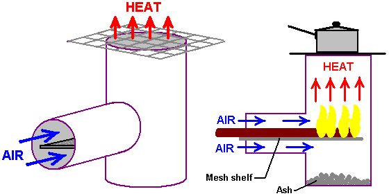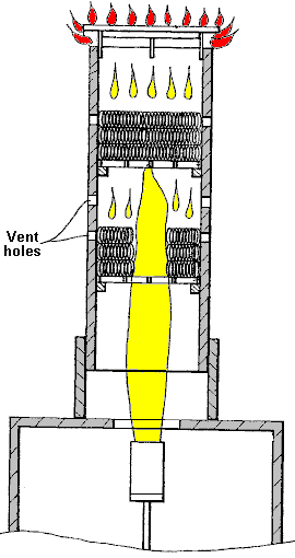 Heaters The devices described here are probably not “free-energy” devices as such, but in spite of that, it is an area of considerable interest to many people, and the subject is included here because of that. If you do not live in an urban area, then a solid fuel stove can be an economic solution, especially if the fuel can be collected free from wooded areas. Stove design has advanced considerably and it is now possible to make a simple stove with very high efficiency and very low emissions as shown here: ![]() Although this stove is a very simple construction, it’s efficiency is very high indeed. The best fuel is made of smaller pieces which rest on a simple shelf. Branches work better than large pieces of wood as the consumption is more complete. As the fuel is consumed, it is pushed further into the stove, which gives the user an appreciation of the rate of consumption. Having the fuel resting on a shelf has the major advantage of allowing air to flow both above it and below it, which gives improved combustion. The operation is said to be so good that there is virtually no residue and no emissions. Again, if land space is available, a solar oven (or Stirling motor) can be used, either to store energy for later use or generate heat for cooking or home heating, as can hot-water solar panels. However, it is only realistic to consider the application to be during the night in a built-up area with little or no spare space for equipment. The Wood-gas Stove There is another very effective type of wood-burning stove. There are several commercial versions of this stove on sale, but most of them use an electric fan to get the effect which is produced automatically by this design. This design has been replicated by Alberto Feliciano and found to be very effective in operation. It causes a load of wood which would normally burn up in fifteen minutes to burn for a whole hour, putting out a much greater amount of heat. The design is very straightforward. There is an outer drum which has a solid base, and the opposite end removed entirely as shown here: ![]() A ring of ventilation holes is drilled around the whole of the bottom edge of the drum and threaded rods are run through the drum. These support a circle of wire mesh which forms a supporting shelf. A smaller drum then has both ends removed, to form a cylinder. This cylinder is to fit inside the outer drum. It rests on the mesh shelf of the outer drum. This cylinder has a ring of ventilation holes is drilled around the whole of it’s upper edge as shown here: ![]() A third drum which is only slightly smaller than the outer drum is cut down to make a cap for the inner cylinder. This cap is not tight-fitting, but it effectively closes off the top of the gap between the sides of inner cylinder and the sides of the outer drum: ![]() This cap has a circular hole cut in it, and this hole is only slightly smaller than the diameter of the inner cylinder. It is supported by the upper lip of the inner drum but the hole is large enough that it does not obstruct the flow of heat up through the top of the inner drum. These three pieces fit together like this: ![]() Wood of any type, branches, sticks, firewood, etc. are placed inside the inner cylinder and set alight. Initially, the flames come out of the top of the stove as you would expect, but after a few minutes, the combustion alters completely. The burn now becomes that of wood-gas rather than of the wood itself. The wood is slowly converted to charcoal and the gas released by this process burns with greater heat than the wood would give as well as burning for a much greater length of time. This stove design can be made in any size. Small versions get a burn length of about three times that of the wood burning in the open air, while large versions can reach four times the burn length. Flames no longer come out of the top of the stove, but instead, they come out of the ring of holes around the base of the outer drum. The process is like this: ![]() A high-temperature gas burn takes place in the centre of the inner cylinder. This pushes heat out through the top and the bottom of the inner cylinder. The heat flowing out of the top is used for heating or cooking as before. The heat flowing out of the bottom gets diverted around the outside of the inner drum, flows upwards, is caught by the cap and fed back into the inner cylinder through the ring of holes at the top of the inner cylinder. This raises the temperature of the gas burn even further and it augments the heat coming out of the top of the stove. The result is a very hot burn which goes on far longer than would happen if the same wood was burnt on an open fire or in a single open drum. When the wood reaches the end of it’s burn cycle, it can be replaced by feeding new wood through the hole in the cap which rests on the inner cylinder. The stove will need to be emptied of ash from time to time. Mr Teslonian’s Heating / Fuel-producing / Electricity and Refrigeration System The Wood-gas stove shown above has been taken several steps further by “Mr Teslonian” as shown in his videos: here and here where he burns twigs in a home-made wood-gas furnace, heats his house, heats his water, produces engine fuel, runs an electricity generator off the gas and powers a refrigerator. All that, from a few twigs! This is very impressive and he is definitely to be congratulated for his development. His basic wood-gas stove can produce flames up to eight feet (2.5m) tall when operating very effectively on just a few handfuls of short twigs and branches. It looks like this: ![]() This very effective wood burner produces enough heat to heat a house and produce hot water. The wood-gas can also be used to produce both crude oil and fairly well-refined oil which can be used in an engine: ![]() And as you can see from the picture above, the wood-gas can run an electricity generator. There is a world of difference between burning wood like this and a typical