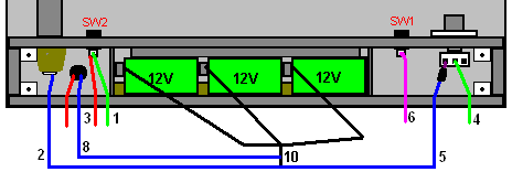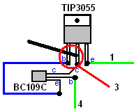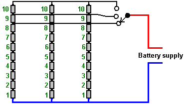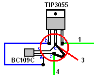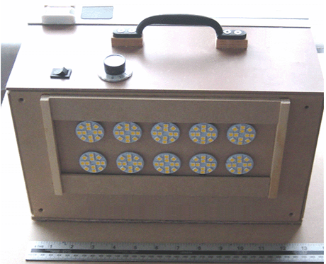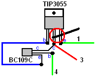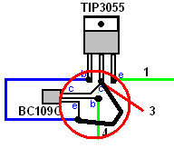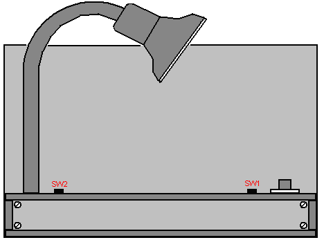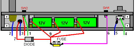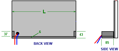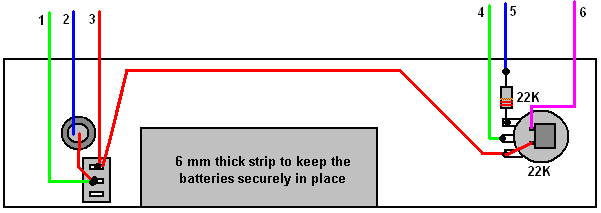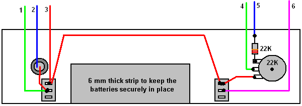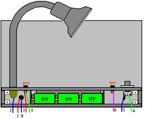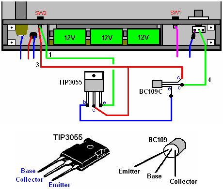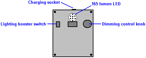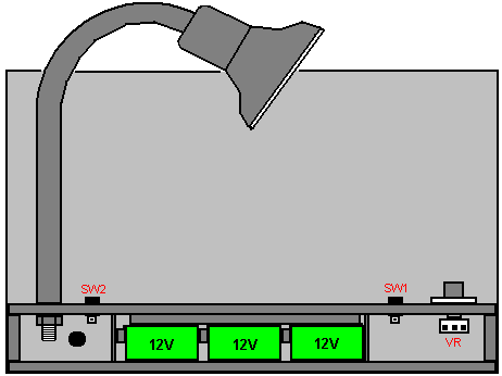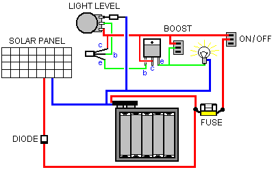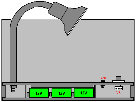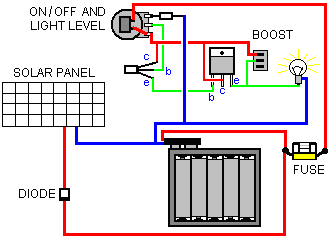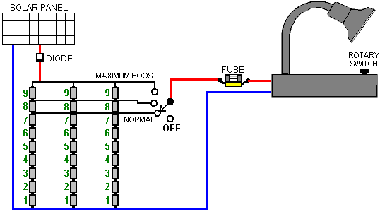 1. One 10-watt, 12-volt solar panel. 2. Thirty AA-size, 1.2V NiMh batteries with a capacity near 3000 mAHr if possible. 3. Three AA battery boxes each holding 10 batteries. 4. Three battery clip connectors to fit the battery boxes. 5. One 1-amp diode type 1N4007 or similar. 6. One 22K Linear variable resistor and graduated knob to fit the shaft diameter. 7. One 10% quarter watt (or higher rated) 22K resistor (colour bands red/red/orange) 8. One BC109C transistor. 9. One TIP3055 transistor. 10. Five G4 LED arrays. 11. One desk lamp (optional) 12. Two rocker switches. 13. One fuse holder (of any type) and a 1-amp fuse. 14. Ten metres of insulated, stranded wire rated for 1-amp or higher current. 15. Rigid sheet material 6 mm thick (possibly MDF). 16. One small off-cut of laminate flooring 85 x L (typically 337) mm 17. Adhesive. 18. Rubber feet or soft material for the underside of the desk lamp. Notes: Rocker switches are generally cheaper as the Change-over version with three switch tags, and so these have been shown. For this design, only On/Off action is needed. Press the “1” end of the rocker down, and the two contacts used are then the two farthest away from the “1”. The TIP3055 transistor is the more recent version of the 2N3055 and is a particularly good transistor for this application being much easier to connect to. While the TIP3055 is strongly recommended, other power transistors may be used. No heat sink is needed if the transistor can handle 8 amps or more (the TIP3055 can handle 15 amps and 90 watts). The BC109C transistor has a very high gain between 200 and 800, which is useful in this application, but a major advantage of it is that it switches off fully with pretty much zero leakage current, while I have some of the very popular 2N2222 transistors which don’t switch off properly at all and so are effectively rejects. Most alternative transistors are highly inferior to the BC109C and so, if it is not readily available, then it is worth ordering. The 1N4007 diode is the cheapest readily available diode. It is rated for 1000-volt operation which is of course, of no interest here and so the lower voltage 1N4001 through 1N4006 diodes are perfectly suitable although slightly more expensive as they are less popular. While one diode is shown in this document, people who are expert in electronics are inclined to use three connected in parallel as that passes current more freely. That would cost an extra 6 pence at 1-off prices in the UK. Some people are really put off by electronics of any kind, so here is a version of the solar desk lamp which effectively, has no electronics at all: ![]() The only control on this version is the On/Off switch. As we no longer have any control over the voltage applied to the LED arrays installed in the lamp shade, and since that voltage controls dramatic changes in current draw, we need to reduce the number of 1.2V NiMh batteries from ten to seven. It is a matter of choice whether you use three or four sets of seven batteries. If 10-battery battery boxes are used, then a wire can be soldered across the gap left by the three omitted batteries. The general construction is the same as before, with a rocker On/Off switch being installed instead of the variable resistor. As with all of these solar units, the important thing is to switch the light off when it is not in use, to avoid the next charging session being hindered by unwanted current draw through the light. The general layout of the unit can be the same: ![]() There are other variations which can be low-cost and very versatile. For example, instead of connecting the three battery packs together, they can be kept separate from each other, individually housed with the same circuit, each driving one of the LED arrays: ![]() Here, three identical units are charged from the solar panel, which can be any size or wattage, although a ten-watt panel would be considered to be the minimum for daily use. Each unit is in effect, just a wide-beam, high-intensity, high-capacity solar torch which can be dimmed and which will stand securely when unsupported. It has the advantage that the units can be constructed one at a time, and if necessary due to time constraints, or perhaps, very poor daylight, just two or even one unit can be charged from the entire solar panel output. If manufactured and sold, then the units could be sold separately, allowing a lighting system to be extended and improved when additional funds become available (or when the user has tried one unit and discovered how effective it is). Each unit is easy to understand and use: ![]() A built unit of this type looks like this from the front: ![]() and like this from the back: ![]() While these particular units have just one of the LED arrays each, tests run since that construction show that with manual dimming control, two LED arrays per unit would be more satisfactory. Also, if the second LED array is mounted on the side of the box, then the lighting angle increases from 160 degrees to 250 degrees which should be helpful for indoor lighting of a room. The units could, of course, be used in different rooms simultaneously and there is the option of carrying one around for lighting anywhere. Again, the construction is very simple and the same circuit as for the desk lamp shown above, can be used in each box. If good-quality NiMh AA-size batteries are used, each of the mobile units is capable of providing good light for eight hours, which means that if it gets dark at 4 pm (16:00), lighting is available until midnight as a minimum, at which point in time, the user should be going to sleep. If a very powerful single source of lighting is needed, it is possible to use a larger solar panel, or for a more compact unit, two of the 12-volt 10-watt panels shown above. The arrangement can use the same simple manual control of lighting level and the same booster switch for even greater lighting for a few minutes. The arrangement can be like this: 
