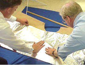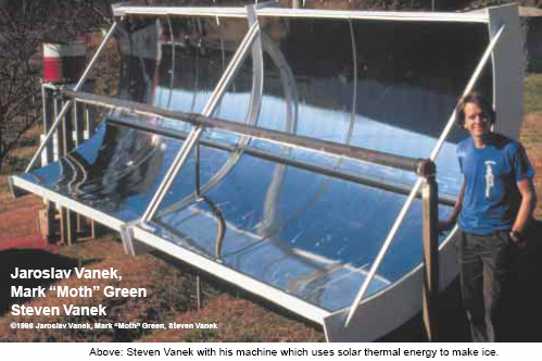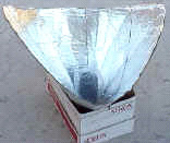 During the day, the sun's rays are reflected on to the cooking vessel which becomes hot quickly. At night, heat from the vessel is radiated outward, towards empty space, which is very cold indeed (a "heat sink"). As a result, the cooking vessel now becomes a small refrigerator. We routinely achieve cooling of about 20º F (10º C) below ambient air temperature using this remarkably simple scheme. In September 1999, we placed two funnels out in the evening, with double-bagged jars inside. One jar was on a block of wood and the other was suspended in the funnel using fishing line. The temperature that evening (in Provo, Utah) was 78º F (25.5º C). Using a Radio Shack indoor/outdoor thermometer, a BYU student (Colter Paulson) measured the temperature inside the funnel and outside in the open air. He found that the temperature of the air inside the funnel dropped quickly by about 15º F (8º C), as its heat was radiated upwards in the clear sky. That night, the minimum outdoor air temperature measured was 47.5º F (8.6º C) - but the water in both jars had ICE. I invite others to try this, and please let me know if you get ice at 55 or even 60 degrees outside air temperature (minimum at night). A black PVC container may work even better than a black-painted jar, since PVC is a good infrared radiator - these matters are still being studied. I would like to see the "Funnel Refrigerator" tried in desert climates, especially where freezing temperatures are rarely reached. It should be possible in this way to cheaply make ice for Hutus in Rwanda and for aborigines in Australia, without using any electricity or other modern "tricks." We are in effect bringing some of the cold of space to a little corner on earth. Please let me know how this works for you. Conclusion: Why We Need Solar Cookers The BYU Funnel Cooker/Cooler can: