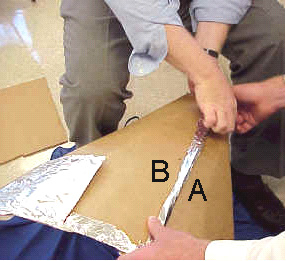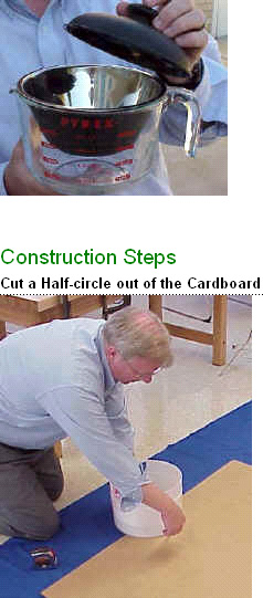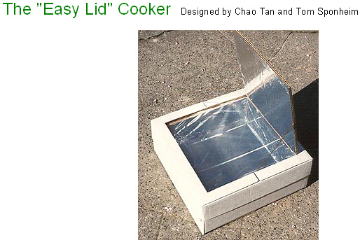 ![]() Cut a half circle out of the cardboard, along the bottom as shown below. When the funnel is formed, this becomes a full-circle and should be wide enough to go around your cooking pot. So for a 7" diameter cooking pot, the radius of the half-circle is 7". For a quart canning jar such as I use, I cut a 5" radius half-circle out of the cardboard. ![]() To form the funnel, you will bring side A towards side B, as shown in the figure. The aluminium foil must go on the INSIDE of the funnel. Do this slowly, helping the cardboard to the shape of a funnel by using one hand to form creases that radiate out from the half-circle. Work your way around the funnel, bending it in stages to form the funnel shape, until the two sides overlap and the half-circle forms a complete circle. The aluminium foil will go on the INSIDE of funnel. Open the funnel and lay it flat, "inside up", in preparation for the next step. Glue Foil to Cardboard ![]() Apply glue or adhesive to the top (inner) surface of the cardboard, then quickly apply the aluminium foil on top of the glue, to affix the foil to the cardboard. Make sure the shiniest side of the foil is on top, since this becomes your reflective surface in the Funnel. I like to put just enough glue for one width of foil, so that the glue stays moist while the foil is applied. I also overlap strips of foil by about 1" ( or 2 cm). Try to smooth out the aluminium foil as much as you reasonably can, but small wrinkles won't make much difference. If cardboard is not available, one can simply dig a funnel-shaped hole in the ground and line it with a reflector, to make a fixed solar cooker for use at mid-day. Join side A to side B to keep the funnel together. ![]() The easiest way to do this is to punch three holes in the cardboard that line up on side A and side B (see figure). Then put a metal brad through each hole and fasten by pulling apart the metal tines. Or you can use a nut-and-bolt to secure the two sides (A & B) together. Be creative here with what you have available. For example, by putting two holes about a thumb-width apart, you can put a string, twine, small rope, wire or twist-tie in one hole and out the other, and tie together. When A and B are connected together, you will have a "funnel with two wings". The wings could be cut off, but these help to gather more sunlight, so I leave them on. Tape or glue a piece of aluminium foil across the hole at the bottom of the funnel, with shiny side in. ![]() This completes assembly of your solar funnel cooker. For stability, place the funnel inside a cardboard or other box to provide support. For long-term applications, one may wish to dig a hole in the ground to hold the Funnel against strong winds. Final Steps At this stage, you are ready to put food items or water into the cooking vessel or jar, and put the lid on securely. (See instructions on food cooking times, to follow). Place a wooden block in the INSIDE bottom of the cooking bag. I use a piece of 2” x 4” board which is cut into a square nominally 4" x 4" by 2" thick. Then place the cooking vessel containing the food or water on top of the wooden block, inside the bag. Next, gather the top of the bag in your fingers and blow air into the bag, to inflate it. This will form a small "greenhouse" around the cooking vessel, to trap much of the heat inside. Close off the bag with a tight twist tie or wire. Important: the bag should not touch the sides or lid of the cooking vessel. The bag may be called a "convection shield," slowing convection-cooling due to air currents. Place the entire bag and its contents inside the funnel near the bottom as shown in the Photographs. Place the Solar Funnel Cooker so that it Faces the Sun Remember: Sunlight can hurt the eyes: so please wear sunglasses when using a Solar Cooker! The Funnel Cooker is designed so that the hot region is deep down inside the funnel, out of harm's way. ![]() Put the Solar Funnel Cooker in the sun pointing towards the sun, so that it captures as much sunlight as possible. The design of the funnel allows it to collect solar energy for about an hour without needing to be re-positioned. For longer cooking times, readjust the position of the funnel to follow the sun's path. In the Northern Hemisphere, it helps to put the Solar Funnel Cooker in front of a south-facing wall or window as this reflects additional sunlight into the funnel. A reflective wall is most important in locations farther from the equator and in winter. In the Southern Hemisphere, put the Solar Funnel Cooker in front of a North-facing wall or window to reflect additional sunlight into your cooker. After Cooking Remember that the cooking vessel will be very hot: so use cooking pads or gloves when handling it! If you are heating water in a canning jar, you may notice that the water is boiling when the lid is first removed - it gets very hot! Open the plastic cooking bag by removing the twist-tie. Using gloves or a thick cloth, lift the vessel out of the bag and place it on the ground or table. Carefully open the vessel and check the food, to make sure it has finished cooking. Let the hot food cool before eating. Helpful Hints Avoid leaving fingerprints and smudges on the inside surface of the cooker. Keep the inner surface clean and shiny by wiping occasionally with a wet towel. This will keep the Solar Funnel Cooker working at its best. If your funnel gets out-of-round, it can be put back into a circular shape by attaching a rope or string between opposite sides which need to be brought closer together. For long-term applications, a hole in the ground will hold the Funnel Cooker securely against winds. Bring the funnel inside or cover it during rain storms. The lids can be used over and over. We have had some trouble with the rubber on some new canning-jar lids becoming soft and "sticky." "Ball canning lids" do not usually have this problem. Running new lids through very hot water before the first use seems to help. The lids
