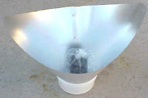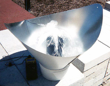 The burden for gathering the fuel wood and cooking falls mainly on women and children. Joseph Kiai reports : From Dadaab, Kenya: "Women who can't afford to buy wood start at 4 am to go collecting and return about noon... They do this twice a week to get fuel for cooking... The rapes are averaging one per week." From Belize: "Many times the women have to go into the forest dragging their small children when they go to look for wood. It is a special hardship for pregnant and nursing mothers to chop and drag trees back to the village... they are exposed to venomous snakes and clouds of mosquitoes." And the forests are dwindling in many areas. Edwin Dobbs noted in Audubon Magazine, Nov. 1992, "The world can choose sunlight or further deforestation, solar cooking or widespread starvation..." Americans should be prepared for emergencies, incident to power failures. A Mormon pioneer noted in her journal: "We were now following in their trail travelling up the Platte River. Timber was sometimes very scarce and hard to get. We managed to do our cooking with what little we could gather up..." (Eliza R. Snow) Now there's someone who needed a light-weight Solar Cooker! Here's another reason to use a solar cooker. Many people in developing countries look to see what's being done in America. I'm told that if Americans are using something, then they will want to try it, too. The more people there are cooking with the sun, the more others will want to join in. A good way to spread this technology is to encourage small local industries or families to make these simple yet reliable solar cookers for others at low cost. I've used this cooker for three summers and I enjoy it. Cooking and making ice with the funnel cooker/cooler will permit a significant change in lifestyle. If you think about it, this could help a lot of people. The BYU Solar Funnel Cooker uses the glorious sunshine -- and the energy of the sun is a free gift from God for all to use! Answers to commonly-asked questions Will the cooker work in winter (in the United States)? As the sun moves closer to the southern horizon in the winter, the solar cooker is naturally less effective. A good measure of the solar intensity is the “UV index” which is often reported with the weather. When the ultraviolet or UV index is 7 or above – common in summer months – the solar cooker works very well. In Salt Lake City in October, the UV index was reported to be 3.5 on a sunny day. We were able to boil water in the Solar Funnel Cooker during this time, but we had to suspend the black jar in the funnel so that sunlight struck all sides. (We ran a fishing line under the screw-on lid, and looped the fishing line over a rod above the funnel. As usual, a plastic bag was placed around the jar, and this was closed at the top to let the fishing line out for suspending the jar.) The solar “minimum” for the northern hemisphere occurs on winter solstice, about December 21st each year. The solar “maximum” occurs six months later, June 21st. Solar cooking works best from about 20th March to 1st October in the north. If people try to cook with the sun for the first time outside of this time window, they should not be discouraged. Try again when the sun is more directly overhead. One may also suspend the jar in the funnel, which will make cooking faster any time of the year. It is interesting to note that most developing countries are located near the equator where the sun is nearly directly overhead all the time. Solar Cookers will then serve year-round, as long as the sun is shining, for these fortunate people. They may be the first to apply fusion energy (of the sun) on a large scale. They may also accomplish this without the expensive infrastructure of electrical power grids that we take for granted in America. How do you cook bread in a jar? I have cooked bread by simply putting dough in the bottom of the jar and placing it in the funnel in the usual way. Rising and baking took place inside the jar in about an hour (during summer). One should put vegetable oil inside the jar before cooking to make removal of the bread easier. I would also suggest that using a 2-quart wide-mouth canning jar instead of a 1-quart jar would make baking a loaf of bread easier. What is the optimum “opening angle” for the funnel cooker? A graduate student at Brigham Young University did a calculus calculation to assess the best shape or opening angle for the Solar Funnel. Jeannette Lawler assumed that the best operation would occur when the sun’s rays bounced no more than once before hitting the cooking jar, while keeping the opening angle as large as possible to admit more sunlight. (Some sunlight is lost each time the light reflects from the shiny surface. If the sunlight misses on the first bounce, it can bounce again and again until being absorbed by the black bottle). She set up an approximate equation for this situation, took the calculus derivative with respect to the opening angle and set the derivative equal to zero. Optimising in this way, she found that the optimum opening angle is about 45 degrees, when the funnel is pointed directly towards the sun. But we don’t want to have to “track the sun” by turning the funnel every few minutes. The sun moves (apparently) 360 degrees in 24 hours, or about 15 degrees per hour. So we finally chose a 60-degree opening angle so that the cooker is effective for about 1.2 hours. This turned out to be long enough to cook most vegetables, breads, boil water, etc. with the Solar Funnel Cooker. We also used a laser pointer to simulate sun rays entering the funnel at different angles, and found that the 60-degree cone was quite effective in concentrating the rays at the bottom of the funnel where the cooking jar sits. For questions regarding the complete Solar Funnel Cooker kit using aluminised Mylar and a jar for the cooking vessel, please contact CRM at +1 (801) 292-9210. Tests of the Solar Funnel and Bowl Cookers in 2001 