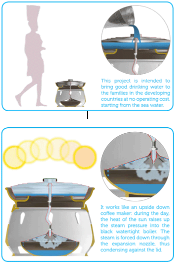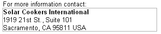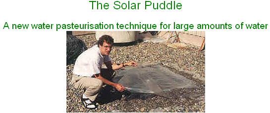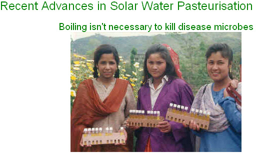 If wood, charcoal, or dung is used as fuel for boiling water, the smoke creates a health hazard, as it does all the time with cooking. It is estimated that 400 to 700 million people, mainly women, suffer health problems from this indoor air pollution. As a microbiologist, I have always been perplexed as to why boiling is recommended, when this is heat far in excess of that which is necessary to kill infectious microbes in water. I presume the reason boiling is recommended is to make sure that lethal temperatures have been reached, since unless one has a thermometer it is difficult to tell what temperature heated water has reached until a roaring boil is reached. Everyone is familiar with the process of milk pasteurisation. This is a heating process which is sufficient to kill the most heat resistant disease causing microbes in milk, such as the bacteria which cause tuberculosis, undulant fever, streptococcal infections and Salmonellosis. What temperatures are used to pasteurise milk? Most milk is pasteurised at 71.7o C (161o F) for only 15 seconds. Alternatively, 30 minutes at 62.8o C (145o F) can also pasteurise milk. Some bacteria are heat resistant and can survive pasteurisation, but these bacteria do not cause disease in people. They can, however, spoil the milk, so pasteurised milk is kept refrigerated. There are some different disease microbes found in water, but they are not unusually heat resistant. The most common causes of water diseases, and their heat sensitivity, are presented in Table 1. The most common causes of acute diarrhoea among children in developing countries are the bacteria Escherichia coli and Shigelia SD. and the Rotavirus group of viruses. These are rapidly killed at temperatures of 60o C or greater. Solar water pasteurisation As water heats in a solar cooker, temperatures of 56o C and above start killing disease-causing microbes. A graduate student of mine, David Ciochetti, investigated this for his master's thesis in 1983, and concluded that heating water to 66o C in a solar cooker will provide enough heat to pasteurise the water and kill all disease causing microbes. The fact that water can be made safe to drink by heating it to this lower temperature - only 66o C - instead of 100o C (boiling) presents a real opportunity for addressing contaminated water in developing countries. Testing water for faecal contamination How can one readily determine if the water from a well, pump, stream, etc. is safe to drink? The common procedure is to test the water for bacterial indicators of faecal pollution. There are two groups of indicators which are used. The first is the coliform bacteria which are used as indicators in developed countries where water is chlorinated. Coliform bacteria may come from faeces or from plants. Among the coliform bacteria is the second indicator, Escherichia coli. This bacterium is present in large numbers in human faeces (approximately 100,000,000 per gram of faeces) and that of other mammals. This is the main indicator used if water is not chlorinated. A water source containing 100 E. coli per 100 ccs poses a substantial risk of disease. The standard method of testing water for the presence of coliforms and E. coli requires trained personnel and a good laboratory facility or field unit which are usually not present in developing countries. Thus, water supplies are almost never tested. A new approach to testing in developing countries In 1987, the Colilert MPM Test (CLT) was introduced as the first method which used a defined substrate technology to simultaneously detect coliforms and E. coli. The CLT comes as dry chemicals in test tubes containing two indicator nutrients: one for coliforms and one for E. coli. The CLT involves adding 10 ml of water to a tube, shaking to dissolve the chemicals, and incubating at body temperature for 24 hours. I prefer incubating tubes under my belt against my body. At night I sleep on my back and use night clothes to hold the tubes against my body. If no coliform bacteria are present, the water will remain clear. However, if one or more coliforms are present in the water, after 24 hours their growth will metabolise ONPG and the water will change in colour from clear to yellow (resembling urine). If E. coli is among the coliform bacteria present, it will metabolise MUG and the tube will fluoresce blue when a battery-operated, long-wave ultraviolet light shines on it, indicating a serious health hazard. I have invited participants at solar box cooker workshops in Sierra Leone, Mali, Mauritania, and Nepal to test their home water supplies with CLT. One hundred and twenty participants brought in samples. In all four countries, whether the water was from urban or rural areas, the majority of samples contained coliforms, and at least half of these had E. coli present. Bacteriological testing of the ONPG and MUG positive tubes brought back from Mali and Mauritania verified the presence of coliforms/E. coli in approximately 95% of the samples. It is likely that soon the Colilert MPN test will be modified so that the test for E. coli will not require an ultraviolet light, and the tube will turn a different colour than yellow if E coli is present. This will make the test less expensive and easier to widely use in developing countries to assess water sources. Effect of safe water on diarrhoea in children What would be the effect if contaminated water could be made safe for drinking by pasteurisation or boiling? One estimate predicts that if in the Philippines, families at present using moderately contaminated wells (100 E. coli per 100 ml) were able to use a high-quality water source, diarrhoea among their children would be reduced by over 30%. Thus, if water which caused a MUG (+) test were solar pasteurised so it would be clear, this would help reduce the chance of diarrhoea, especially in children. Water pasteurisation indicator ![]() How can one determine if heated water has reached 65o C? In 1988, Dr. Fred Barret