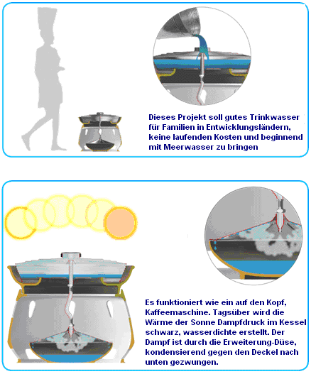 Während des Tages werden die Sonnenstrahlen auf den Kochtopf, die schnell heiß wird reflektiert. In der Nacht wird die Wärme aus dem Kessel abgestrahlte nach außen, in Richtung leeren Raum, das ist sehr kalt in der Tat (ein "Kühlkörper"). Als Ergebnis das Kochgefäß wird nun ein kleiner Kühlschrank. Wir routinemäßig erreichen Kühlen von etwa 20 º F (10 º C) unter Umgebungstemperatur mit dieser erstaunlich einfachen Schema. Im September 1999 legten wir zwei Trichtern in den Abend, mit doppelt verpackt Gläser innen. Ein Glas war auf einem Holzblock und der andere wurde in den Trichter mit Angelschnur aufgehängt. Die Temperatur an diesem Abend (in Provo, Utah) betrug 78º F (25,5º C). Mit einem Radio Shack indoor / outdoor Thermometer gemessen a BYU Studenten (Colter Paulson) die Temperatur im Inneren des Trichters und draußen in der frischen Luft. Er fand, dass die Temperatur der Luft im Inneren des Trichters schnell sank um etwa 15º F (8º C), wie die Wärme nach oben abgestrahlt wurde in den klaren Himmel. In dieser Nacht war das Minimum Außentemperatur gemessen 47,5º F (8,6º C) - aber das Wasser in beiden Gläsern hatten ICE. Ich lade andere dazu zu versuchen, und lassen Sie es mich wissen, wenn Sie Eis bei 55 zu erhalten oder sogar 60 Grad Außentemperatur (Minimum in der Nacht). Ein schwarzer PVC Behälter kann noch besser funktioniert als ein schwarz lackiertes Glas, da PVC eine gute Infrarot-Strahler ist - diese Fragen werden noch untersucht. Ich möchte den "Funnel Kühlschrank" im Wüstenklima versucht, besonders dort, wo Temperaturen unter dem Gefrierpunkt nur selten erreicht werden sehen. Es sollte auf diese Weise kostengünstig Geld Eis Hutus in Ruanda und für Aborigines in Australien möglich, ohne Verwendung von Elektrizität oder anderen modernen "Tricks". Wir sind in der Tat bringt einige der Kälte des Weltraums auf eine kleine Ecke auf der Erde. Bitte lassen Sie mich wissen, wie diese für Sie arbeitet. Fazit: Warum brauchen wir Solarkocher Die BYU Funnel Kocher / Kühler: