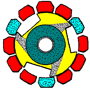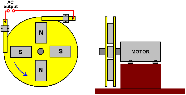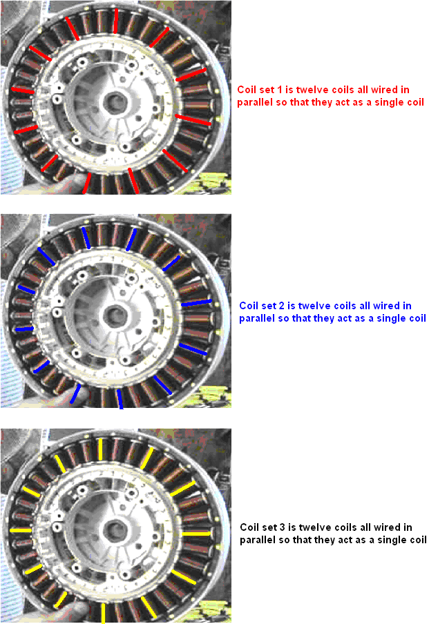 With this arrangement, if the positions the switches as shown for ten of the fifteen coils shown here, then they act as drive coils. The sensor is adjusted so that the drive circuit delivers a brief energising pulse to those coils just after the magnets have passed their exact alignment position with the coils. This causes them to generate a magnetic field which repels the magnets, thrusting the rotor around. The pulse is very brief, so very little power is needed to accomplish this pulsing. As mentioned before, any number of coils can be switched to provide this driving force. With this particular wheel construction by Mr Tong, the best number has been found to be ten drive coils. The power pick-up is achieved by gathering the electricity generated in some of the coils as the magnets move past them: