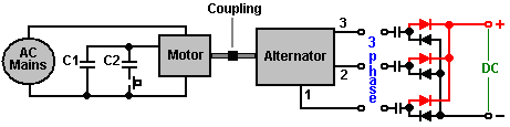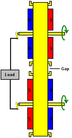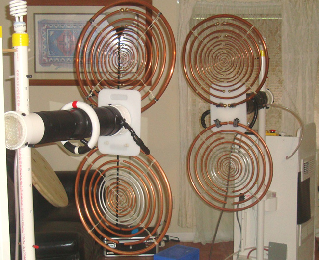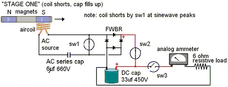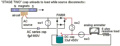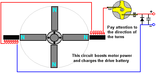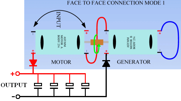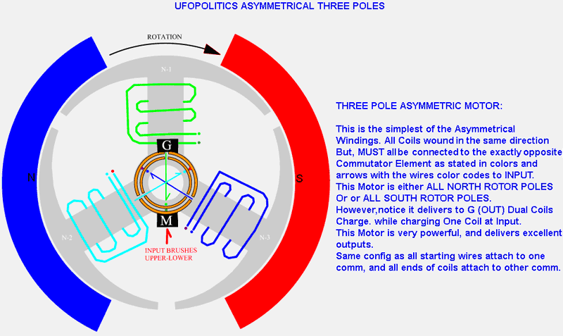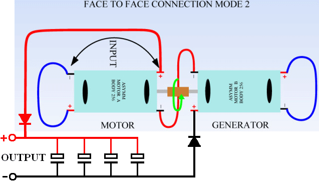 ![]() The same is done for the unit which is to be used as the alternator. To increase the allowable current draw, the unit windings are connected to give the lower voltage with the windings connected in parallel as shown below with terminals 4,5 and 6 strapped together, 1 connected to 7, 2 connected to 8 and 3 connected to 9. This gives a three-phase output on terminals 1, 2 and 3. This can be used as a 3-phase AC output or as three single-phase AC outputs, or as a DC output by wiring it as shown here: ![]() The motor and the alternator are then mounted securely in exact alignment and coupled together. The switching of the direction of the housing on the drive motor allows all of the jumpering to be on the same side of the two units when they are coupled together, facing each other: ![]() The input drive may be from an inverter driven from a battery charged via a solar panel. The system how needs to be ‘tuned’ and tested. This involves finding the best ‘starting’ capacitor which will be switched into the circuit for a few seconds at start-up, and the best ‘running’ capacitor. Help and advice is readily available from the EVGRAY Group as mentioned above. To summarise: This device takes a low-power 110 Volt AC input and produces a much higher-power electrical output which can be used for powering much greater loads than the input could power. The output power is much higher than the input power. This is free-energy under whatever name you like to apply to it. One advantage which should be stressed, is that very little in the way of construction is needed, and off-the-shelf motors are used. Also, no knowledge of electronics is needed, which makes this one of the easiest to construct free-energy devices available at the present time. One slight disadvantage is that the tuning of the “Prime Mover” motor depends on its loading and most loads have different levels of power requirement from time to time. A 220 Volt AC motor can also be used if that is the local supply voltage. If an alternator is being driven by the RotoVerter motor (the “Prime Mover”) but although the shaft is being rotated rapidly there is no output voltage, then it is likely that the alternator has been sitting around unused for a long time and has lost the magnetic properties which it needs at start-up. To fix this, connect each of the three output windings, one at a time, across a car battery for about five seconds to develop some magnetism and the alternator will then work. This is a one-off thing only needed after a long period of inactivity. It is not essential to construct the RotorVeter exactly as shown above, although that is the most common form of construction. The Muller Motor mentioned earlier, can have a 35 kilowatt output when precision-constructed as Bill Muller did. One option therefore, is to use one Baldor motor jumpered as the “Prime Mover” drive motor and have it drive one or more Muller Motor style rotors to generate the output power: ![]() Coil-Shorting. The RotoVerter output and the Muller Motor/Generator output (and possibly, the Adams Motor output) can be increased very substantially by a technique developed by "Kone" the moderator of the EVGRAY Yahoo forum already mentioned. The technique is to place a dead short-circuit across each output coil, just as the magnetic field of that coil reaches a maximum. This is done five times in rapid succession and can boost the output power by an estimated factor of 100 times. On the surface, it appears complete madness to place a short-circuit across the very output which you are generating as the whole point of the exercise. However, it is not as mad as it seems. At the peak point, the coil itself contains a large amount of energy and when a short-circuit is placed across it, the result is quite unusual. The effect of short-circuiting an iron-cored coil has been demonstrated by Ron Pugh of Canada with a bench test using this equipment: ![]() Here, a device for measuring magnetic fields is sensing the magnetic field of the coil as the rotor magnets move past the coil. The measurement is done with the coil operating normally and then again, with the coil short-circuited. The results are shown in these oscilloscope displays: ![]() Quite surprisingly, the magnetic field is reversed by the short-circuit. If we consider just the first half of the cycle: ![]() You will notice that when the open coil has a very strong positive position (relative to a North magnetic pole), the short-circuited coil has a strong reading of the opposite polarity. Therefore, at any given instance near the peak, there is the potential for a major magnetic reversal if the coil were to be switched from the red area into the blue area and back again. You might imagine that if the coil short-circuiting were performed very rapidly, that there would be a result like this: ![]() However, this is not really possible with an iron-cored coil as it is not able to reverse it's magnetisation rapidly enough to produce this effect. Coils with iron cores might get up to 3,000 reversals per second although 1,000 would probably be a more realistic figure. For higher frequencies, a ferrite core could be used and for yet higher frequencies again, an iron-dust epoxy-encapsulated core is needed. For unlimited frequencies, an air-core coil is used. In the RotoVerter / Muller Motor example where Kone has demonstrated major energy gains, the arrangement is different to Ron Pugh's bench-test example. Firstly, the magnets on the rotor present two poles to the coil as they pass by, giving a full, even sine wave output. Secondly, Kone uses an air-core coil and he has the fast switching implemented to take advantage of that coil type: ![]() This screen shot shows exactly the same effect with the oscillating pulses plunging down to exactly where the negative trace would be at that time during each of the short-circuited periods. The display is showing a twenty-volt peak-to-peak waveform with each c
