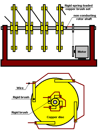 Mr Tseung remarks that the large wheel size is due to the fact that the Pulse Force takes time to impart the impulse to the wheel and lead-out energy from the environment into the system. If you want to see this actual wheel, you can email Dr. Alexandra Yuan at ayuan@hkstar.com to make an appointment. The Tong wheel is located at the Better Hong Kong Radio Studio in Causeway Bay, Hong Kong. Just say that you want to see the Lead-Out Energy Machine. The demonstration can be in English or in Chinese. Ideally, there should be a group of at least six visitors with one or more being a qualified engineer or scientist, and you are welcome to bring your own cameras and/or test equipment. It is planned to produce a version which has a 300 watt output, and another with a 5 kilowatt output. Educational kits are also planned. If you decide to replicate this particular design, then to raise the output power level you might consider putting another set of coils around the wheel and either using them as fifteen additional energy pick-up coils or alternatively, pulsing the wheel twice as often. Adding one or more additional rotor discs to the same rotating shaft is also an option and that has the advantage of increasing the rotor weight and improving the effect of the impulses on the rotor. The diameter of the wire used to wind the coils is a design choice which has a wide scope. The thicker the wire, the greater the current and the larger the impulse given to the wheel. The coils are normally connected in parallel as shown in the diagrams. Because of the way magnetic field strength drops off with the square of the distance, it is generally considered good design practice to make the coils one and a half times as wide as they are deep, as indicated in the diagrams above, but this is not a critical factor. This design is, of course, a version of the Adams motor described at the start of this chapter. Although motors of this kind can be built in many different ways, the construction used by Mr Tong has some distinct advantages, so here is a little more detail on how I understand the construction to be carried out. ![]() There are two side pieces which are attached together by sixteen cross timbers, each of which are held in place by two screws at each end. This produces a rigid structure while the construction method is as simple as is possible, using readily available materials which are worked with the most basic of hand tools. The construction also allows the motor to be taken apart completely without any difficulty, transported as a “flat-pack” package and then assembled at a new location. It also facilitates people who want to see the motor taken apart after a demonstration in order to assure themselves that there is no hidden power source. ![]() Each of the cross timbers provide a secure mounting platform for an electromagnet and it’s associated switch. In the implementation by Mr Tong, there appears to be just the one rotor, configured as shown above with sixteen permanent magnets mounted in it’s rim. The magnetic poles of these magnets are all orientated in the same direction. That is to say, the magnetic poles facing outwards are all either South or all North poles. It is not critical whether the outward facing poles are North or South as Robert Adams used both arrangements with great success, but having said that, most people prefer to have the North poles facing outwards. Robert has always said that one rotor was enough, but his techniques were so sophisticated that he was able to extract kilowatts of excess power from a single small rotor. For us, just starting to experiment and test a motor of this type, it seems sensible to stick with what Mr Tong has experienced success. However, this build by Mr Tong is not his final motor but just one in a series of continuously improved motors. The following diagram shows an arrangement which has three rotors attached to a single shaft and while you may choose to construct this with just one rotor, if the cross timbers are long enough, then one or two extra rotors can be added in very easily at a later date. ![]() Here, just two of the cross timbers are shown. The electromagnet coils used by Mr Tong are air-core as that type have the least effect on the passing magnets. However, electromagnets with cores tend to be much more power for any given current flowing through them. In theory, the core should be made of lengths of insulated iron wire as that would reduce power loss through eddy currents flowing in the core, but Robert actually recommends solid metal cores, and as he was the most experienced person in this field, paying attention to what he said seems sensible. The core material needs to be a metal which magnetises easily and powerfully, but which does not retain any of its magnetism when the current stops flowing. Not many metals have those characteristics and soft iron is usually recommended. Nowadays, soft iron is not always readily available and so a convenient alternative is the central bolt of a masonry anchor which has excellent properties: ![]() The shaft of the bolt can be cut quite easily with a hacksaw, but be sure to remove (or file down) the head of the bolt as the increase in diameter has a marked effect on the magnetic properties of the electromagnet core if it is left in place. The bolt shown above is a M16 x 147 mm masonry anchor bolt with a bolt diameter of 10 mm. Some makes of dry-ink felt white-board markers have a rigid body which fits the 10 mm bolt exactly and provide an excellent tube for constructing an electromagnet bobbin. With a core in the electromagnets, the rotor gets additional rotating power. Initially, the magnets on the rotor are attracted to the electromagnet cores, giving the rotor a turning force which does not require any current to be supplied. When the rotor magnets are at their closest point to the electromagnet cores, the windings are powered up briefly and that gives the rotor magnets a strong pu