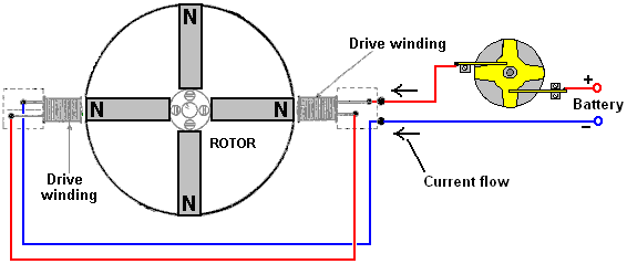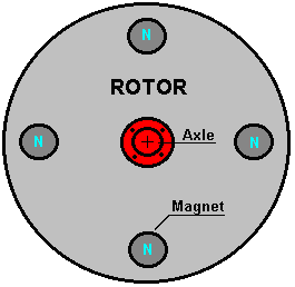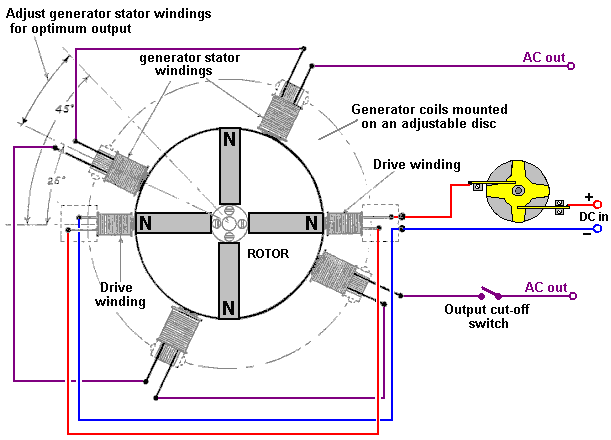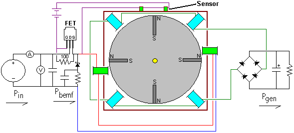 There are three categories of pulsed system and we will consider each in turn. These are drive-pulsed systems, energy-tapping pulsed systems and gravity free-energy pulsing systems. Here we will look at systems where an electrical pulse is used to cause the device to operate by creating a temporary magnetic field caused by electric current flowing through a coil or “electromagnet” as it is often called. Many of these systems are rather subtle in the way that they operate. One very well-known example of this is The Adams Motor. The late Robert Adams, an electrical engineer of New Zealand designed and built an electric motor using permanent magnets on the rotor and pulsed electromagnets on the frame of the motor. He found that the output from his motor exceeded the input power by a large margin (800%). ![]() The diagram of his motor intended to show the basic operating principle is shown here: ![]() If a motor is built like this, then it will most certainly work but it will never reach 100% efficiency let alone exceeding the 100% mark. It is only with a specific configuration which is hardly ever publicised that high performance figures can be achieved. While Robert has shown several different configurations, in order to avoid confusion I will describe and explain just one of them. I am indebted to several of Robert's friends and colleagues for the following information and I should like to express my thanks to them for their help and support in bringing you this information. First and foremost, high performance can only be achieved with the clever use of power collection coils. These coils need to be positioned accurately and their power collection restricted to just a very short arc of operation by connecting them to, and disconnecting them from, the output circuit at just the right instant so that the back EMF generated when the current draw stops, actually contributes to the drive of the rotor, speeding it on it's way and raising the overall efficiency of the motor/generator as a whole. Next, the shape of the magnets used is important as the length to width proportion of the magnet alters the pattern of it's magnetic fields. In direct opposition to the diagram shown above, the magnets need to be much longer than their width (or in the case of cylindrical magnets, much longer than their diameter). Further, a good deal of experimentation has shown that the size and shape of the electromagnets and pick-up coils has a major influence on the performance. The cross-sectional area of the core of the pick-up coils should be four times that of the cross-sectional area of the permanent magnets in the rotor. The reverse is true for the cores of the drive coils as their cores should have a cross-sectional area of just one quarter of the rotor magnet cross-sectional area. Another point which is almost never mentioned is the fact that big circuit gains will not be achieved unless the drive voltage is high. The minimum should be 48 volts but the higher the voltage, the greater the energy gain, so voltages in the 120 volts (rectified US mains voltage) to 230 volts (rectified mains voltage elsewhere) should be considered. Neodymium magnets are not recommended for drive voltages under 120 volts. There are several important steps in the way that the Robert Adams motor/generator works and it is important for you to understand each of the steps. Step 1: A rotor magnet is attracted to the iron core of a stator “drive” electromagnet. As it approaches the drive electromagnet, the lines of magnetic force from the stator magnet move across the drive electromagnet coil. This generates an electric current in the drive electromagnet coil and that current is fed back to the battery which is powering the motor/generator: ![]() Notice that the movement of the rotor is caused by the permanent magnets being attracted to the iron cores of the drive electromagnets and not by any electric current. The electric flow is going back into the battery and is being caused by the movement of the rotor which in turn is being caused by the permanent magnets. Step 2: When the rotor turns far enough, the magnets align exactly with the cores of the drive electromagnets. The rotor continues to rotate because of its inertia, but if we do nothing about it, the rotor magnet attraction to the drive electromagnet core will act to slow it down and then drag it back to the drive coil core. We want to prevent that, so we feed a small amount of current into the drive electromagnet coils – just enough current to stop the backward drag of the rotor magnets. This current is NOT to push the rotor magnets away, it is just enough to prevent the rotor being slowed down: ![]() Step 3: When the rotor magnet has moved away far enough, the current being fed to the drive electromagnets is cut off. As happens with any coil, when the current is cut off a large reverse voltage spike is generated. That voltage spike is rectified and fed back to the battery. The system so far produces a spinning rotor for very little current draw from the battery. But we want the system to provide us with excess electrical output, so for that, four additional electromagnets are added around the rotor. These output coils are mounted on a non-magnetic disc which can be rotated to adjust the gap between the drive coils and the output coils. Like the rotor magnets, the output coils are spaced evenly around the circumference of the rotor at 90-degree intervals: ![]() Step 4: Surprisingly, the output coils are switched Off for most of the time. This sounds mad but it most definitely isn’t mad. With the output coils disconnected, the approaching rotor magnets generate a voltage in the output coil windings but no current can flow. As no current is flowing, no magnetic field is generated and so the rotor magnets just pull directly towards the output coil iron cores. The maximum output coil voltage is when the rotor magnets are aligned with the output coil cores. At that inst