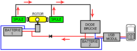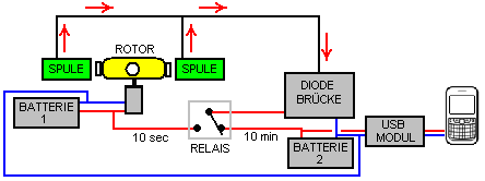 ![]() Der Rotor kann natürlich aus leichten Materialien gebaut werden, wenn es schwierig ist, einen Schwimmer von einem professionellen Fischernetz zu bekommen. Die Magneten sind 20 mm N52-Grad Durchmesser Neodym-Magneten 5 mm dick. Der Motor wird von einer 3,7-V-Lithium-Ionen-Batterie angetrieben und es sind acht Ausgangsspulen angeordnet, die um den Rotor herum angeordnet sind. Die Spulen sind paarweise mit den vier Paaren verbunden, die das System versorgen. ![]() Jede Spule ist mit zwei Litzen von 0,19 mm Durchmesser emailliertem Kupferdraht gewickelt, der swg 36 ist oder AWG # 32 sein könnte. Jeder Strang wiegt 50 Gramm und beide Stränge werden gleichzeitig gewickelt. Diese Anordnung erlaubt es, die Spulen als Bi-Filar-Spulen zu verbinden, wenn dies gewünscht wird. Der zentrale Kern jeder Spule ist aus Kunststoff und hat einen Durchmesser von 8 mm mit einem Loch von 6 mm Durchmesser in der Mitte, und die fertige Wicklung ist 30 mm Durchmesser auf einer Spule, die 33 mm Wicklungsraum zwischen den Enden hat. Wenn die Wicklung abgeschlossen ist, wird jeder Spule eine Schicht aus elektrischem Isolierband gegeben, um die Drähte zu schützen, anstatt irgendeine zusätzliche Isolierung bereitzustellen. Also, die gesamte Anordnung ist: ![]() Hier versorgt die Batterie 1 den Motor, der den Rotor dreht. Die leistungsstarken Rotormagnete, die in der Nähe des Satzes von acht Spulen vorbeifahren, erzeugen eine Wechselspannung, die durch die Diodenbrücke gleichgerichtet wird und zum Laden der Mobiltelefonbatterie über ein 5-Volt-USB-Modul verwendet wird. Nur zwei der acht Ausgangsspulen sind im obigen Diagramm dargestellt. Dieses System funktioniert gut und lädt Akku 2 auf, aber der Batterie 1 läuft allmählich herunter, da er den Motor mit Strom versorgt, aber nicht aufgeladen wird. Um diese Situation zu bewältigen, verwendet Denis eine Schaltbox, die ein Relais für zehn Sekunden einmal alle zehn Minuten versorgt. Die Relaiskontakte werden verwendet, um den Ladestrom von Batterie 2 zu trennen und stattdessen auf Batterie 1 zu übertragen: ![]() Zwar gibt es einfachere Wege, um das erforderliche Ergebnis zu erzielen, hier sind die Details der Schaltbox, die Denis verwendet. Es hat drei Stufen: Stufe 1 liefert die 10-Minuten-Timing mit einem 555 Timer-Chip, wie dies am bequemsten ist. Allerdings ist das Problem bei einfachen Schaltungen mit einer langen Zykluszeit, dass das Zeitintervall durch die Zeitdauer bestimmt wird, die ein Kondensator benötigt, um aufzuladen. Das braucht einen großen Kondensator und einen sehr kleinen Ladestrom. ABER große Kondensatoren lecken die Ladung weg, es sei denn, sie sind hochwertige Kondensatoren. Die höchste Qualität ist ein Tantalkondensator und der größte verfügbare ist 47 Mikrofarad, so dass zwei parallel dazu verwendet werden, um etwa 100 Mikrofarad zu geben. Die Zeitverzögerung mit 100 Mikrofarad benötigt einen Ladewiderstand von ca. 3 Megohm. Für die einfachste Version der Schaltung (eine, die gleich Ein-und Aus-Zeiten) macht die Schaltung dies: ![]() Und um eine kleine Kontrolle über die Zeitspanne zu bekommen, wird der Widerstand aus drei 1-Meg-Widerständen und einem 1M-variablen Widerstand hergestellt. Das Ergebnis ist eine Schaltung, die für ca. 5 Minuten an und für ca. 5 Minuten ausgeschaltet ist. Das heißt, der Ausgang auf Pin 3 geht für vier Minuten hoch und dann für vier Minuten niedrig. Der Tiefstand liegt bei etwa 0 V und der Hochwert liegt bei etwa 2 Volt unter der Versorgungsspannung. Die Versorgungsspannung darf 15 Volt nicht überschreiten, da der 555-Chip sofort durch eine Überspannungsversorgung zerstört wird. Die zweite Stufe ist das: ![]() Der Transistor ist ein High-Gain-Low-Strom-Typ und es ist in der Regel auf die Kosten etwa ein Milliamp. Der Kondensator lädt während des vierminütigen Intervalls auf, und wenn die 555-Timer-Spannung niedrig wird, treibt der Kondensator die Transistorbasis niedrig an, schaltet den Transistor aus und veranlaßt die Kollektorspannung, hoch zu gehen. Jedoch kann die Kondensatorladung nur den Transistor für eine kurze Zeitspanne und mit einem 100K-Widerstand über dem Kondensator wie gezeigt halten, der Transistor ist für etwa 10 Sekunden ausgeschaltet. Um eine gewisse Kontrolle über die Zeit zu ermöglichen, kann der Widerstand von 47K bis 147K variiert werden, aber die Gesamtzeit dieser Phase wird immer kurz sein. Die dritte Stufe besteht darin, das Relais mit der vollen Versorgungsspannung anzutreiben und hierfür wird ein kostengünstiger sehr hoher Verstärkungs-Transistor verwendet: ![]() Der Strom in die Basis des TIP132-Transistors beträgt etwa die Hälfte von einem Milliamp und die Transistor-Minimalverstärkung beträgt 1000, so dass das Relais mit bis zu 500 Milliampere versorgt wird. Natürlich zieht das Relais nicht so viel Strom, aber es bekommt die volle Batteriespannung darüber. Die Diode ist nur, um den Transistor vor der Sperrspannung beim Ausschalten zu schützen. Der ganze Schaltkasten ist dann da: ![]() Ein funktionierendes physikalisches Layout für diese Schaltung kann sein: ![]() In diesem Diagramm zeigen die roten Punkte einen Bruch im Kupferstreifen unterhalb der Platine an und die variablen Widerstände erlauben eine angemessene Anpassung der Timing-Perioden. Bitte beachten Sie, dass der 555-Timer-Chip sofort zerstört wird, wenn er mehr als 15 Volt gefüttert wird, so dass eine 12-V-Batterie Ihr höchstes Angebot sein sollte. Allerdings funktioniert die Schaltung gut, wenn durch eine PP3 Größe 9-Volt-Batterie angetrieben. Die Stromaufnahme bei 9 Volt auf dem Prototyp beträgt 12 Milliampere, die für ein paar Sekunden auf 32 Milliampere steigen, wenn das Relais angetrieben wird. Es kann gut möglich sein, diese Anordnung zu verbessern und die Schaltbox auszulassen. Dies ist nur ein Vorschlag zu diesem Zeitpunkt, da die Vereinbarung noch nicht getestet wurde. Das Ziel ist es, Batterie 1 aufgeladen zu halten, während der Stromkreis läuft. 