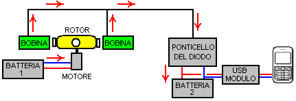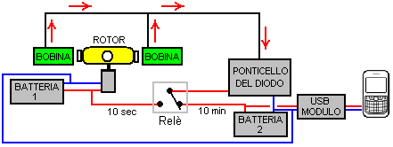 ![]() Il rotore può, naturalmente, essere costruito da materiali leggeri se è difficile ottenere un galleggiante da una rete di pesca professionale. I magneti sono magneti al neodimio di dimensioni N52 di 20 mm di spessore di 5 mm. Il motore è alimentato da una batteria agli ioni di litio da 3.7V e sono presenti otto bobine di uscita posizionate attorno al rotore. Le bobine sono collegate in coppia con le quattro coppie che alimentano il sistema. ![]() Ogni bobina è avvolta con due filamenti di filo smaltato di rame smaltato di 0,19 mm, che è swg 36 o potrebbe essere AWG # 32. Ogni filato pesa 50 grammi e entrambi i fili sono feriti contemporaneamente. Tale disposizione permette che le bobine siano collegate come bobine a due filari, se ciò è desiderato. Il nucleo centrale di ciascuna bobina è in plastica ed è di 8 mm di diametro con un foro di diametro di 6 mm al centro e l'avvolgimento completato è di 30 mm di diametro su una bobina con 33 mm di spazio di avvolgimento tra le estremità. Quando l'avvolgimento è completato, ogni bobina è dotata di uno strato di nastro isolante elettrico per proteggere i fili piuttosto che fornire ulteriori isolamenti. Quindi, l'accordo generale: ![]() Qui, la batteria 1 alimenta il motore che pone il rotore. I potenti magneti del rotore che passano vicino all'insieme di otto bobine generano una tensione alternata che viene rettificata dal ponte diodo e utilizzata per caricare la batteria del telefono cellulare attraverso un modulo USB da 5 Volt. Solo due delle otto bobine di uscita sono mostrate nel diagramma sopra riportato. Questo sistema funziona bene, caricando la batteria 2, ma la batteria 1 scende gradualmente in fase di accensione del motore ma non viene ricaricata. Per far fronte a questa situazione, Denis utilizza una scatola di commutazione che alimenta un relè per dieci secondi una volta ogni dieci minuti. I contatti del relè vengono utilizzati per scollegare la corrente di carica dalla batteria 2 e passarla invece alla batteria 1. Mentre ci possono essere modi più facili per ottenere il risultato richiesto, qui sono i dettagli della casella di commutazione che Denis utilizza. Ha tre fasi: La fase 1 fornisce i tempi di 10 minuti utilizzando un chip timer 555 come quello più conveniente. Tuttavia, il problema con circuiti semplici con un lungo ciclo di tempo è che l'intervallo di tempo è determinato dalla durata del tempo necessario per un condensatore a caricare. Questo ha bisogno di un grande condensatore e di una corrente di carica molto piccola. MA i grandi condensatori perdono la carica se non sono condensatori di alta qualità. La più alta qualità è un condensatore di tantalio e il più grande è disponibile 47 microfaradi, quindi due in parallelo vengono utilizzati per dare circa 100 microfarad. Il ritardo di tempo con 100 microfarad ha bisogno di una resistenza di carica di circa 3 megohms. Andando per la versione più semplice del circuito (uno che ha tempi di accensione e spegnimento uguali) fa il circuito: ![]() E per ottenere un piccolo controllo nel tempo, la resistenza è costituita da tre resistori da 1 meg e da una resistenza variabile 1M. Il risultato è un circuito che è Attivo per circa 5 minuti e Off per circa 5 minuti. Cioè, l'uscita sul pin 3 va alta per quattro minuti e poi bassa per quattro minuti. Il basso è di circa 0V e l'altezza è di circa 2 volt sotto la tensione di alimentazione. La tensione di alimentazione non deve mai superare i 15 volt poiché il chip 555 viene immediatamente distrutto da un alimentatore di sovratensione. La seconda fase è questa: ![]() E per ottenere un piccolo controllo nel tempo, la resistenza è costituita da tre resistori da 1 meg e da una resistenza variabile 1M. Il risultato è un circuito che è Attivo per circa 5 minuti e Off per circa 5 minuti. Cioè, l'uscita sul pin 3 va alta per quattro minuti e poi bassa per quattro minuti. Il basso è di circa 0V e l'altezza è di circa 2 volt sotto la tensione di alimentazione. La tensione di alimentazione non deve mai superare i 15 volt poiché il chip 555 viene immediatamente distrutto da un alimentatore di sovratensione. La seconda fase è questa: ![]() Il transistore è un tipo di corrente a basso guadagno basso e normalmente Su quali costi circa un milliamp. Il condensatore si carica durante l'intervallo di quattro minuti e quando la tensione del timer 555 diminuisce, il condensatore guida la base del transistore basso, spegne il transistor e provoca la sua tensione del collettore. Tuttavia, la carica del condensatore può solo tenere il transistor fuori per un breve periodo di tempo e con una resistenza 100K attraverso il condensatore come mostrato, il transistor è spento per circa 10 secondi. Per consentire un certo controllo nel tempo, la resistenza può variare da 47K a 147K, ma il tempo complessivo di questa fase sarà sempre breve. La terza fase è quella di guidare il relè con la tensione di alimentazione completa e un transistor a guadagno a basso costo molto alto viene utilizzato per questo: ![]() La corrente nella base del transistore TIP132 è di circa la metà di un milliamp e il guadagno minimo del transistore è di 1000, quindi il relè viene alimentato fino a 500 milliamp. Naturalmente, il relè non disegna molto corrente, ma ottiene la tensione di batteria completa attraverso di esso. Il diodo è solo per proteggere il transistor dalla tensione inversa allo spegnimento. L'intero circuito della scatola di commutazione è allora: ![]() Può essere un layout fisico di lavoro per questo circuito: ![]() In questo diagramma, i puntini rossi indicano una rottura nella striscia di rame sotto la scheda e le resistenze variabili consentono un giusto grado di regolazione dei periodi di temporizzazione. Ricorda che il chip timer 555 verrà distrutto immediatamente se viene alimentato più di 15 volt, quindi una batteria da 12V dovrebbe essere la più alta fornitura. Tuttavia, il circuito funziona bene quando 