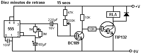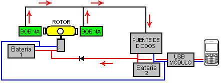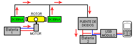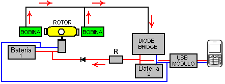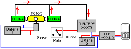 ![]() El rotor puede, por supuesto, estar construido a partir de materiales ligeros si es difícil conseguir un flotador desde una red de pesca profesional. Los imanes son imanes de neodimio de 20 mm de diámetro y N52 de 5 mm de espesor. El motor está alimentado por una batería de iones de litio de 3.7V y hay ocho bobinas de salida colocadas alrededor del rotor. Las bobinas están conectadas en pares con los cuatro pares que alimentan el sistema. ![]() Cada bobina se enrolla con dos hilos de alambre de cobre esmaltado de 0,19 mm de diámetro, que es swg 36 o podría ser AWG # 32. Cada hebra pesa 50 gramos y ambas hebras se enrollan al mismo tiempo. Dicha disposición permite que las bobinas se conecten como bobinas bi-filar si se desea. El núcleo central de cada bobina es de plástico y tiene 8 mm de diámetro con un agujero de 6 mm de diámetro en el centro y el devanado completo es de 30 mm de diámetro sobre una bobina que tiene 33 mm de espacio de bobinado entre los extremos. Cuando el bobinado se completa, cada bobina se da una capa de cinta aislante eléctrica para proteger los cables en lugar de proporcionar cualquier aislamiento adicional. Por lo tanto, el acuerdo general es: ![]() Aquí, la batería 1 alimenta el motor que gira el rotor. Los potentes imanes del rotor que pasan cerca del conjunto de ocho bobinas generan una tensión alterna que es rectificada por el puente de diodo y se utiliza para cargar la batería del teléfono móvil a través de un módulo USB de 5 voltios. Sólo dos de las ocho bobinas de salida se muestran en el diagrama anterior. Este sistema funciona bien, cargando la Batería 2, pero la Batería 1 se desplaza gradualmente mientras está alimentando el motor pero no se está recargando. Para hacer frente a esta situación, Denis utiliza un cuadro de conmutación que alimenta un relé durante diez segundos una vez cada diez minutos. Los contactos de relé se utilizan para desconectar la corriente de carga de la batería 2 y pasarla a la batería 1: ![]() Si bien puede haber maneras más fáciles de lograr el resultado requerido, aquí están los detalles de la caja de conmutación que Denis utiliza. Tiene tres etapas: La etapa 1 proporciona la temporización de 10 minutos usando un chip de 555 temporizadores, ya que es el más conveniente. Sin embargo, el problema con circuitos simples con un tiempo de ciclo largo es que el intervalo de tiempo está determinado por el tiempo que tarda un condensador en cargarse. Eso necesita un condensador grande y una corriente de carga muy pequeña. PERO los condensadores grandes escapan la carga lejos a menos que sean condensadores de la alta calidad. La más alta calidad es un condensador de tantalio y el más grande disponible es 47 microfaradios, por lo que dos en paralelo se utilizan para dar alrededor de 100 microfaradios. El retardo de tiempo con 100 microfaradios necesita una resistencia de carga de aproximadamente 3 megohms. El ir para la versión más simple del circuito (uno que tiene tiempos iguales encendido y apagado) hace el circuito esto: ![]() Y para obtener un poco de control sobre el período de tiempo, la resistencia está hecha de tres resistencias de 1 meg y una resistencia variable 1M. El resultado es un circuito que está encendido durante unos 5 minutos y apagado durante unos 5 minutos. Es decir, la salida en el pasador 3 va alta durante cuatro minutos y luego baja durante cuatro minutos. La baja es de aproximadamente 0V y la alta es de aproximadamente 2 voltios por debajo de la tensión de alimentación. El voltaje de la fuente nunca debe exceder 15 voltios pues el microprocesador 555 es destruido inmediatamente por una fuente de alimentación del sobre voltaje. La segunda etapa es esta: ![]() El transistor es un tipo de baja corriente de baja ganancia y normalmente es el que cuesta alrededor de un miliamperio. El condensador se carga durante el intervalo de cuatro minutos y cuando el voltaje del temporizador 555 baja, el condensador acciona la base del transistor baja, desconectando el transistor y haciendo que su voltaje de colector suba. Sin embargo, la carga del condensador sólo puede mantener el transistor apagado durante un corto período de tiempo y con una resistencia de 100 K a través del condensador como se muestra, el transistor está apagado durante aproximadamente 10 segundos. Para permitir un cierto control sobre el tiempo, la resistencia se puede variar de 47K a 147K pero el tiempo total de esta etapa será siempre corto. La tercera etapa es conducir el relé con la tensión de alimentación completa y un transistor de ganancia muy alta de bajo costo se utiliza para este: ![]() La corriente en la base del transistor TIP132 es aproximadamente la mitad de un miliamperio y la ganancia mínima del transistor es 1000, por lo que el relé se alimenta con hasta 500 miliamperios. Por supuesto, el relé no dibuja que mucha corriente, pero consigue el voltaje completo de la batería a través de él. El diodo es sólo para proteger el transistor de voltaje inverso en el apagado. Todo el circuito de la caja de conmutación se: ![]() Una disposición física funcional para este circuito puede ser: ![]() En este diagrama, los puntos rojos indican una rotura en la tira de cobre por debajo de la placa y las resistencias variables permiten un buen grado de ajuste de los periodos de tiempo. Recuerde que el chip del temporizador 555 se destruirá inmediatamente si se alimenta con más de 15 voltios, por lo que una batería de 12V debería ser su fuente más alta. Sin embargo, el circuito funciona bien cuando está impulsado por una batería de 9 voltios de tamaño PP3. El tirón de corriente a 9 voltios en el prototipo es de 12 miliamperios subiendo a 32 miliamperios durante unos segundos cuando el relé está siendo alimentado. Puede ser posible mejorar esta disposición y omitir la caja de conmutación. Esto es sólo una sugerencia en este momento ya que el arreglo aún no ha sido probado