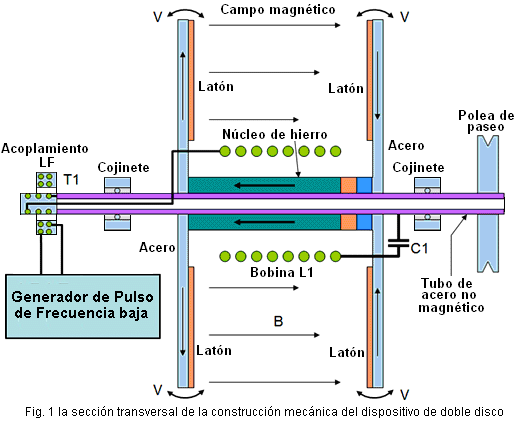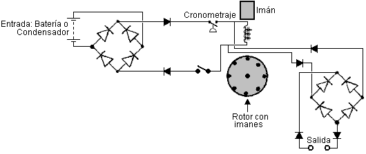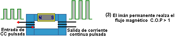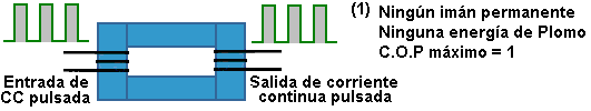 El Generador de Richard WillisEl 28 de mayo de 2009 una aplicación Evidente europea fue archivada por Richard Willis, autorizado "Generador Eléctrico". Durante una entrevista de TV, Richard declaró que su diseño tiene COP=3600. Disponible commercialemente de su compañía canadiense y vendido bajo el nombre "Magnacoster", a principios de 2010 su fijación de precios anunciada es EE.UU 4,200 dólares para una unidad que tiene cuatro 100 amperio separado 12V salidas, dando a un poder de salida máximo combinado de 4.8 kilovatios. Una unidad más grande es priced en EE.UU 6,000 dólares con cuatro separado 24V las salidas que proporcionan 9 kilovatios combinaron la salida. La unidad que impulsa casa que es suministrada de un inversor de 12 kilovatios para proporcionar el poder de corriente alterna de conducto principal y que está relacionada directo a la caja de cortacircuitos de la casa, es priced en EE.UU 15,000 dólares. Una declaración en particular interesante hecha por Richard es que el poder de salida está en una frecuencia más alta que el poder de entrada. Él sugiere que la señal eléctrica eche alrededor del interior el dispositivo, multiplicando el poder como esto va y dar a la salida voltaje más alto y corriente más alta que la entrada. El diseño del dispositivo es el más interesante cuando es muy simple. Es mostrado en su WO de aplicación evidente 2009065219, una copia algo expresada con otras palabras de que es incluida en el Apéndice a este eBook. El sitio Web de Richard es aquí. El recorrido está basado en un bobina pulsado y dos imanes y esto tiene varios rasgos extraños. El suministro de energía es extraño: ![]() Richard lo arregla como este de modo que corriente continua o corriente alterna pueda ser usado como el poder de entrada y entonces él sigue que arreglo con un puente diódico, seguido de más dos diodos como mostrado aquí: ![]() Este es un arreglo interesante cuando la entrada es la corriente continua cuando esto sería un arreglo más habitual de tener el puente diódico sólo en la sección de entrada de CA y no incluido para la entrada de CC donde esto sólo deja caer el voltaje de entrada y la basura poder eléctrico innecesariamente. De todos modos, es el modo que es mostrado en la patente, de modo que sea el modo que es mostrado aquí. El suministro de energía de entrada es alimentado a un electroimán, pero es convertido en un suministro pulsado por el uso de un interruptor de interruptor que puede ser mecánico o electrónico: ![]() Como puede ser visto, el arreglo es en particular simple aunque esto sea una configuración extraña con el corazón de electroimán toque de uno de los imanes permanentes y no el otro. El imán y los postes de electroimán son importantes, con los Polos Norte de imán permanentes que señalan hacia el electroimán y cuando el electroimán es impulsado, esto es el Polo sur es hacia el Polo Norte del imán permanente que es conmovedor. Este significa que cuando el electroimán es impulsado, esto es el campo magnético refuerza el campo magnético de aquel imán. Hay un hueco de un centímetro al otro final del electroimán y esto es el Polo Norte se opone al Polo Norte del segundo imán permanente. Con este arreglo, cada pulso de electroimán tiene un efecto magnético principal en el área entre los dos imanes permanentes. En el diagrama mostrado encima, sólo unas vueltas del alambre son mostradas en el corazón de electroimán. Este es sólo para la claridad y esto no significa que sólo unas vueltas deberían ser usadas. La fuerza de los imanes, el grosor de alambre de electroimán y el número de vueltas está relacionada el uno con el otro y la experimentación será necesaria para determinar la mejor combinación. El despegue de energía de este dispositivo es mostrado aquí: ![]() Richard declara que el poder de entrada puede estar en todas partes de un voltio a un millón de voltios mientras la entrada corriente puede ser algo de un amperio a un millón de amperios, entonces él claramente preve una variedad principal de construcciones y componentes. El material principal para el electroimán es especificado como ferrita, mumetal, permalloy, cobalto o cualquier material metálico no permeable. Parece probable que la limadura de hierro empotrada en la resina de epoxi probablemente será un material conveniente cuando esto puede responder muy rápidamente a pulsos agudos y parece claro que en común con casi cada otro dispositivo de energía libre similar, la rapidez de subida y la caída del pulso de poder tiene la importancia principal. Habiendo dicho que, Richard declara que la frecuencia de pulsos en la sección de salida es mayor que la frecuencia de pulsos aplicados a la sección de entrada. De este parece probable que el dispositivo debería ser templado de modo que los pulsos de entrada debieran estar en un armónico inferior de la frecuencia resonante del dispositivo. Vale la pena leer la descripción llena de Richard que está cerca del final del Apéndice. Una segunda versión del recorrido parece a una modificación de la batería de rotor pulsada de John Bedini que acusa el recorrido de un rotor que substituye al segundo imán permanente: ![]() Este realza la operación del dispositivo Bedini proporcionando un campo magnético inicial en el bobina. El Generador de ‘Silverhealtheu’ Uno de los miembros de foro de yahoo EVGRAY cuyo ID es ‘silverhealtheu’ ha descrito un dispositivo simple que parece estar no a diferencia del generador de Richard Willis encima. ![]() El dispositivo consiste en una pulgada de barra de hierro (25 mm) en el diámetro y un pie (300 mm) mucho tiempo. A un final, hay una pila de cinco imanes neodymium y en el extremo opuesto, un imán neodymium solo. Al final con los cinco imanes, hay un bobina del alambre que es fuertemente pulsado por un recorrido de paseo. Abajo la longitud de la barra, una serie de bobinas de recogida es colocada. Cada uno de estos bo