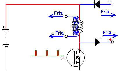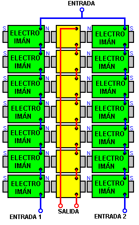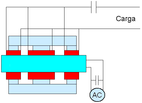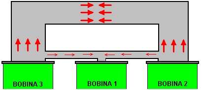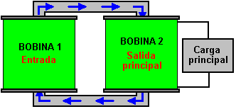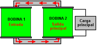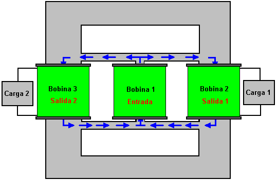 Breve descripción de los dibujos Además, la invención se explicará de una descripción de ejemplos concretos de su forma de realización y de los dibujos adjuntos en los que: ![]() Fig.1 muestra el dispositivo que se está patentado - un transformador de acuerdo con la invención (circuito); ![]() Fig.2 muestra otra realización del transformador de acuerdo con la invención (circuito); ![]() Fig.3 muestra una de las formas de realización del transformador de acuerdo con la invención (circuito); ![]() Fig.4 muestra una realización más del transformador de acuerdo con la invención (circuito); ![]() Fig.5 muestra una realización más del transformador de acuerdo con la invención (circuito); ![]() Fig.6 muestra una de las formas de realización del transformador de acuerdo con la invención (circuito); ![]() Fig.7 muestra una de las formas de realización del transformador de acuerdo con la invención (circuito); ![]() Fig.8 muestra una dependencia estilizada del aumento de la corriente y la tensión en los devanados primario y secundario de un transformador con un circuito magnético de ferrita; La Fig.9 muestra una dependencia estilizada del aumento de la corriente y la tensión en los devanados primarios y secundarios de chapa de acero. Las mejores variantes de realización de la invención: ![]() Un transformador de acuerdo con la invención, de acuerdo con la realización mostrada en la Fig.1 comprende un circuito magnético 1, una primera sección 2 de un devanado primario, una segunda sección 3 del arrollamiento primario, a1 y x1 - la entrada y salida de el devanado de la primera sección, a2 y x2 - el dentro y fuera del devanado de la segunda sección del devanado primario, RH1 - la resistencia de una carga conectada a la primera sección, RH2 - la resistencia de una carga conectada a la segunda sección del devanado primario. Las dos secciones del devanado primario se enrollan en el circuito magnético 1: la primera sección 2, la segunda sección 3 sobre el mismo en una dirección, y tienen un número idéntico de vueltas. El x1 x2 y salidas de los devanados están conectados entre sí en un circuito en serie, mientras que las entradas a1 y a2 de los devanados están conectados por separado a una fuente de alimentación. Una resistencia de carga se conecta en paralelo a cada sección del devanado: RH1 en el camino de la corriente desde la fuente de alimentación a la primera sección del devanado y para el punto de conexión de los devanados de las secciones, y RH2 correspondientemente a la segunda sección del devanado primario. ![]() Un transformador de acuerdo con la invención de acuerdo con la realización mostrada en la Fig.2 se hace similar a la del transformador de acuerdo con la realización mostrada en la Fig.1. Una distinción es en presencia de devanado secundario 4, que se enrolla en una tercera capa en las secciones 2 y 3 del arrollamiento primario en el mismo núcleo del circuito magnético 1. A y X designan la entrada y la salida (dentro y fuera de la fase) del devanado secundario, RH - la resistencia de la carga conectada a los cables A y X del devanado secundario ![]() Un transformador de acuerdo con la invención de acuerdo con la realización según la Fig.3 se hace similar a la del transformador de acuerdo con la realización mostrada en la Fig.2. Una distinción es que las secciones de la devanado primario se enrollan en direcciones opuestas. La salida del devanado de la primera sección de x1 y la entrada del devanado de la segunda sección a2 están conectados entre sí en un circuito en serie, los otros cables de las secciones a1 y x2 sirven como entradas para la fuente de alimentación. ![]() Un transformador de acuerdo con la invención de acuerdo con la realización mostrada en la Fig.4 se hace similar a la del transformador de acuerdo con la realización mostrada en la Fig.2. Una distinción es que las secciones de la bobina primaria 2 y 3 se enrollan en dos núcleos del circuito magnético 1. Las secciones están conectadas entre sí a través de cables opuestos - la salida del devanado de la primera sección y la del devanado en de la segunda sección. Devanado secundario 4 se enrolla en ambas secciones del devanado primario y abarca ambos núcleos del circuito magnético. ![]() Un transformador de acuerdo con la invención de acuerdo con la realización mostrada en la Fig.5 se hace similar a la del transformador de acuerdo con la realización mostrada en la Fig.4. Una distinción es que las dos secciones del devanado primario se enrollan en direcciones, la x1 salidas y x2 de los devanados de las secciones están conectadas entre sí en un circuito en serie opuestos, mientras que las entradas a1 y a2 de los devanados de las secciones servir como entradas para la fuente de alimentación. ![]() Un transformador de acuerdo con la realización mostrada en la Fig.6, se hace similar a la del transformador de acuerdo con la realización mostrada en la Fig.4. Una distinción es que el en de la primera sección a1 y la salida de la segunda sección x2, y también la salida de la primera sección de x1 y la entrada de la segunda sección a2 están conectados el uno al otro, y los puntos de su conexión sirven como entradas para la fuente de alimentación. ![]() Un transformador de acuerdo con la realización mostrada en la figura 7, de acuerdo con la invención, se hace similar a la del transformador de acuerdo con la realización mostrada en la Fig.6. Una distinción es que las secciones se enrollan en direcciones opuestas, por las entradas a1 y a2 y por el salidas x1 y x2 de los devanados de las secciones están conectados el uno al otro, y los puntos de su conexión sirven como entradas para la fuente de alimentación. ![]() El principio de funcionamiento del transformador propuesto de acuerdo con la realización mostrada en la Fig.1 es la siguiente: 1. Circuito abierto (condiciones sin carga) Las entradas a1 y a2 de los devanados de las seccion