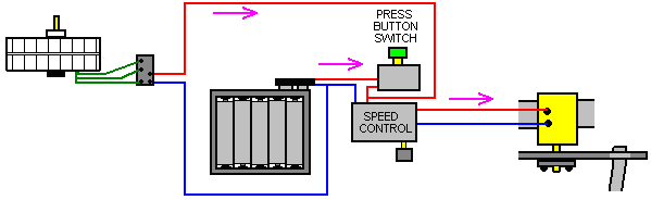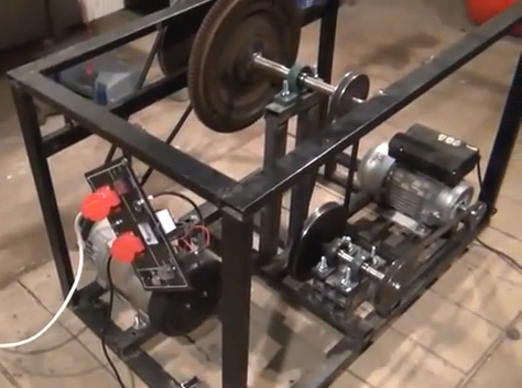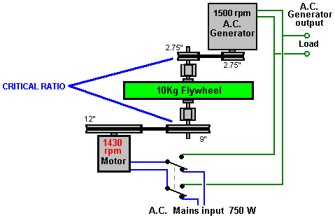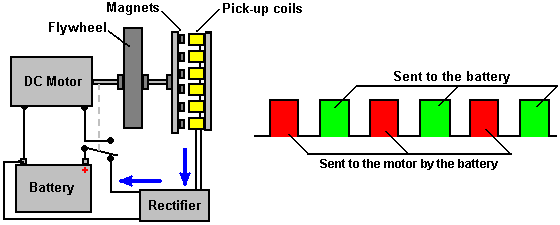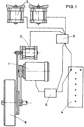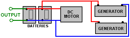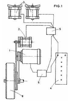The electric drive motor supplies the necessary electromotive force needed for the system to operate, the generator supplies power to the system, charging the battery and providing direct power to the traction motor when needed, or if the battery is fully charged, then just to power the motor. It can go provide direct mechanical power by using pulleys and belts, gears or any other means. The auxiliary generators are responsible for supplying backup power and can use propellers or be in the form of a turbine operating by the action of the wind or by gears attached to a flywheel placed in the traction motor. The function of the battery is to provide the power needed to start the motor and in addition, to supply any extra power that the engine may need during operation. The battery is recharged by the main generator which is driven directly by the motor. The function of the charge controller is to prevent the battery becoming overcharged. The function of the speed controller is to control the speed of the drive motor. The present invention offers the advantages described above, as well as others which will be understood from the example embodiment of the system described in detail below, to facilitate understanding of the features stated above, and introducing at the same time, various in addition to the present specification. It should be understood that the drawings are only by way of example and they do not limit the scope of the present invention in any respect, being just an example of one form of construction. Brief description of the drawings In the drawings: Fig.1, is a diagram of the system as one example of a practical embodiment of the invention. ![]() Fig.2 shows an alternative embodiment of this invention ![]() Description of a preferred embodiment of this invention As shown in the drawing, the self-contained system of energy regeneration, in accordance with an embodiment of the present patent, comprises an electric traction motor (1), a main generator (2), several auxiliary generators (3), a battery or accumulator (4), a charge controller and power supply (5), and a motor speed controller (6) ![]() The electric drive motor (1) provides the necessary electromotive force for operating the system, and its voltage and power are selected in accordance with whatever size of system you wish to construct. The main generator (2) supplies power to the system, firstly, to recharge the battery (4), and secondly, direct power to the motor (1) if it requires it. When the battery (4) is fully charged, its charge is maintained by power from the motor, supplied by suitable pulleys or other method of transmission of mechanical power. The speed of revolution of the generator must be arranged through choice of the gearing between the motor and the generator, so that when the motor is operating at its maximum speed and drawing its maximum current, that the generator is spinning fast enough to supply that current. The main generator (2) will be therefore connected electrically to the battery (4) and mechanically to the motor (1). The auxiliary generators (3), are in the form of a turbine, operating by wind action or by gears attached to a flywheel (7), driven by motor (1), as shown in Fig.2. These auxiliary generators (3) provide reserve power for the system. The battery (4), must have a capacity which exceeds the maximum power of the motor (1), and its role in the system is to provide the power needed to start the motor (1), and to supply any extra energy which the motor (1), may need during operation. The battery is recharged directly by the main generator (2) which is driven by the motor (1). The charge controller and power distributor (5) is positioned between the main generator (2), the auxiliary generators (3) and the battery (4). Its job is to regulate the current draw from the battery (4), to prevent excessive current draw. It also distributes any surplus power as a direct feed to the generator (2) and the drive motor (1) when it needs additional current. The auxiliary generators (3) can either provide additional power to the motor (1), or their power output may be used for any other power needs. The speed regulator (6), is intended to regulate the speed of the motor (1), this adjustment is gradual, and is adjusted to match the intended use of the system. System applications can be many and diverse, noteworthy among which are uses in the automotive field, where it can be used as a means for propelling cars and other motor vehicles, with the motor (1) connected to a drive wheel which propels the vehicle. In these applications, the auxiliary generators (3), can be fitted with propellers or be turbine-shaped, so that the passing wind provides extra energy to the electrical system. With electric vehicles, only the main generator is connected to a drive wheel. Other applications for this system are in the field of energy supply, i.e. use in electrical networks. The advantage of using this patented system is that the power supply is practically inexhaustible and clean, and subject only to component wear and tear during operation. Its operation is as follows: Battery (4) provides the energy needed to start the motor (1), and allows for the possibility of increased electrical input being needed at certain times during operation of the system. The battery (4) is electrically connected to the motor (1) through the speed controller (6), which is fed from the main generator (2) by the load distribution controller (5). The generator (2), is driven directly by the drive motor (1), and the transmission of motion from one component to another is through gears, belts and pulleys, or any other conventional means. The auxiliary generators (3) are electrically connected to the charge controller (5), and the battery (4), and their movement by the wind generates their own energy, having turbine blades or propellers, or through being spun by the flywheel (7) which is connected directly to the motor (1). The energ