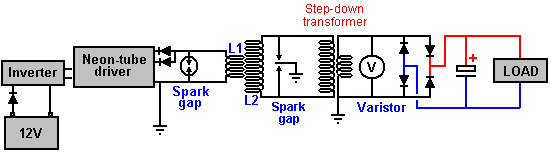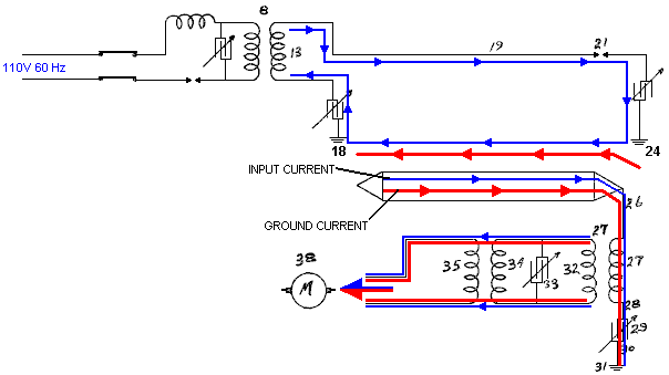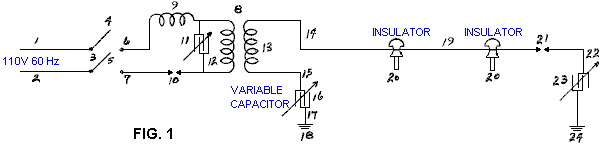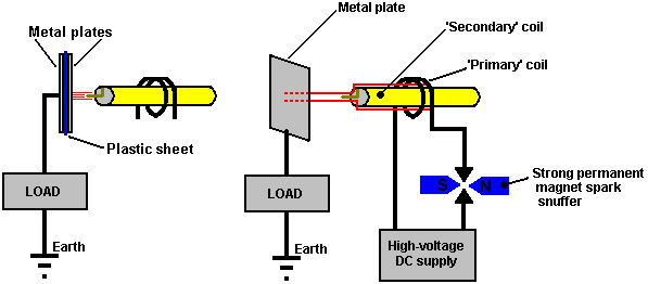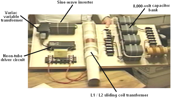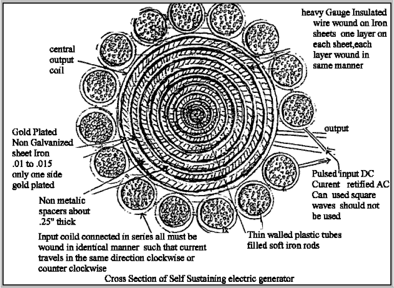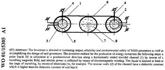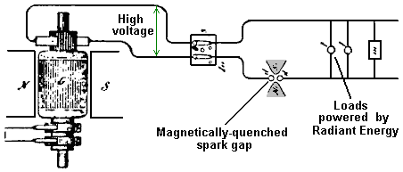 One very interesting feature of free-energy devices is that although various devices which appear to be completely different and have different apparent applications, the background operation is often the same. It is clear that a sharp positive going DC electric pulse interacts with the surrounding energy field, making large quantities of free-energy available for anyone who has the knowledge of how to gather and use that extra energy. Let me stress again that “over-unity” is an impossibility. Over-unity suggests that more energy can be taken out of a system than the total energy which goes into the system. This is not possible as you can’t have more than 100% of anything. However, there is another perfectly valid way of looking at the operation of any system, and that is to rate the output of the system relative to the amount of energy that the user has to put in to make it work. This is called the “Coefficient Of Performance” or “COP” for short. A COP = 1 is when all of the energy put in by the user is returned as useful output. A COP>1 is where more useful energy comes out of the device than the user has to put in. For example, a sailing boat in a good breeze transports people along without the need for the energy of movement to be supplied by the crew. The energy comes from the local environment and while the efficiency is low, the COP is greater than 1. What we are looking for here is not something to tap wind energy, wave energy, sunlight energy, river energy, thermal energy or whatever but instead we want something which can tap the invisible energy field which surrounds us all, namely the “zero-point energy” field. For this, let us look at pulsing circuits used by a wide range of people in a number of apparently quite different devices. An electrical “pulse” is a sudden voltage rise and fall with very sharply rising and falling voltages. However, pulses are seldom generated as isolated events when working with practical devices, so it is probably better to think of a train of pulses, or a “waveform” with very sharp rising and falling edges. These can be called oscillators or signal generators and are so commonplace that we tend not to give them a second thought, but the really important factors for using an oscillator for zero-point energy pick-up is the quality of the signal. Ideally, what is needed cab a perfect square wave with no overshoot, and the voltage level never going below zero volts, or a complex waveform, also with very sharp attack and decay times. These waveforms are a good deal more difficult to generate than you might imagine. Even in these days of sophisticated solid-state electronic devices, the best method of creating a really sharp voltage pulse is still considered to be a spark gap, especially one which has the spark chopped off suddenly by the use of a strong magnetic field at right angles to the spark gap. For an example of this style of operation, consider the following device. Frank Prentice’s COP=6 Pulsed Aerial System. Electrical Engineer Frank Wyatt Prentice of the USA invented what he described as an ‘Electrical Power Accumulator’ with an output power six times greater than the input power (COP = 6). He was granted a patent in 1923 which says: In the development of my WIRELESS TRAIN CONTROL SYSTEM for railways, covered by my United States Letters Patent Number 843,550, I discovered that with an antenna consisting of one wire of suitable diameter supported on insulators, three to six inches above the ground and extending one half mile, more or less in length, the antenna being grounded at one end through a spark gap, and energised at the other end by a high frequency generator of 500 watts input and having a secondary frequency of 500,000 Hz, would produce in the antenna, an oscillatory frequency the same as that of the earth currents and thus electrical power from the surrounding media was accumulated along the length of the transmission antenna and with a closed oscillatory loop antenna 18 feet in length run parallel with the transmission antenna at a distance of approximately 20 feet, it was possible to obtain by tuning the loop antenna, sufficient power to light to full candle power a series bank of 50 sixty-watt carbon lamps. Lowering or raising the frequency of 500,000 Hz resulted in a diminishing of the amount of power received through the 18 foot antenna. Likewise, raising the transmission antenna resulted in a proportionate decrease of power picked up on the receiving antennae and at 6 feet above the earth no power whatsoever was obtainable without a change of voltage and frequency. It is the objective of my generic invention to utilise the power generated by the earth, by the means described here and illustrated in the drawings. The two drawings show simple and preferred forms of this invention, but I wish it to be understood that no limitation is necessarily made as to the exact and precise circuits, shapes, positions and structural details shown here, and that changes, alterations and modifications may be made when desired within the scope of my invention and as specifically pointed out in the claims. ![]() Referring particularly to Fig.1, 1 and 2 are alternating current feed wires supplying 110 volts 60 cycles per second to a high-frequency generator. 3 is a switch with poles 4 and 5, while 6 and 7 are the connections to the high-frequency transformer 8, which is used to step-up the frequency to 500 kHz and the voltage to, say, 100 kV. 9 is an inductor, 10 is a spark gap, 11 is a variable capacitor, 12 is the primary winding and 13 the secondary winding of transformer 8. The secondary winding is connected to ground through variable capacitor 16, and wire 17. Wire 14 connects transformer 8 to the main transmission antenna 19 which is supported along it’s length on insulators 20. Spark gap 21 is positioned between the main transmission antenna 19 and the ground 24, passing through connecting wire 22 and var