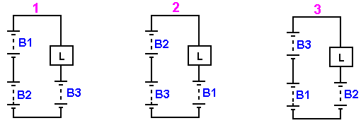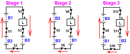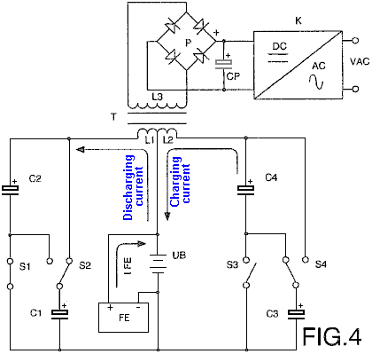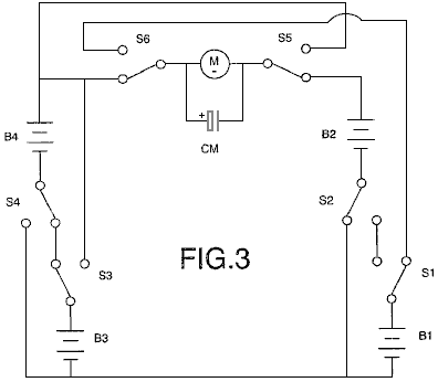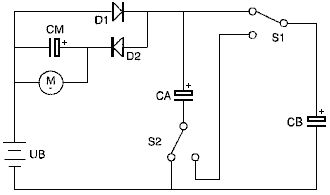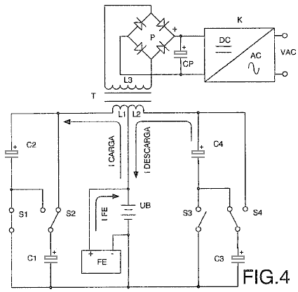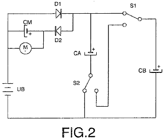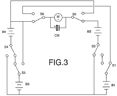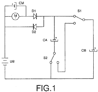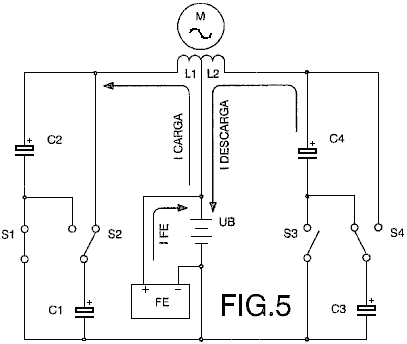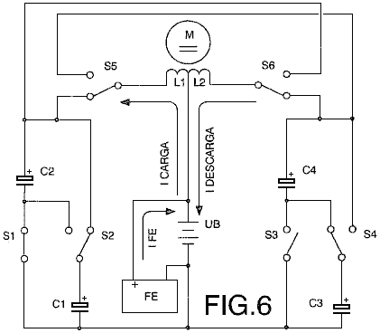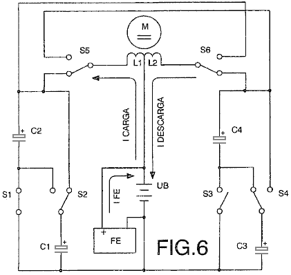 ABSTRACT In the invention an electric current circulates from the battery UB, through the electric motor M, and the diode D1 charges the capacitors CA and CB, connected in parallel, which, once charged, are connected in series, giving rise to a difference in voltage in relation to the battery, causing half the charge of the capacitors to be returned to the battery through the diode D2, whilst with a new parallel connection, the capacitors recharge, this charge being equal to that which had been previously transferred from the capacitors to the battery, so that by means of the cyclic connection of the capacitors in parallel and series the energy is transferred from the battery to the capacitors and from the capacitors to the battery, thus considerably extending the range of the battery and operation of the motor. OBJECT OF THE INVENTION This invention relates to a method and device enabling the electrical energy with which a charge is supplied to be recovered using a self-rechargeable electricity source in which, which by means of a circuit, the current circulating from an accumulator or battery through a load, e.g. a motor, is fully returned to the same, thereby considerably extending its range. More specifically, two capacitors that are connected cyclically from parallel to serial and vice versa are charged through a motor during the connections in parallel, whilst in series connection, when its voltage doubles, they return the electricity, recharging the battery. This source represents a closed system which does not require an energy supply from the outside, except to compensate for the losses produced, the range of the battery being limited by the number of charges and discharges that the same technically permits. BACKGROUND TO THE INVENTION A load, such as an electric motor, is connected to a battery or accumulator with a certain charge, which will be progressively discharged by it, this discharge being directly proportional to the connection time and to the current circulating through the motor. It is therefore necessary to supply fresh energy from an external source to recharge it. Systems that enable the energy consumed by the load to be reused are not known in the state of the art. DESCRIPTION OF THE INVENTION A first aspect of the invention relates to a method for supplying a load with recovery of electrical energy, which comprises supplying a load with electrical energy deriving from the first electrical energy accumulator, and returning at least a proportion of that electrical energy after it passes through the load to the first accumulator for the purpose of recovering the energy supplied. The electrical energy, after passing through the load, is recovered by second electrical energy accumulator, from where it is transferred to the first accumulator, giving rise to cyclic transfer of electrical energy between the first and second energy accumulators. The recovery of energy from the second accumulator and transfer to the first accumulator may be achieved without passing the energy through the load. In another alternative implementation, the energy is recovered from the second accumulator and passed to the first accumulator through the load, in which case the polarity of the load is reversed during the recovery of energy through the load. The transfer of energy is brought about by cyclically connecting two or more electrical energy accumulators between parallel and serial connections. A second aspect of the invention relates to a device for supplying a load with recovery of electrical energy, which comprises a first electrical energy accumulator and a second electrical energy accumulator, where the load is connected between the first and second accumulators. The device may be provided in one embodiment with a unidirectional connection device, for example, a diode which is connected in parallel to the load, causing circulation of the electrical energy recovered after passing through the load, and via which the electrical energy is returned to the first accumulator. The first electrical energy accumulator may be a battery. The second electrical energy accumulator might be two or more capacitors with switching to cyclically connect them between parallel and serial connection configurations. The invention constitutes a self-rechargeable source of electrical energy which enables the range of a battery to be considerably extended so that the current circulating from the same through a motor charges two capacitors connected in parallel, up to the voltage level of the battery, by means of contacts. These capacitors, once charged, are connected in series, producing double their voltage, and they then return the energy to the battery, thereby extending its range. Once the losses have been compensated for, the duration of the extended range depends on the charging and discharging properties of the capacitors. The existence of the difference in voltage between the battery and the capacitors connected both in parallel and in series, and which give rise to the displacement of energy from the battery to the capacitors and vice versa, is used to supply the motor connected between the battery and the capacitors, comprising the self-rechargeable source of electrical energy. When connected in parallel, the capacitors are charged through a motor and a diode, and when connected in series, they are charged through another diode, the voltage of the motor being half that of the battery. On the other hand, if the motor is connected between the battery and the serially-connected capacitors, the latter, which are charged in parallel through a diode and are discharged by means of the motor and the other diode, will supply the motor with a voltage equal to that of the battery, whilst a capacitor connected in series to the winding of the motor guarantees its operation without loss of power. Instead of the two capacitors, two batteries connected in series and another two connected in parallel may be used, be