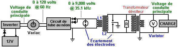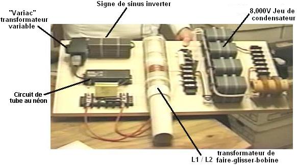 Laissez-moi accentuer encore que “sur - unité” est une impossibilité. Sur - unité suggère que plus d'énergie peut être pris un système que l'énergie totale qui va dans le système. Ce n'est pas possible comme vous ne peut pas avoir plus que 100% de n'importe quoi. Cependant, il y a un autre façon de parfaitement valide qui regarde l'opération de tout système, et c'est estimer la production du système relatif au montant d'énergie que l'utilisateur a pour mettre dans pour le faire travaillez. Cela est appelé le “Coefficient De Performance” ou “C.O.P.” pour brusquement. Un COP = 1 est quand toute l'énergie ont mis dans par l'utilisateur est revenu comme production utile. Un COP>1 est où l'énergie plus utile sort de l'appareil que l'utilisateur doit mettre dans. Par exemple, un voilier dans un bons gens des transports de la brise le long de sans le besoin pour l'énergie de mouvement être fourni par l'équipage. L'énergie vient de l'environnement local et pendant que l'efficacité est basse, le COP est plus grand que 1. Que nous cherchons ici n'est pas quelque chose pour tapoter l'énergie du vent, énergie de la vague, énergie de la lumière du soleil, rivière énergie d'énergie, thermique ou quoi que mais au lieu nous voulons quelque chose qui peut tapoter le champ d'énergie invisible qui nous entoure tout, à savoir le “zéro point énergie” champ. Pour ceci, laissez-nous regarder des battant circuits utilisés par une grande gamme de gens dans plusieurs appareils apparemment tout à fait différents. Un électrique “pulsation” est une montée du voltage soudaine et chute avec augmenter très taillé fin et voltages tombants. Cependant, les pulsations sont rarement produites comme événements isolés quand travailler avec les appareils pratiques, donc c'est meilleur de penser à un train de pulsations probablement, ou un “waveform” avec très brusquement soulèvement et bords tombants. Ceux-ci peuvent être appelés des oscillateurs ou des générateurs du signal et sont si banal que nous avons tendance à ne leur pas donner de deuxième pensée, mais les facteurs vraiment importants pour utiliser un oscillateur pour zéro point pick-up d'énergie sont la qualité du signal. Idéalement, ce de qui est eue besoin peut être une parfaite vague carrée sans dépassez, et le voltage nivelle n'aller jamais zéro volts au-dessous, ou un waveform complexe, aussi avec attaque très tranchante et temps de la déchéance. Ces waveforms sont une bonne affaire plus difficile de produire que vous pouvez imaginer. Même la meilleure méthode de créer une pulsation du voltage vraiment tranchante est encore considérée pour être un intervalle de l'étincelle dans ces jours d'appareils électroniques transistorisés sophistiqué, surtout un qui a l'étincelle a coupé par l'usage d'un champ aimanté fort à angles droits à l'intervalle de l'étincelle soudainement. Pour un exemple de ce style d'opération, considérez l'appareil suivant. Frank Prentice. Ingénieur Frank Wyatt Prentice électrique de l'USA a inventé ce qu'il a décrit comme un ‘Accumulateur du Pouvoir Électrique ' avec un pouvoir de la production six fois plus grand que le pouvoir de l'entrée (COP = 6). Il a été accordé le brevet 253,765 Américain 18e le 1923 septembre et lequel dit: Mon invention est en rapport avec les améliorations dans Accumulateurs du Pouvoir Électriques, où le monde qui agit comme rotor et l'air environnant comme un stator, rassemble l'énergie donc a produit par le monde qui tourne sur son axe, utilise le même pour pouvoir et autres buts. Dans le développement de mon Système du Contrôle du Train De TSF pour les voies ferrées, a couvert par mon États-Unis Lettres Brevet Nombre 843,550, j'ai découvert que, avec une antenne qui consiste en un fil de diamètre convenable supportée en séparer des moyens trois à six pouces au-dessus de la terre et étendant un demi mille, plus ou moins dans longueur, l'antennae dit qui est fondé à une fin à travers un intervalle de l'étincelle et a stimulé à l'autre fin par un haut générateur de la fréquence de 500 Watts entrez le pouvoir et avoir une fréquence secondaire de 500,000 Hz, produirait dans l'antenne une fréquence oscillatoire le même comme cela des courants du monde et donc le pouvoir électrique du média environnant a été accumulé le long de la longueur de l'antenne de la transmission et avec une antenne de la boucle oscillatoire fermé 18 pieds dans parallèle de la course de la longueur avec l'antenne de la transmission à une distance d'approximativement 20 pieds c'était possible d'obtenir en réglant l'antennae de la boucle, pouvoir suffisant allumer à pouvoir plein, une banque de la série de cinquante lampes du carbone de 60 watts. Baisser ou élever la fréquence de 500,000 Hz a résulté en diminuer le montant de pouvoir reçu sur l'antenne de 18 pieds. De la même façon, élever l'antenne de la transmission a résulté en une baisse proportionnelle de pouvoir reprise sur l'antenne de la réception et à 6 pieds au-dessus du monde aucun pouvoir à tout était procurable sans un changement de capacité et fréquence. C'est l'objectif de mon invention générique pour utiliser le pouvoir produit par le monde comme décrit ici, et a illustré dans les dessins. Les deux chiffres dans les dessins illustrent simple et ont préféré des formes de cette invention, mais je souhaite qu'il comprît qu'aucune limitation n'est faite comme aux circuits exacts et précis, formes, places, et détails structurels montrés ici nécessairement, et que les changements, modifications et modifications peuvent être faites quand a désiré dans le possibilité de mon invention. LA DESCRIPTION: ![]() Dans Fig.1: 1 et 2 sont des fils de l'alimentation du courant alternatif qui fournissent des 60 cycles de 110 volts à un haut générateur de la fréquence. 3 sont un changement avec les contacts 4 et