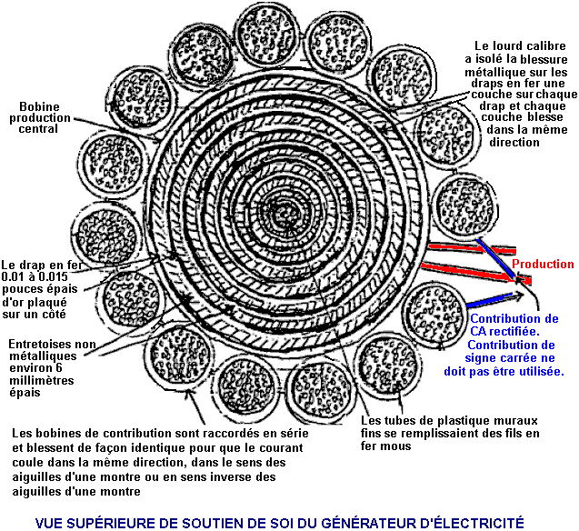 Imaginez une méthode d'attacher les casquettes aux côtés de l'unité et un moyen de placer les bobines fondamentales externes afin qu'ils sont tout contenus dans leurs places correctes. Portez dans esprit que les forces aimantées puissantes seront présentes et que l'unité elle-même sera assez lourde, donc d'une construction de la forme forte est eue besoin. Une suggestion est utiliser des goujons tenir les casquettes dans place et utiliser le spacers plastique convenablement façonné placer et tenir les bobines fondamentales en place. Une fois les casquettes sont allées parfaitement, le générateur devient un accumulateur de l'orgone très fort. ![]() Le fer or - plaqué est beaucoup, beaucoup de fois plus efficace que toute autre matière métallique. L'effet de l'accumulateur augmente l'efficacité du générateur grandement. Tester Maintenant que vous avez complété tout le travail de la construction réellement, vous avez besoin maintenant d'une unité du conducteur de l'entrée convenable qu'aurait dû être testée entièrement et préparée pour conduire l'unité. Soyons optimiste et accrochez une bonne charge de la dimension pour le deux radiateur secondaire défend (appareils de chauffage électriques) devrait faire pour commencer avec. À travers les terminaux de la production vous pouvez connecter tout l'équipement de l'épreuve habituel. Le résumé La construction des bobines secondaires peut être emportée en complétant les pas suivants: