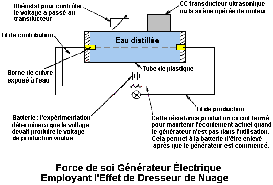 Le champ électrostatique, couplé avec l'action de la couche BaTiO3 (si nous faisons une demande électrique classé à BaTiO3, alors cette couche crée les vibrations solides d'environ 25,000 Hz, cette vibration aide à décomposer les molécules d'eau) et facilite le de plus se décomposent des structures atomiques moléculaires d'eau. Aussi, en raison des renvois électrostatiques perpétuels, la panne des structures cavitation-à-vide se produit et la fusion froide que la réaction nucléaire continue. Avec cette fusion l'énergie de 500 kJ/mole est libérée dans un vide et une énergie de 6 kJ/mole est libérée dans l'eau. Ainsi, de nouvelles obligations hydrogènes se forment dans le vide avec la libération d'énergie d'environ 20 taupe kJ/. En raison de ce processus l'accélération d'ionisation de liquide polaire survient. En plus, 'le fait de faire partir au lavage' constant de l'électron incomplet bindings de la couche de baryum titanate se produit et la forme d'électrons libre. En raison de ce processus, le liquide polaire transforme dans un écoulement ordonné d'électrons et d'ions négatifs, qui peuvent être décrits très simplement, comme un courant électrique ionique. Le travail sur la construction du générateur expérimental commencé en septembre de 1991 en Arménie et est venu à une fin en mars de 1992. Le poids travaillant actif du prototype de dynamo (torus l'eau) était environ 900 kg. Le diamètre du torus était environ 2 mètres. Le torus a été fait de polysterol optique résistant à impact. Ce torus s'est composé de deux moitiés, qui ont été tournées sur la machine de manège. Le baryum monocrystallic titanate BaTiO3 a été arrosé sur la surface intérieure de torus, son diélectrique permittivity était 6000. L'épaisseur de la couche était environ 1 micron. L'eau a été purifiée à la résistance spécifique de 18,000,000 Ohm/cm. Comme nous avons mentionné ci-dessus, commencer la dynamo deux jarres de condensateur de 10 Farad chacun a été utilisé. L'énergie d'une batterie de départ a constitué 20,000 Joules, le voltage était 100,000 Volts et le courant était 0.05 Ampère pour fournir le mouvement initial d'eau (l'accélération et les troubles). Les électrodes ont été faites des tubes en métal avec le diamètre d'environ 5 millimètres. La dynamo est commencée en utilisant ces électrodes. Un total de 32 de ces électrodes a été installé uniformément espacé autour de la circonférence du tore. Le système de refroidissement du tore a formé un circuit fermé de cuivre piping avec l'eau purifiée faite circuler par cela. Les tubes couleur cuivre utilisés dans ce système ont été couverts avec l'isolation de verre. Ils étaient aussi les tours de sinuosité de charge. La température de tore a été maintenue pas plus haut que 50 degrés Celsius. Une puissance de sortie moyenne était 220 volts x 6,800 ampère = 1,490 kilowatts. Le courant était le courant continu. Périodiquement le pouvoir pourrait être augmenté à 2,500 kW quand le refroidissement suffisant du générateur pourrait être fourni. Le pouvoir supplémentaire a été tiré de quatre windings résonnants. Ce courant alternatif, après la rectification, a été utilisé pour charger la batterie de renfort. Ainsi, la puissance de sortie totale a constitué plus de 1,500,000 watts. Le voltage de fréquence basse a été obtenu de la charge windings et le courant continu a été obtenu de la chambre stabilisation. Il devrait être noté que les renvois de haut voltage des 32 électrodes, ionisez de l'eau partiellement pré-ionisée davantage. Au moyen de la stimulation windings, un champ magnétique circulant est créé qui déplace de l'eau dans une direction à l'intérieur du tore. Une force électromotrice est créée par l'induction électromagnétique dans un ensemble séparé windings. Comme nous avons déjà mentionné, pendant le mouvement du ruisseau d'eau, les électrons libres sont créés et une énergie supplémentaire est émise à cause de la friction de l'eau contre la couche de couche sur la surface intérieure du tore, à cause des pannes électrostatiques de structures à vide de cavité et à cause de la réaction nucléaire en cours. Si la production de la dynamo est 1,000,000 de watts, c'est le pouvoir de contribution total est environ 10,000 watts. Donc donc l'efficacité d'énergie de la dynamo est environ 10,000 %. En plus du baryum titanate déposé sur la surface intérieure enduite de téflon du tore de polystyrène, l'eau lui-même aussi contient du baryum très petit titanate les cristaux qui sont suspendus dans l'eau. Les ultrasons à 25,000 cycles par seconde sont propagés par l'eau pour former des micro-bulles d'air sur les surfaces du baryum suspendu titanate les cristaux. De nouveau en raison de l'action piézoélectrique du titanate de baryum, les champs très haut électrostatiques sont aussi développés dans les micro-bulles d'air à la surface des cristaux. Les électrons de la réaction nucléaire sont ajoutés aux électrons produits à la surface intérieure du tore. La somme totale de baryum mono-cristallin titanate dans la dynamo arménienne était presque 1000 grammes. Les satellites, les locomotives, les lourds camions, les aéroplanes et les navires sont des applications de transport évidentes. Économie de Dynamo Le prix de production de la dynamo est estimé à $500 par kilowatt qui est très compétitif quand comparé aux prix de capitale de puissance neutronique de $5,000 par kilowatt, les prix de capitale de moulin à vent de $4,000 par kilowatt, etc. Une centrale atomique bien-dirige peut produire le pouvoir pour 1.5 cents par heure de kilowatt, le charbon 1.8 cents, le gaz naturel 3.4 cents et pétrole 4.1 cents, en moyenne. Les frais d'exploitation de la dynamo seraient environ 0.1 cents par heure de kilowatt sans combustible externe nécessaire et sans n'importe quelle pollution étant créé