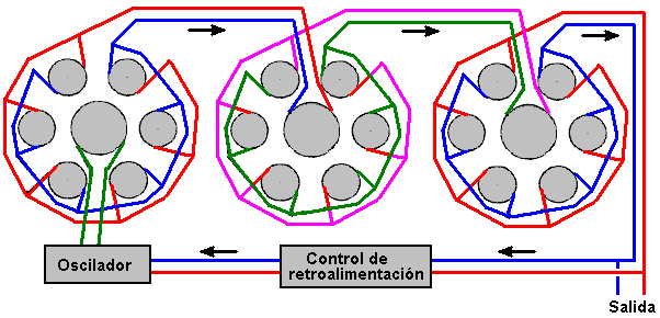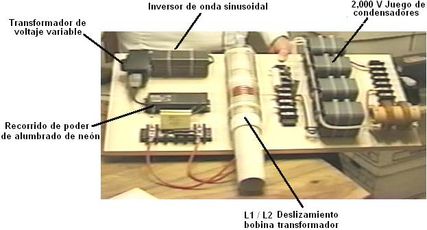 Aparece el dispositivo de ese Floyd se comprendió de una o dos ferrita grande los imanes permanentes (calidad 8, el tamaño, 150 mm x 100 mm x 25 mm) con bobinas heridos mutuamente en tres aviones a los ángulos rectos a nosotros (es decir in el x, y, z hachea). El magnetización de los imanes de la ferrita es modificado aplicando 20,000 Voltios de repente de un banco de condensadores (510 Julios) o más a los platos en cada lateral de él mientras manejando un 1 simultáneamente El amperio 60 Hz (o 50 Hz) la corriente alterna a través del bobina dando energía a. La corriente alterna debe ser a la frecuencia requirió para el rendimiento. El pulso de voltaje a los platos debe aplicarse al momento cuando el ‘UN ' bobina voltaje alcanza una cresta. Esto necesita ser comenzado electrónicamente. Se dice que el impulsando de las causas de los platos el material magnético para resonar para un periodo de aproximadamente quince minutos, y que el voltaje aplicado en el bobina dando energía a modifica el posicionamiento de los polos recientemente formados del i mán que para que quiera en el futuro, resuene a esa frecuencia y voltaje. Es importante que el voltaje aplicó al bobina dando energía a en este ‘que condiciona el proceso de ' sea una ola del seno perfecta. Asuste, o fuera de la influencia el ‘que condicio na ' pueda destruir pero puede reintegrarse repitiendo el proceso condicionando. Debe notarse que el proceso condicionando no puede estar el éxito en el primer esfuerzo pero repitiendo el proceso en el mismo imán normalmente es el éxito. Condicionando una vez se completa, los condensadores ya no se necesitan. El dispositivo entonces sólo necesidades que unos miliwatts de 60 Hz aplicaron al bobina de la entrada para rendirse a 1.5 Kw a 60 Hz al bobina del rendimiento. La bobina del rendimiento puede proporcionar entonces indefinidamente la bobina de la entrada. El proceso condicionando modifica el magnetización de la tabla de la ferrita. Antes del proceso el polaco Norte está en una cara del imán y el polo Sur en la cara opuesta. Después de condicionar, el polaco Sur hace no detenga al punto medio pero se extiende a los bordes exteriores de la cara del polo Norte, mientras extendiendo el dentro del borde por aproximadamente 6 mm. Hay también, un ‘magnético burbujea ' creó en el medio de la cara del polo Norte y la posición de este ‘burbujee ' mueve cuando otro imán se lo trae casi. La tabla condicionada tiene tres bobinados del bobina: