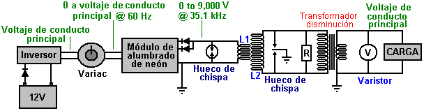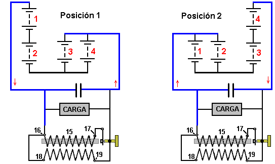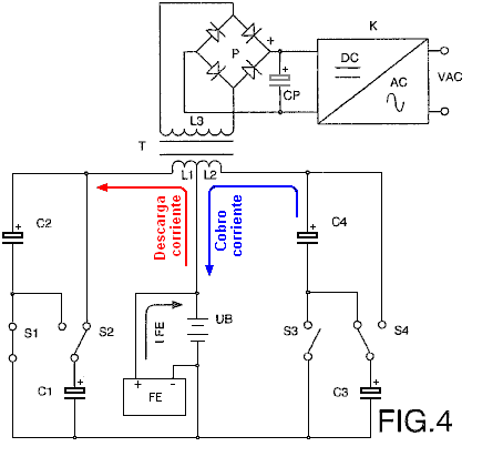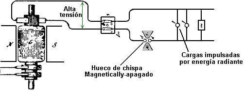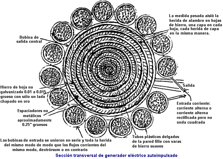 Este sistema produce un suministro constante aumento de la corriente eléctrica que fluye a través del alambre 32, y por lo tanto, el interruptor 34 puede ser cerrado, lo que permite transformador 10 para proporcionar la energía eléctrica para hacer funcionar el motor 12 que mantiene el eje 44 en rotación continua, haciendo que el sistema autoalimentado sin necesidad de ningún tipo de fuente de alimentación externa. Transformadores adicionales insertados en el alambre 32 se pueden utilizar para equipo adicional de energía. Sin el empleo de las corrientes de alta frecuencia se ha descrito anteriormente, los resultados similares se pueden lograr por medio de la disposición que se muestran en el lado inferior derecho de la mano de la siguiente dibujo: ![]() Aquí, la bobina primaria 50 está conectado como se muestra por las líneas de trazos, con los alambres 19 y 20 de la disposición anterior, y el cable 53 se conecta a ambos de alambre 27 y el alambre 28. Esta disposición tiene devanado primario 50 conectado a través de su extremo 51 para cablear 20 y así está conectado de forma permanente a las placas exteriores de condensador banco 1, y su otro extremo 52 está conectado al cable 35 se forma intermitente conectado a tierra. Alambre 53 está conectado a los cables 27 y 28 se intermitentemente conectar entre sí, las placas internas del banco de condensadores 54 y las placas internas del condensador banco 1. Con esta disposición, los dos extremos del devanado secundario 55 están conectados a través de diodos 56 y 57, para conectar 53. Las placas exteriores del banco de condensadores 54 están conectados de forma permanente a través de bobinado primario 58 a tierra. Ambos extremos de la secundaria 59 están conectados a través de diodos 60 y 61, de vuelta al cable 53. Como resultado, si el banco condensador 1 se carga, que conduce una corriente a través del alambre 20 y así, a través del devanado primario 50, y a tierra a través de los cables 35 y 39. Esto induce una corriente en el devanado secundario 55, que se almacena en las placas interiores de ambos banco de condensadores 54 y el condensador banco 1, como en este momento, el circuito está cerrado entre las escobillas 29 y 31, y por lo tanto, el alambre 53 está conectado al cable 32. Al recibir estos nuevos cargos, tanto del banco de condensadores 1 y batería de condensadores 54 crearán nuevas corrientes eléctricas inducidas fluyen a través de bobinas primarias 50 y 58. Estos múltiples impulsos de carga disminuirá con el tiempo hasta que son insignificantes, momento en el cual, debido a la rotación del eje 44, ya no se mantiene la conexión entre las escobillas 29 y 31 y entre las escobillas 36 y 38, y en su lugar, los cepillos 18 y 17 llegará a ser conectados, descargando banco de capacitores 1 al extremo de la bobina primaria 50, que es una descarga muy fuerte, la carga de batería de condensadores 54 como alambre 53 está desconectado del cable de 32. Esto, a su vez, provoca potente flujo de corriente a través de devanado primario 58, de carga más banco de condensadores 54 que luego alimenta condensador banco 1 cuando el eje 44 gira adicionalmente, haciendo que el sistema tanto con alimentación propia y capaz de suministrar energía eléctrica útil para otros equipos. Se debe entender claramente que el uso de convertidores de vapor de mercurio o diodos de válvula catódica como se ha descrito, no son de ninguna manera indispensable en el sistema como esos dispositivos pueden ser reemplazados por una disposición adecuada de los condensadores que recibirían por separado, la directa e inversa corrientes de los secundarios. Cuando una campana se toca sólo una vez, que vibra muchas veces, pasando esas vibraciones al aire y por lo tanto, haciendo que el sonido que oímos. Cuanto más grande es la campana, la más lenta de las vibraciones y el más bajo es el tono de la nota que escuchamos. Lo mismo ocurre cuando se aplica un pulso fuerte tensión a una bobina de alambre como un solo pulso provoca muchas vibraciones en la bobina. Al igual que la campana, la frecuencia de las vibraciones depende de la estructura de la bobina y no en la forma en que es pulsado, aunque, como una campana, un fuerte pulso de una bobina o de un golpe fuerte para una campana, produce un efecto mayor. Usted notará aquí que Carlos utiliza el 'zumbido' de resonancia de una bobina con núcleo de aire para obtener una ganancia de energía que se utiliza como retroalimentación positiva a una mayor carga una batería de condensadores. Un único pulso agudo generada por una chispa, provoca un gran número de oscilaciones de bobina, cada uno de los cuales contribuye de potencia de salida, produciendo una ganancia de energía. La frecuencia de llamada es susceptible de ser alrededor de 3 MHz. También vale la pena señalar que con este diseño, la generación de electricidad se puede lograr sin ninguna batería y sólo el giro manual de un generador electrostático de Wimshurst y la operación inicial del eje de conmutador 44. Carlos también produjo otro diseño, esta vez trabajando con baterías (aunque tendía a pensar en términos de bancos de baterías de 60 voltios en lugar de baterías de 12 voltios) y su patente incluye lo que tendemos a llamar el "Interruptor de Tesla" hoy en día. Sin embargo, en vez de cambiar rápidamente, Carlos utiliza un intervalo de tiempo de conmutación de una hora. La tensión más baja supera la necesidad de los contactos de conmutación a ser sumergidos en aceite. El problema con las baterías de plomo-ácido es que son sólo el 50% de eficiencia. En términos prácticos, sólo salir de un medio batería cargada de la corriente alimentada en él cuando se esté cargando. Por lo tanto, si usted acaba de cambiar cuatro baterías y fuente de una carga de esa manera, las baterías sin duda la descarga. En el caso de que el personal Electrodyne Inc., que utilizan la conmutación rápida y la inte
