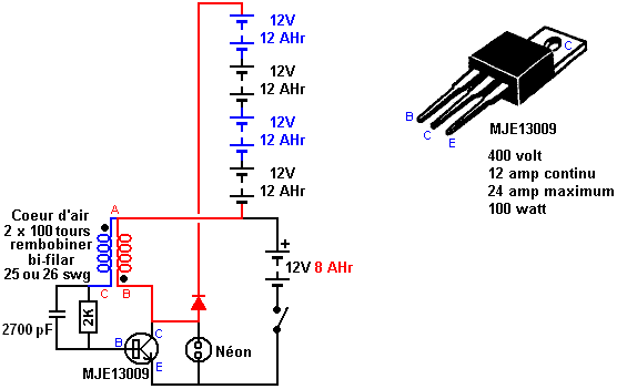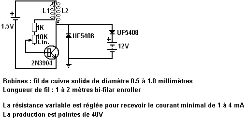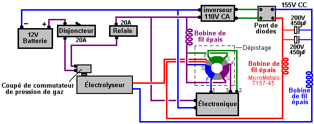 Dans la mise en œuvre de mon invention, je Niveau un morceau de terrain de superficie suffisante pour contenir la ou les chaînes de génération. Par exemple, pour trois cents éléments positifs chacun 500 mm de long et 50 mm de diamètre, courbé, comme indiqué sur la Fig.3, la longueur de la pièce de sol doit être d'environ 32 mètres et 1 mètre de large. Je creuse 43 trous à une distance de 735 mm de distance (centre à centre) dans une ligne. Chaque trou est de 250 mm de large et 750 mm de long et assez profond pour contenir les sept paires d'électrodes. Le sol meuble creusé des trous est mélangé avec le sel ou acide choisi afin de rendre le générateur actif. Par exemple, si le sol est une terre végétale, puis de l'acide nitrique concentré du commerce doit être ajouté en quantité suffisante pour saturer le sol, et le peroxyde de manganèse ou de bioxyde de manganèse doit être mélangé avec la masse. Si le sol a un caractère sableux, puis de l'acide chlorhydrique ou du carbonate de sodium ("lavage à la soude") ou de la potasse peuvent être utilisées. Si la bobine est une argile, puis de l'acide chlorhydrique ou l'acide sulfurique et le chlorure de sodium peuvent être utilisées, le sel étant dissous dans de l'eau et on le verse dans le trou avant que l'acide est mélangé avec le sol. Le fond du trou est humidifié avec de l'eau et le sol préparé mélangé avec de l'eau jusqu'à la consistance d'une pâte épaisse est ensuite placé dans le trou, qui entoure les électrodes. Les 43 groupes d'électrodes lorsque câblés en série comme le montre la Fig.1, donnera 53,85 volts et 56 ampères, l'élaboration d'un total de 3 015 watts. ![]() En augmentant le nombre de cellules, la capacité de la génératrice peut être augmentée de façon correspondante à une puissance de sortie souhaitée. Le corps prêt du sol devrait être périodiquement humidifié, de préférence avec l'acide avec lequel il a été traité lors de la première préparé pour l'action. Dans un générateur destiné à être utilisé en continu, je préfère fournir un réservoir tel que représenté par "A" sur la Fig.6, et d'exécuter un tuyau fait d'un matériau qui ne est pas attaquée par l'acide, le long de la chaîne d'éléments, avec une buse sur chaque élément de sorte que tous peuvent être humidifiées très facilement. Toute accumulation d'oxydes ou d'autres produits de la réaction entre le sol préparé et les électrodes peut être retiré en augmentant l'électrode positive et forçant alors le remettre en place à nouveau. L'électrode de carbone peut être nettoyée en tournant simplement sans la soulevant de sa place. Je estime que la durée d'utilisation du générateur au cours de laquelle aucune addition de sel ou d'acide est nécessaire, augmente avec la durée d'utilisation. Par exemple, lors de la première journée d'utilisation, l'acide ou de sel devraient être ajoutés après 10 heures d'utilisation, après quoi il sera un rendement de 26 heures de service, puis après l'autre humidifiant il fonctionnera pendant 48 heures, et ainsi de suite, progressivement augmentation de la durée entre être humidifié. Ce générateur fonctionne de façon très cohérente et fiable. De nos jours, on trouve courant réseau à tension alternative la plus pratique à utiliser. Pour un système de ce genre, nous serions enclins à utiliser un onduleur ordinaire qui fonctionne sur douze volts ou vingt-quatre volts. Cependant, il convient de rappeler que le courant de travail d'entrée est élevé et donc, le fil utilisé pour transporter que les besoins actuels d'être épaisse. A 12V, chaque kilowatt est un courant d'au moins 84 ampères. Au 24V que le courant est 42 ampères (l'onduleur lui-même est plus cher car moins sont achetés). Usage domestique considérable peut être eu d'un inverseur de 1500 watts. La construction fer / carbone tendre décrite par Michael Emme produit 54V à partir de 43 ensembles d'électrodes, indiquant autour de 1,25V par set à haute consommation de courant. Il semble raisonnablement probable que dix ou onze ensembles d'électrodes donneraient autour de 12V à courant élevé et trois de ces chaînes reliées en parallèle doit être capable d'alimenter un convertisseur 12V 1500 watts en continu à coût de fonctionnement extrêmement faible. Un Chargeur de Batterie Pour Seule Batterie Johan Booysen d'Afrique du Sud utilisé circuits de électrolyseur développé par Bob Boyce d'Amérique, pour charger une batterie. La chose importante est qu'il y avait une seule batterie impliqué que la batterie est chargée en fait alimenté le circuit de charge. La batterie en cause était une batterie de 12 volts au plomb-acide 18 ampères-heure qui a donc une efficacité de seulement 50%, ce qui signifie que la batterie doit recevoir deux fois plus de courant par rapport au courant qui il peut revenir par la suite. Johan utilisé la batterie pour alimenter une voiture jouet qui sa jeune fille joue avec. Il a accusé batterie pendant la nuit afin qu'elle puisse l'utiliser le lendemain à conduire autour. ![]() Alors que la vitesse maximale de la voiture est à seulement deux ou trois miles par heure, le point important est que la vraie, l'énergie authentique est mis dans la batterie tous les soirs, de l'énergie qui alimente le de voiture-jouet chaque jour. Un dispositif de ce type, qui peut charger une batterie sans soleil, sans la nécessité pour le vent et sans avoir besoin de carburant, a d'importantes applications pour les personnes vivant dans des régions éloignées où il n'y a pas d'alimentation secteur et ne sera jamais comme il est pas économique pour exécuter des lignes électriques il. La question est: un tel dispositif peut être faite qui est fiable et sûr à utiliser? AVERTISSEMENT: les informations suivantes est PAS pour les débutants mais il est uniquement destiné aux personnes qui ont de l'expérience dans l'électronique