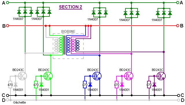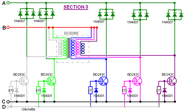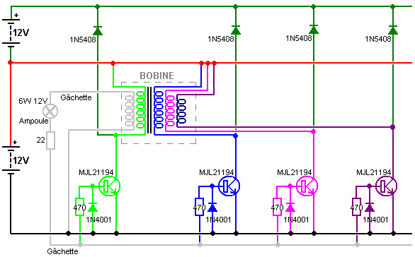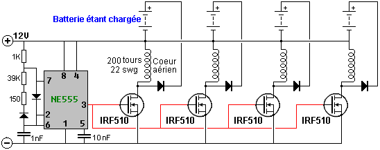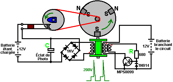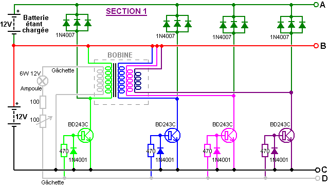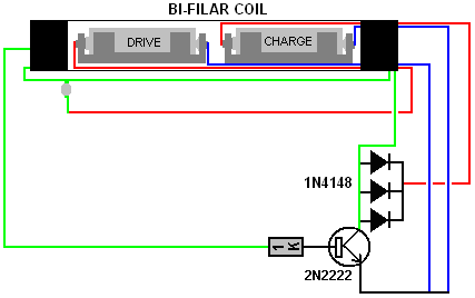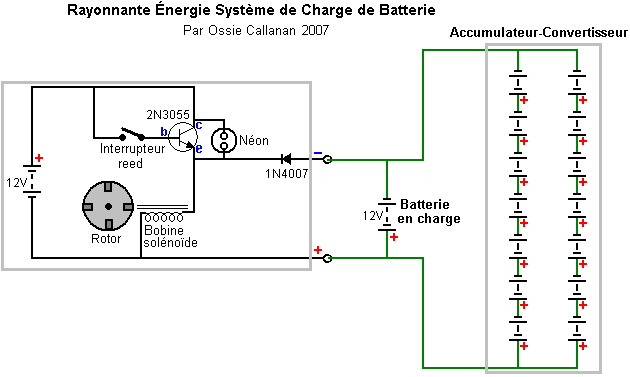 Un point important comprendre est que les ions en tête les plaques de la batterie ont beaucoup de plus grande inertie que les électrons font (plusieurs cent mille fois en fait). Par conséquent, si un électron et un ion sont les deux donné une poussée identique soudainement, l'électron accomplira le mouvement rapide beaucoup plus rapidement que l'ion veut. Il est supposé que le courant de l'électron externe est dans phase avec le courant de l'ion dans les plaques de la batterie, mais ce besoin n'est pas donc. John Bedini délibérément exploits la différence de vitesse en appliquant un augmenter potentiel aux plaques de la batterie très taillé fin. Dans le premier instant, cela cause des électrons de s'entasser au-dessus sur les plaques pendant qu'ils attendent pour le beaucoup ions plus lourds obtenir déplacer. Ce tas en haut de poussées des électrons le voltage sur le terminal de la batterie augmenter à autant de 100 volts. Ce dans tour, causes l'énergie sortir dans le circuit en arrière aussi bien que dans la batterie, donner simultanément, pouvoir du circuit et niveaux sérieux de chargement de la batterie. Cela sur capacité cause aussi beaucoup a augmenté le courant du pouvoir de l'environnement dans le circuit, donner les deux à pouvoir augmenté pour conduire le circuit externe et pour augmenter le taux de charge de la batterie. La batterie demi du circuit est maintenant 180 degrés hors de phase avec le circuit - propulsant demi du circuit. C'est important de comprendre que l'énergie de la circuit - conduite et l'énergie du batterie - chargement ne viennent pas des pulsations tranchantes appliquées à la batterie. Au lieu, les courants d'énergie supplémentaires dans de l'environnement, a déclenché par les pulsations produites par le circuit Bedini. En d'autres termes, le Bedini bat acte comme un robinet sur la source d'énergie externe et n'est pas eux-mêmes la source du pouvoir supplémentaire. Si le circuit Bedini est ajusté correctement, la pulsation est coupée très taillé fin seulement avant l'afflux d'énergie tapoté va terminer. Cela a un plus loin rehaussant effet dû à la Lenz loi réaction qui cause un mouvement puissant du voltage provoqué qui peut prendre le sur - voltage potentiel à autant de 400 volts. Cela a un effet supplémentaire sur l'environnement local, en tirant dans un même plus haut niveau de pouvoir supplémentaire et étendre la période de temps pendant qui ces courants du pouvoir du supplément dans le circuit et la batterie. C'est pourquoi l'ajustement exact d'un Bedini qui bat système est si important. Système d'Énergie Libre de Ossie Callanan. En 2007, Ossie Callanan a publié un document montrant comment et pourquoi il devenait COP>1 recharge de la batterie. Système de Ron Pugh aimablement partagé en détail ci-dessus, avec un réglage soigneux et fonctionne sur 24 tension d'entrée et de sortie 24 volts fonctionne à COP>10, qui est susceptible d'être dû à l'habileté de Ron dans la construction et l'ajustement, qui sont tous deux très bon en effet, couplé avec l'utilisation de nombreux transistors fonctionnant en parallèle et triplé charge diodes pour améliorer leur performance. Le système d'impulsion charge John Bedini SSG est très facile à construire et fonctionne très bien, même avec de nombreuses batteries sulfatées qui ont été rejetées comme inutiles. Cependant, la plupart des gens ne vont pas obtenir performance COP>1 à partir de leur propre SSG construire. Ossie explique pourquoi c'est dans la section suivante, qui est son auteur. Il dit: Je crois que je peux avoir ce système d'énergie rayonnante élaboré au point où n'importe qui peut construire et quand vous construisez tout cela, il peut vous fournir de l'énergie libre et continu. Il ya deux côtés à la circuit et avoir juste part et d'autre n'est pas bon, vous devez avoir les deux. Un côté est le côté d'impulsion chargeur, et l'autre est la batterie d'accumulateur et sur le côté du convertisseur. À l'heure actuelle, je suis batteries en charge à un niveau de performance entre COP=2 et COP=10 et échange de batteries n'est pas un problème. Premièrement, nous devons mettre l'accent sur le côté du chargeur du système. Fondamentalement, vous devez construire un chargeur qui produit de grandes quantités d'énergie rayonnante sous la forme d'impulsions radiants. Des impulsions d'énergie rayonnante sont des impulsions de force contre-électromotrice à condition qu'ils aient des fronts montants très rapides et des fronts descendants, et se produisent à des fréquences élevées. Ils ne sont pas transistor transitoires ou transitoires de commutation! Un éclateur produit des impulsions d'énergie classiques radiants. Ce sont des événements chaotiques mais ils sont des événements d'énergie radiante néanmoins. Passage d'une bobine sur l'utilisation très rapidement un transistor va produire une impulsion d'énergie rayonnante de inverser-EMF de la bobine, mais une impulsion sur sa propre n'est pas bon. Vous devez milliers ou, mieux encore, des millions de ces impulsions pour eux d'être d'une quelconque utilité pratique. École simplifié fille de John Bedini moteur (le "SGS") ne produit qu'une très petite quantité d'énergie rayonnante quand vous avez la base du transistor à l'écoute de sorte que vous obtenez la plus longue autonomie train d'impulsions oscillant à chaque passage de l'aimant. Il n'est pas très efficace car la diode base-serrage gaspille cette énergie, en la passant à travers le circuit résistance-ampoule base, mais ce circuit, il est nécessaire de sorte que vous pouvez synchroniser le fonctionnement et fournir une force motrice à l'aimant qui passe. Sans la diode base-serrage, vous obtenez un oscillateur et le moteur ne tourne pas - Catch 22. Mais encore, même lorsque l'on est avec la diode base-serrage en place, le train d'impulsions auto-oscillant est habituellement d'au pl