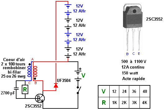 Il est possible de tirer des quantités substantielles d'énergie à partir de l'environnement local et utiliser cette énergie pour recharger les batteries. Non seulement cela, mais quand cette méthode de charge est utilisé, les batteries progressivement se conditionnés à cette forme d'énergie non conventionnelles et de leur capacité à faire le travail augmente. En outre, environ 50% des batteries de véhicules abandonnés comme étant incapables de tenir leur charge plus longtemps, va répondre à ce type de charge et de relancer pleinement. Cela signifie que la banque de la batterie peut être créé à très faible coût. Cependant, alors que cet angle économique est très attrayant, l'utilisation de batteries pour toute demande d'accueil importante est tout simplement pas pratique. Si vous configurez un nouveau compte bancaire et dépôt de £1000 en elle, et quand vous revenez de vérifier sur elle quelques jours plus tard, vous découvrirez qu'il ya seulement £500 en elle. Vous demandez à la banque de vérifier cette erreur et ils vous informer qu'il n'y a pas d'erreur, toutes les banques reviennent seulement la moitié de ce qui est déposé dans un compte. Que penseriez-vous de cela? Mais, qui est exactement ce qu'est une batterie au plomb fait pour vous - il ne retourne la moitié du courant qui vous nourrissez en elle lors de la charge. En d'autres termes, vous perdez la moitié de la puissance que vous introduisez dans une batterie de voiture. NiCd et les batteries NiMh plus populaires reviennent deux tiers de ce qui est alimenté en eux. Condensateurs et les banques de super-condensateurs sont efficaces à 100% et ne perdent rien que contrairement aux batteries, elles ne sont pas un procédé chimique. Les coûts principaux de courir une maison sont ceci de chauffer/rafraîchir les lieux et opérer le matériel comme une machine à laver. Ces articles ont une capacité de la charge minimum de seulement plus de 2 kW. Il ne fait aucune différence à l'exigence du pouvoir si vous utilisez un 12 volt, 24 volt ou banque de la batterie de 48 volts. Peu importe quel arrangement est choisi, le nombre de batteries eu besoin de fournir toute exigence du pouvoir donné est le même. Les plus hautes banques du voltage peuvent avoir le plus petit diamètre qui installe comme le courant est inférieur, mais l'exigence du pouvoir reste le même. Donc, fournir une charge du 2 kW le pouvoir, exige un courant total de batteries de 12 volts de 2000 / 12 = 167 ampères. Les utilisant 80 batteries AHr c'est 42 batteries. Malheureusement, les circuits du chargement ont décrit dessous, ne chargera pas une batterie qui propulse une charge. Cela veut dire que pour une exigence comme chauffage qui est un jour et exigence de la nuit là a besoin d'être deux de ceux-ci banques de la batterie qui nous emmènent à 84 batteries. C'est pour un 2 kW charger minime seulement qui moyens qui si cela est utilisé pour chauffer, ce n'est pas possible d'opérer la machine à laver à moins que le chauffage soit éteint. Donc, tenir compte de quelque chargement supplémentaire comme ceci, les portées du compte de la batterie, peut-être, 126. Ignorer le coût, et supposer que vous pouvez trouver quelque façon de surmonter le problème acide, le volume physique absolu de ce nombre de batteries n'est pas juste réaliste pour installation domestique et usage. Dans passer, vous auriez besoin aussi de deux inverters avec un 2.5 kW qui opère la capacité Cela apporte la valeur d'appareils à maison comme le Shenhe Wang 5 kW générateur du moteur de l'aimant permanent qui est compact et n'exige pas qu'aucun combustible ou batteries opèrent. Cependant, les battu charger des systèmes est important comme ils nous montrent des traits du champ d'énergie local et comment le tapoter. John Bedini a conçu une série entière de circuits du pulsation - générateur, tout ont basé sur le 1:1 composant de la bobine du starter multi - rivage divulgué dans ses USA 6,545,444 brevetés. ![]() Le Système Échangeant de Roger Andrews. L'arrangement échangeant très net utilisé par John est montré en détail dans les plus premiers Etats-Unis brevetés 3,783,550 publié en 1974 où le même pouls d'électro-aimant promouvant déclenché d'aimant est utilisé au pouvoir une série entière de mouvements. Un d'entre ceux-ci est deux toupies magnétiques faites pour tourner dans un plat peu profond : ![]() Quand les toupies tournent vite, ils montent en haut la base descendant en pente du plat et du tour près du bord extérieur. Quand ils ralentissent ils se retirent vers le centre du plat et cela déclenche la batterie/transistor/électro-aimant introduite dans la base du plat. Le pouls de l'électro-aimant promeut le tour du haut, en l'envoyant appuie la pente. C'est un arrangement très net comme le transistor est de la plupart du temps et encore les deux hauts continuent à tourner. Un autre des systèmes de Roger est montré ici : ![]() Il opère de presque la même façon, avec une roue magnétique roulant à reculons et en avant le long des empreintes courbées. Au point le plus bas, l'électro-aimant est déclenché par le voltage incité dans certains des tours du rouleau, en branchant le transistor et en promouvant le rouleau magnétique sur c'est la voie. Un Autre artifice Andrews est le pendule où l'aimant passager du pendule déclenche un pouls promouvant du solénoïde, en gardant le balancement de pendule. John Bedini a aussi utilisé ce mécanisme d'une batterie circulée le système chargeant et Veljko Milkovic ont démontré que le pouvoir mécanique substantiel peut être extrait d'un levier qui est actionné par un pendule. ![]() Andrews montre aussi un arrangement échangeant sur un moteur. Ce design est essentiellement le même comme utilisé par John Bedini dans beaucoup de ses systèmes circulant : ![]() Ici, comme l'aimant de rotor passe l'électro-aimant courbé dans la base, il allume le