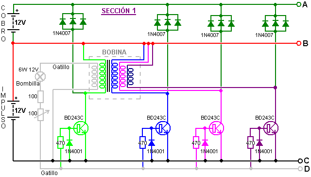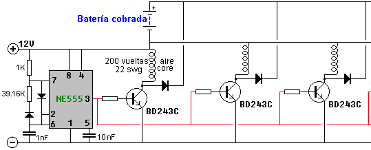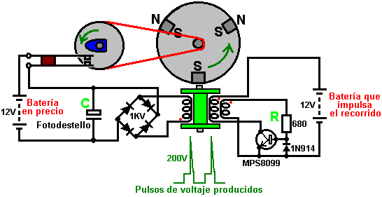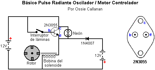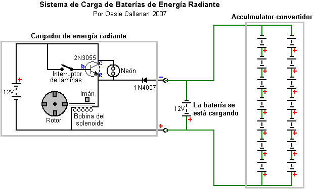 Un punto importante para entender es que los iones en los platos de primacía de la batería tienen la inercia muy mayor que los electrones hacen (varias cientos mil veces de hecho). Por consiguiente, si un electrón y un Ion son de repente ambos dado un empujón idéntico, el electrón logrará el movimiento rápido muy más rápidamente que el Ion quiere. Es supuesto que la corriente del electrón externa está en la fase con el Ion actual en los platos de la batería, pero esta necesidad no es para que. John Bedini deliberadamente las hazañas la diferencia de velocidad adquirida aplicando un muy grandemente el potencial creciente a los platos de la batería. En el primer momento, esto causa los electrones para amontonar a en los platos mientras ellos están esperando por los iones muy más pesados para conseguir mover. Este montón a de empujones de los electrones el voltaje en el término de la batería para subir a tanto como 100 voltios. Esto a su vez, causa la energía para fluir atrás fuera en el circuito así como en la batería, dando simultáneamente, poder del circuito y " los niveles serios de batería cobrar. Esto encima del potencial también causa mucho aumentó el flujo de poder del ambiente en el circuito, dando ambos al poder aumentado por manejar el circuito externo y por aumentar la proporción de cargo de la batería. La batería la mitad del circuito está fuera ahora 180 grados de fase con la la mitad circuito-impulsando del circuito. Es importante entender que la energía circuito-tendencia y la energía batería-cobrando no vengan de los pulsos afilados aplicados a la batería. En cambio, la energía adicional fluye en del ambiente, activado por los pulsos generados por el circuito de Bedini. En otros términos, el Bedini pulsa el acto como una palmadita en la fuente de energía externa y no se es la fuente del poder extra. Si el circuito de Bedini se ajusta correctamente, el pulso está apagado cortado muy agudamente sólo antes del entrada de energía taladrado está a punto de acabar. Esto tiene un efecto más allá reforzando debido a la Lenz ley reacción que causa una ola de voltaje inducido que puede tomar el encima de-voltaje potencial a tanto como 400 voltios. Esto tiene un efecto extenso en el ambiente local, mientras atrayendo un nivel aun más alto de poder adicional y extendiendo el periodo de tiempo durante que ese flujos de poder de extra en el circuito y " la batería. Esto es por qué el ajuste exacto de un Bedini que pulsa el sistema es tan importante. Sistema de Energía Libre de Ossie Callanan. En 2007, Ossie Callanan publicó un documento que muestra cómo y por qué se estaba COP>1 carga de la batería. Sistema de Ron Pugh compartida amablemente en detalle anteriormente, con ajuste cuidadoso y que se ejecuta en el voltaje de entrada 24 y de salida 24 voltios opera en la COP>10, que es probable que sea debido a la habilidad de Ron en la construcción y ajustando, ambos de los cuales son en efecto muy buena, junto con el uso de muchos transistores que trabajan en paralelo y triplicado diodos de carga para mejorar su rendimiento. El sistema de impulsos-carga John Bedini SSG es muy fácil de construir y funciona muy bien, incluso con muchas baterías sulfatados que han sido desechados como inútiles. Sin embargo, la mayoría de las personas no tendrán COP 1 el rendimiento de su propia SSG construir. Ossie explica por qué esto está en la sección siguiente, que es su autor. Él dice: Creo que yo puedo tener este sistema de energía radiante elaborado hasta el punto donde cualquier persona puede construir y cuando construyes todo, puede proporcionarle con energía libre y continua. Hay dos lados al circuito y sólo tener ambos lados no es bueno, debe tener ambas cosas. Un lado es el lado del cargador del pulso, y el otro es el lado de la batería y convertidor de acumulador. En la actualidad, yo estoy cobrando las baterías a un nivel de ejecución entre COP=2 y COP=10 y batería de intercambio no es un problema. Primero necesitamos centrarnos en el lado del cargador del sistema. Básicamente, usted debe construir un cargador que produce grandes cantidades de energía radiante en forma de pulsos radiantes. Pulsos de energía radiante son pulsos de Contratensión siempre que tienen bordes aumento muy rápidos y una caída de bordes y ocurren a altas frecuencias. No son transitorios de transistor o transitorios de conmutación! Un boquete de chispa produce pulsos de energía clásica. Son eventos caóticos pero sin embargo son eventos de energía radiante. Una bobina de conmutación en muy rápidamente usando un transistor producirá un pulso de energía radiante de FCEM de la bobina, pero un impulso por sí solo no es bueno. Necesita miles o mejor aún, millones de los impulsos para que puedan ser de alguna utilidad práctica. Motor de muchacha de la escuela de Inglés de John Bedini (la "SGE") sólo produce una muy pequeña cantidad de energía radiante cuando tienes la base del transistor afinado para que obtenga al mayor ser oscilante tren de pulso por paso de imán. No es muy eficiente como el diodo base de sujeción desperdicia esta energía, pasando por el circuito de la base del bulbo de resistencia pero ese circuito es necesario para que pueda sincronizar la operación y proporcionar una fuerza impulsora para el imán de la muerte. Sin el diodo base de sujeción, usted consigue un oscilador y el motor no gira - Atrapar 22. Pero aún así, incluso cuando se sintoniza con el diodo base de sujeción en el lugar, el tren de pulso auto-oscilante es generalmente menos pulsos de 3 a 6 que no es mucho y por lo tanto, se produce poca energía radiante. Para todas aquellas personas tratando de afinar el motor para solamente un pulso por el paso de imán, están perdiendo su tiempo y sólo construir un motor de impulsos y no un generador de energía radiante. La SGE no es un generador de energía radiante muy potente o muy buena y además de ser