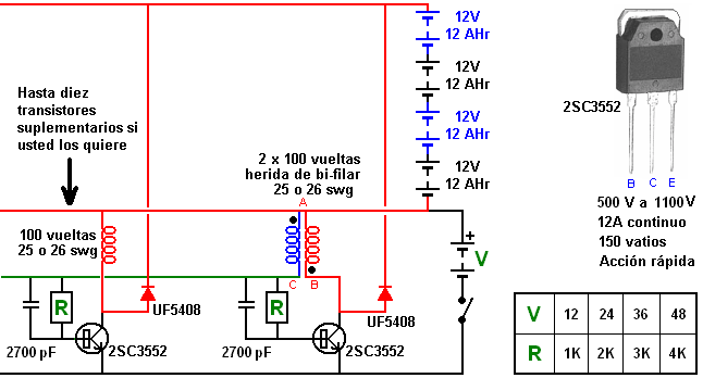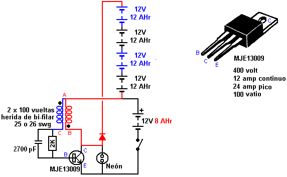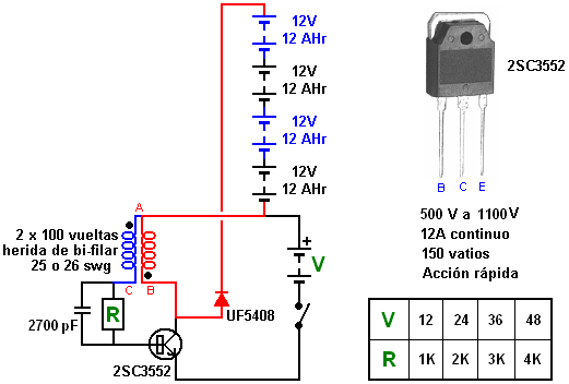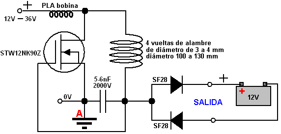 En la aplicación de mi invención, I nivel de un pedazo de tierra de superficie suficiente para contener la cadena de generación o cadenas. Por ejemplo, durante trescientos elementos positivos cada 500 mm de largo y 50 mm de diámetro, doblados como se muestra en la Fig.3, la longitud de la pieza de suelo debe ser de aproximadamente 32 metros y 1 metro de ancho. Cavo 43 hoyos a una distancia de 735 mm de distancia (centro a centro) en una línea. Cada hoyo es de 250 mm de ancho y 750 mm de largo y la profundidad suficiente para contener los siete pares de electrodos. El suelo excavado suelta de los agujeros, se mezcla con la sal o el ácido elegido con el fin de hacer que el generador activo. Por ejemplo, si el suelo es un molde vegetal, entonces ácido nítrico concentrado comercial debe ser añadido en cantidad suficiente para saturar el suelo, y peróxido de manganeso o pirolusita se debe mezclar con la masa. Si el suelo tiene un carácter de arena, a continuación, ácido clorhídrico o carbonato de sodio ("soda de lavado") o potasa puede ser utilizado. Si la bobina es una arcilla, a continuación, pueden usarse ácido clorhídrico o sulfúrico y cloruro de sodio, la sal se disuelve en agua y se vierte en el agujero antes de que el ácido se mezcla con el suelo. La parte inferior del orificio se humedece con agua y el suelo preparado mezclado con agua a la consistencia de una pasta espesa se coloca entonces en el agujero, que rodea los electrodos. Los 43 grupos de electrodos cuando conectados en serie como se muestra en la Fig.1, producirá 53,85 voltios y 56 amperios, el desarrollo de un total de 3.015 vatios. ![]() Al aumentar el número de células, la capacidad del generador se puede aumentar correspondientemente a cualquier salida de potencia deseado. El cuerpo preparado de tierra debe humedecerse periódicamente, preferentemente con el ácido con el que se trata cuando primero preparado para la acción. En un generador destinado para uso continuo, prefiero proporcionar un depósito como se muestra como "A" en la Fig.6, y ejecutar un tubo hecho de un material que no es atacado por el ácido, a lo largo de la cadena de elementos, con una boquilla sobre cada elemento de modo que todos ellos pueden ser humedecidos muy fácilmente. Cualquier acumulación de óxidos u otros productos de la reacción entre el suelo preparado y los electrodos se puede eliminar por elevar el electrodo positivo y luego forzando nuevo en su sitio de nuevo. El electrodo de carbono puede ser limpiado con sólo girar sin separarlo de su lugar. Encuentro que el período de uso del generador durante el cual no se necesita ninguna adición de sal o ácido, aumenta con el período de uso. Por ejemplo, durante el primer día de uso, el ácido o la sal deben añadirse después de 10 horas de uso, después de lo cual un rendimiento del 26 horas de servicio, y luego después de otro humedeciéndolo funcionará durante 48 horas, y así sucesivamente, progresivamente aumento en la duración entre ser humedecido. Este generador funciona muy consistente y fiable. Hoy en día, nos encontramos con corriente de la red de tensión alterna para ser el más cómodo de usar. Para que un sistema como éste, estaríamos inclinados a utilizar un inversor ordinario que se ejecuta en doce voltios o veinticuatro voltios. Sin embargo, hay que recordar que la corriente de entrada de trabajo es alta y así, el cable utilizado para llevar a que las necesidades actuales para ser gruesa. En 12V, cada kilovatio es una corriente de al menos 84 amperios. En 24V que la corriente es de 42 amperios (el propio inversor es más caro como se compran menos). Destino doméstico considerable se puede tener de un inversor de 1500 vatios. La construcción de hierro / carbono suave descrito por Michael Emme produce 54V de 43 conjuntos de electrodos, lo que indica alrededor de 1.25V por juego en alta corriente. Parece razonablemente probable que diez u once conjuntos de electrodos darían alrededor de 12V en corriente alta y tres de esas cadenas conectadas en paralelo debe ser capaz de alimentar un inversor 12V 1500 vatios continuamente a un costo extremadamente bajo en ejecución. Un Cargador de Batería Para Una Sola Batería Johan Booysen de Sudáfrica utiliza circuitos electrolizador desarrollado por Bob Boyce de América, para cargar una batería. Lo importante es que sólo había una batería involucrados ya que la batería está cargando realmente alimenta el circuito de carga. La batería involucrado era un 18 Amp-horas de la batería de plomo-ácido de 12 voltios que por lo tanto tiene una eficiencia de sólo el 50%, lo que significa que la batería tiene que recibir el doble de la cantidad de corriente en comparación con la corriente que se puede volver después. Johan utiliza la batería para alimentar un coche de juguete que su hija jugaba con. Denunció que durante la noche de la batería para que pudiera usarlo al día siguiente para conducir. ![]() Mientras que la velocidad máxima del coche es sólo dos o tres millas por hora, el punto importante es que los bienes, la energía genuina se está poniendo en la batería todas las noches, la energía que impulsa el coche de juguete cada día. Un dispositivo de este tipo, que puede cargar una batería sin luz solar, sin necesidad de viento y sin necesidad de combustible, tiene importantes aplicaciones para las personas que viven en zonas remotas donde no hay red eléctrica y nunca lo será, ya que no es económica para ejecutar las líneas de energía allí. La pregunta es: ¿se puede hacer un dispositivo de este tipo que sea fiable y seguro de usar? Exención de responsabilidad: La siguiente información NO ES para principiantes, pero está únicamente destinado a personas con experiencia en electrónica y que son conscientes de los peligros que conlleva. Por favor, comprenda claramente que NO ESTOY recomendando que se debe construir cualquier cosa en base a la siguiente información.. En 