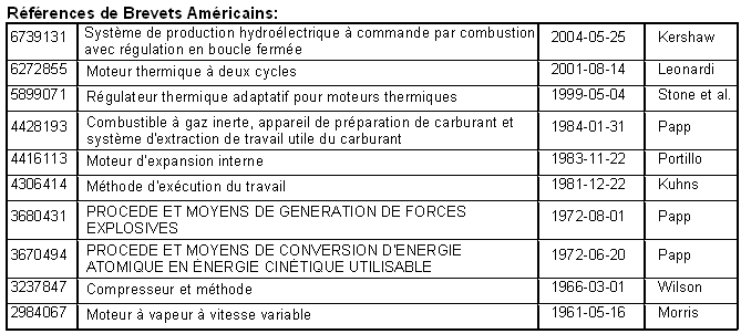 Le site Internet du PlasmaERG est ici mais il a besoin de l'Explorateur Internet pour afficher correctement comme il a des problèmes d'étalage importants quand Firefox est utilisé. Le 2011/0113772 A1 américain breveté d'application de John Rohner appelé “le Moteur de Processus de Transition de Plasmic” peut être téléchargé de www.freepatentsonline.com ou de www.free-energy-info.tuks.nl. Il montre un moteur de 2 cylindres comme un exemple de l'opération: ![]() Le Moteur de Robert Britt. a conçu un moteur très semblable à cela de Josef Papp, et un brevet Américain pour un moteur qui opère sur gasses inerte a aussi été accordé à lui. William remarques Lyne que ce dessin du moteur peut être reproduit utiliser un Chevy “Monza” moteur de 6 cylindres ou un VolksWagen moteur de 4 cylindres. Les têtes sont enlevées et les nouvelles têtes se sont dépouillées utiliser le “métal du pot” usagé pour “faux chrome” coupe automobile. Cet alliage contient l'aluminium, étamez, zinc et peut-être antimoine et est particulièrement convenable comme les entrailles des cavités peut être poli au haut reflectivity spécifié dans les brevets. Une copie pleine du brevet de Robert Britt les USA 3,977,191 sont dans l'Appendice. Le Moteur à Air Plasma de Heinrich Klostermann. Les deux Josef Papp et Robert Britt spécifié gaz inerte pour l'exploitation, mais Heinrich Klostermann souligne que l'air ordinaire est tout à fait suffisant. Sa vidéo se trouve à l'adresse ici à ce moment. Son brevet est : Abstrait: Moteur et générateur à explosion interne ayant une chambre d'explosion, un élément mobile formant une paroi de la chambre, une charge de gaz non combustible scellée à l'intérieur de la chambre, des moyens pour allumer de façon répétée le gaz d'une manière explosive pour entraîner l'élément mobile à partir d'un Position du volume minimum à une position de volume maximal, des moyens pour ramener l'élément mobile de la position de volume maximal à la position de volume minimum, et des moyens couplés à l'élément mobile pour fournir de l'énergie électrique en réponse à l'explosion du gaz. Dans un mode de réalisation divulgué, l'élément mobile est un piston relié à un vilebrequin, et il est ramené à la position de volume minimum par un volant sur le vilebrequin. Dans un autre mode de réalisation, deux pistons sont reliés dos à dos dans une chambre hermétiquement fermée pour empêcher la perte du gaz explosif. Dans un mode de réalisation, l'énergie électrique est produite par un générateur connecté au vilebrequin, et dans l'autre il est produit par une bobine positionnée à proximité d'un aimant qui se déplace avec les pistons. ![]() Autres Références : Mallove et al., Infinite Energy, Sept./Oct. 2003, vol. 9, No 51, New Energy Foundation, Inc., Concord, NH, USA. La Description : CONTEXTE DE L'INVENTION 1.Domaine d'invention La présente invention concerne généralement des moteurs et des générateurs et, plus particulièrement, un moteur à explosion interne et un générateur utilisant des gaz non combustibles. 2. Art Connexe Un moteur à explosion interne est généralement semblable en principe à un moteur à combustion interne, sauf qu'il utilise des gaz non combustibles tels que l'air, l'oxygène, l'azote ou le gaz inerte au lieu des gaz combustibles utilisés dans les moteurs à combustion interne. Avant le fonctionnement, le gaz pour faire fonctionner un moteur à explosion interne est placé dans la chambre d'explosion du moteur et la chambre est scellée. Pendant le fonctionnement, le gaz dans la chambre d'explosion est comprimé à plusieurs reprises, ionisé, explosivement expansé et contracté pour déplacer un piston ou un rotor ou un autre dispositif mobile pour convertir l'énergie cinétique en énergie mécanique ou électrique. Une fois que le gaz a été chargé dans la chambre d'explosion, le moteur peut fonctionner pendant de longues périodes de temps sans carburant supplémentaire. Il n'y a pas besoin de consommation de carburant à chaque cycle de fonctionnement, comme dans un moteur à combustion interne, et il n'y a pas d'échappement. Des exemples de moteurs à explosion interne de l'art antérieur sont trouvés dans le brevet des Etats-3,670,494 et 4,428,193. OBJETS ET RÉSUMÉ DE L'INVENTION En général, un objet de l'invention est de fournir un moteur et un générateur d'explosion internes nouveaux et améliorés. Un autre but de l'invention est de fournir un moteur à explosion interne et un générateur du caractère ci-dessus qui surmonte les limitations et les inconvénients des moteurs et des générateurs qui ont été fournis jusqu'ici. Ces objets et d'autres objets sont atteints conformément à l'invention en fournissant un moteur à explosion interne et un générateur qui a une chambre d'explosion, un élément mobile formant une paroi de la chambre, une charge de gaz non explosif scellée à l'intérieur de la chambre, Enflammer le gaz d'une manière explosive pour entraîner l'élément mobile d'une position de volume minimum à une position de volume maximal, des moyens pour ramener l'élément mobile de la position de volume maximal à la position de volume minimum et des moyens couplés à l'élément mobile Pour fournir de l'énergie électrique en réponse à une explosion du gaz. Dans un mode de réalisation divulgué, l'élément mobile est un piston relié à un vilebrequin, et il est ramené à la position de volume minimum par un volant sur le vilebrequin. Dans un autre, deux pistons sont reliés dos à dos dans une chambre hermétiquement fermée pour empêcher la perte du gaz explosif. Dans un mode de réalisation, l'énergie électrique est produite par un générateur connecté au vilebrequin, et dans l'autre il est produit par une bobine positionnée à proximité d'un aimant qui se déplace avec les pistons. DESCRIPTION BRÈVE DES DESSINS ![]() La figu