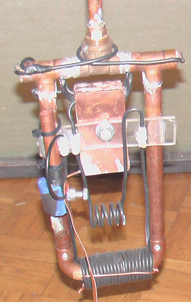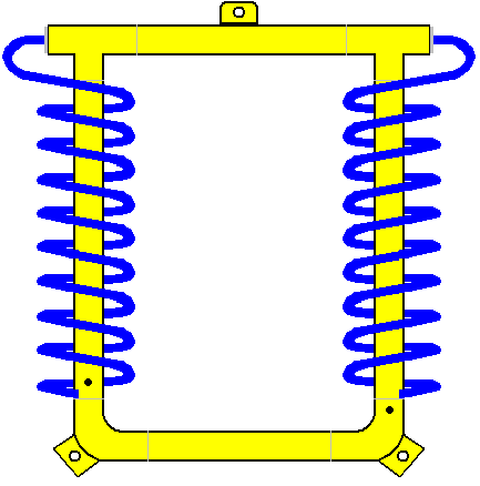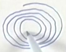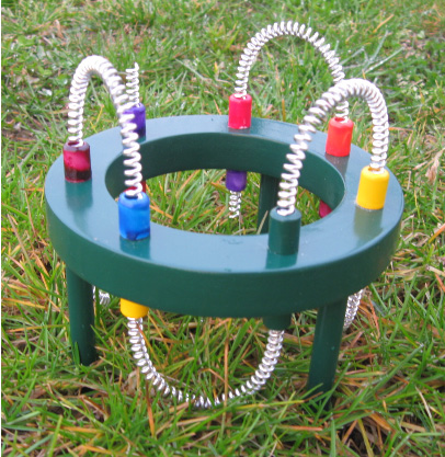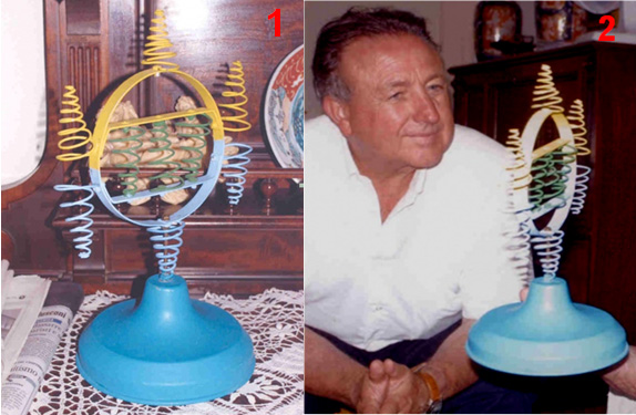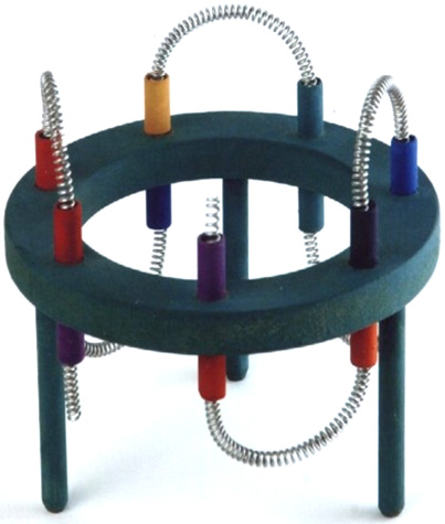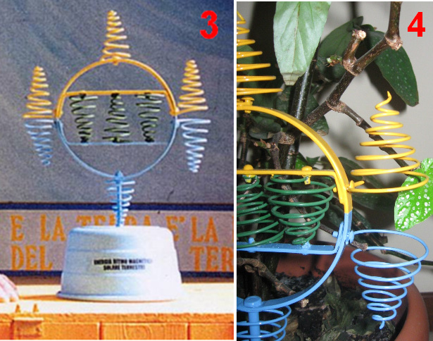 Or like this: ![]() Photographs 1 and 2 show two different views of one build. The nine spiral coils have seven turns and the narrow end is a flat turn. The gap between the yellow and blue spirals is quite large, appearing to be just under the depth of two turns of the spirals. The base is the same shape and the mounting bolt is not painted, the colour suggesting that it might be a brass bolt. The size of the mounting ring can be estimated from the man in photograph 2 and I would put it at 250 mm (10”) as Pier was Italian and so probably used metric units of measurement. I doubt that the dimensions are critical and the spirals appear to be about 100 mm (4”) tall with the widest turn being about 45 mm (1.75”). We are not told what metal was used for any of the construction, but as the second of Pier’s devices to be described here specifies aluminium, it can’t be ruled out here, although the metal does look like painted steel. Both aluminium and copper are generally considered to be non-magnetic because a magnet does not normally attach itself to either of those metals. But, this is highly misleading as both have a major effect when placed in a magnetic field, and the energy flow being channelled by this device of Pier’s is itself affected by magnetic fields, so the use of aluminium is likely to be highly significant. However, that being said, we have no direct information on what is used in this “ERIM” device. You will notice in photographs 1 and 2, that the lugs on the arms of the bars across the circular mounting are quite short, causing their bolts to be widely spaced, which in turn, causes the outer blue and yellow spirals to be widely separated. Those lugs are longer in the build shown in photograph 3, moving the bolts closer together and bringing the blue and yellow spirals closer together. In photograph 3 the long mounting bolt at the bottom of the ring appears to be thicker and it is painted blue. The spirals have the smallest turn flat across the length of the spiral. Photograph 4 shows a third build of the device, with an even thicker supporting bolt painted blue, wider spacing between the blue and yellow spirals and this time, the smallest turn of the spiral turned up axially and filed to a point. It appears that the device is assembled and then painted afterwards although the spirals may be dipped beforehand. Photograph 4 shows how the spirals are secured under the head of a bolt which is screwed into a threaded hole in the circular frame. Photograph 3 seems to suggest that constructional accuracy is not critical with the side spirals not aligned correctly (unless the lower spirals are supposed to point slightly inwards which seems unlikely, especially since the top spiral of photograph 3 is not truly vertical and does not align with the other two yellow spirals. Photograph 4 seems to suggest that the green spirals can be slightly more compact than the others although they have exactly the same number of turns. Every spiral is wound the same way so when viewed from above, the upper spirals move in an counter-clockwise direction as they rise and the lower spirals move in a clockwise direction as they get lower. It might be that the colouring of the components might just be for referencing them, but I do not think that this is so. In the following device, Pier stresses the different colours and considering that different colours radiate different frequencies of light, there may well be significance in the colours. Piers describes the operation in this way: The properties of the device are determined by it’s shape. The three yellow spirals pointing upwards concentrate Solar Energy while the three blue spirals pointing downwards, concentrate Earth’s bio energy which is the negative reflection from the Earth of the Solar Energy. When these two meet, they produce a wave on the green spirals called the Sun-Earth Magnetic Rhythm (which is the rhythm of everything which exists on Earth - both animate and inanimate). This wave enhances that essential basic rhythm for everything within it’s operating radius, normalising and balancing cells and cleansing the energy of a room. Ideally, the device should be placed in the bedroom so that it can act during the night, but it can also be effective almost anywhere. It should be positioned about 10-20 cm away from walls. At the beginning, to accelerate the process of cellular balancing, you can place your hands about 10-15 cm from each side of the device, with your palms turned towards the green spirals and at the same level as they are. The time required will depend upon individual sensitivity If you have hot water central heating, you can place the device about 10 cm from the boiler with the green spirals parallel to it; the circulating water will carry information throughout the system and cleanse rooms within a few days. To energise water and return it to it’s original, natural state, place a bottle of water at each side of the device, about 10-15 cm from the green spirals. It can also energise foodstuffs such as fruits, vegetables and meats by placing them level with, and about 10-15 cm in front of the green spirals, using a non-metallic support, if necessary. Flowers placed close by, will keep fresher longer, or will blossom sooner than normal. The second passive device designed by Pier is what he calls his “Elios” device. It is constructed from a long small-diameter coil of aluminium wire which is snaked backwards and forwards through a circular wooden frame supported on three short wooden legs. The wooden frame is painted as shown here: ![]() The aluminium wire coil is fed through the frame using plastic tubular beads. It is not clear if the beads pass the whole way through the frame with the upper bead meeting the lower bead in the centre of the frame, or if the beads are completely external to the wood, or perhaps partially embedded in the wood. Pier says that the Elios device concentrates the maximum energy 