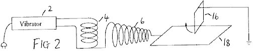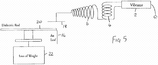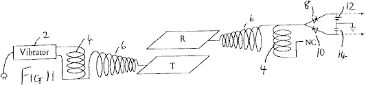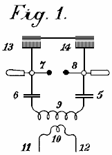 Fig.1 zeigt ein einfaches Schema zur Umwandlung statischer Elektrizität in dynamische Energie von einer hohen Anzahl von Oszillationen. Aus Gründen der Klarheit wird eine Influenzmaschine angenommen, eingesetzt werden und nicht eine terrestrische Antenne. Artikel 13 und 14 sind Kämme zum Sammeln der statischen Elektrizität des Einflusses Maschine. Artikel 7 und 8 sind mit Funkenentladungselektroden. Ziffer 5 und 6 sind Kondensatoren, 9 ist die Primärwicklung einer Induktionsspule 10 ist die Sekundärwicklung, deren Enden 11 und 12. Wenn die Platte des statischen Influenzmaschine durch mechanische Mittel gedreht wird, die Kämme Sammeln der elektrischen Ladungen, eine positiv und eine negativ und diese Ladungs die Kondensatoren 5 und 6, bis eine Hochspannung über der Funkenstrecke 7--8, dass die Funkenstrecke gesprungen entwickelt. Da die Funkenstrecke bildet einen geschlossenen Stromkreis mit den Kondensatoren 5 und 6 und induktiven Widerstand 9, wie gut bekannt ist, werden Wellen von hochfrequenten elektromagnetischen Schwingungen in dieser Schaltung bestehen.