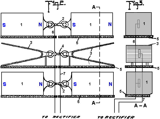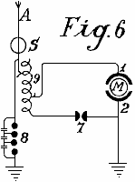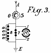 Ein Motor, der mit statischen Ladungen zu betreiben, wird der Einfachheit halber in den Zeichnungen als zwei Halbkreisen 1 und 2 und der Rotor des Motors durch einen Ring M (Fig.3) dargestellt. A ist eine vertikale Antenne oder dem Netzwerk. S ist der Sicherheits Drossel oder Elektromagnet mit Spule O wie ersichtlich mit der Antenne A. Neben dem Elektromagneten S angeschlossen ist, wird das Antennenleiter in drei Stromkreise aufgeteilt, Schaltung 8, die die Sicherheit Funkenstrecke, Schaltung 7, die die Arbeits Funken Lücke und dann eine Schaltung, die die Ständerklemme 1, wobei der Rotor und Stator der Klemme 2 an dem ein Anschluss mit dem Erdungsdraht hergestellt. Die beiden Funkenstrecken sind ebenfalls galvanisch mit dem Schutzleiter verbunden ist. Verfahren zum Arbeiten in dieser Diagramme ist wie folgt::