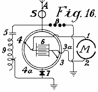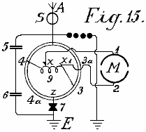 Da dies verhindert, dass die gesamte Schwingungsenergie, die auf das Motor, ist es besser, den in Fig.14 gezeigten Modifikation annehmen. Der einzige Unterschied ist, dass der Motor nicht direkt mit den Segmenten des Kommutators geschaltet, sondern wird zu Sekundärspule 10, der induzierte Strom aus Primärspule 9. Diese Anordnung stellt eine gute Transformationswirkung eine lose Kopplung und ein empfängt verdrahtet Schwingkreis ohne Funkenstrecke.